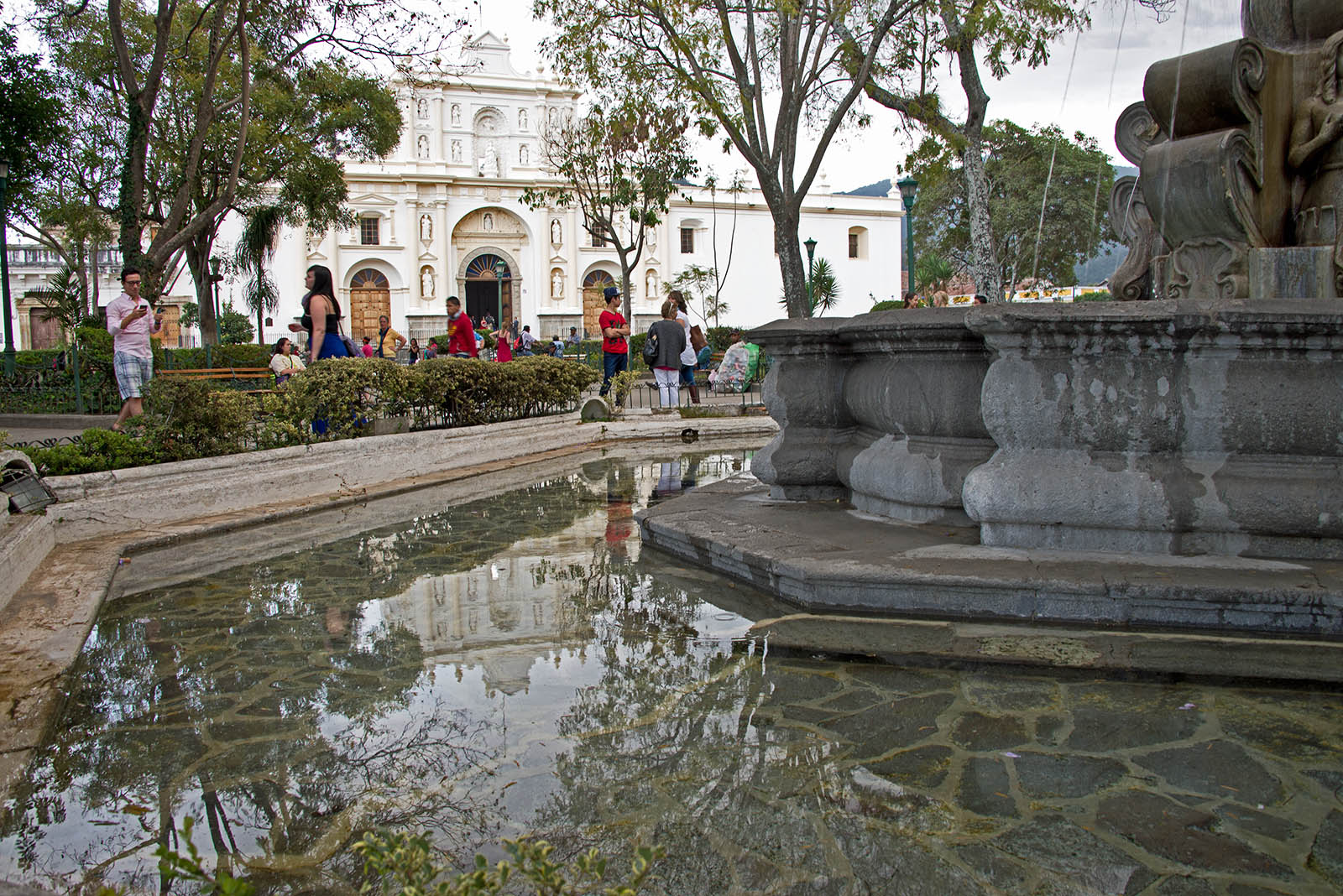 中央広場の噴水の池に映る大聖堂
