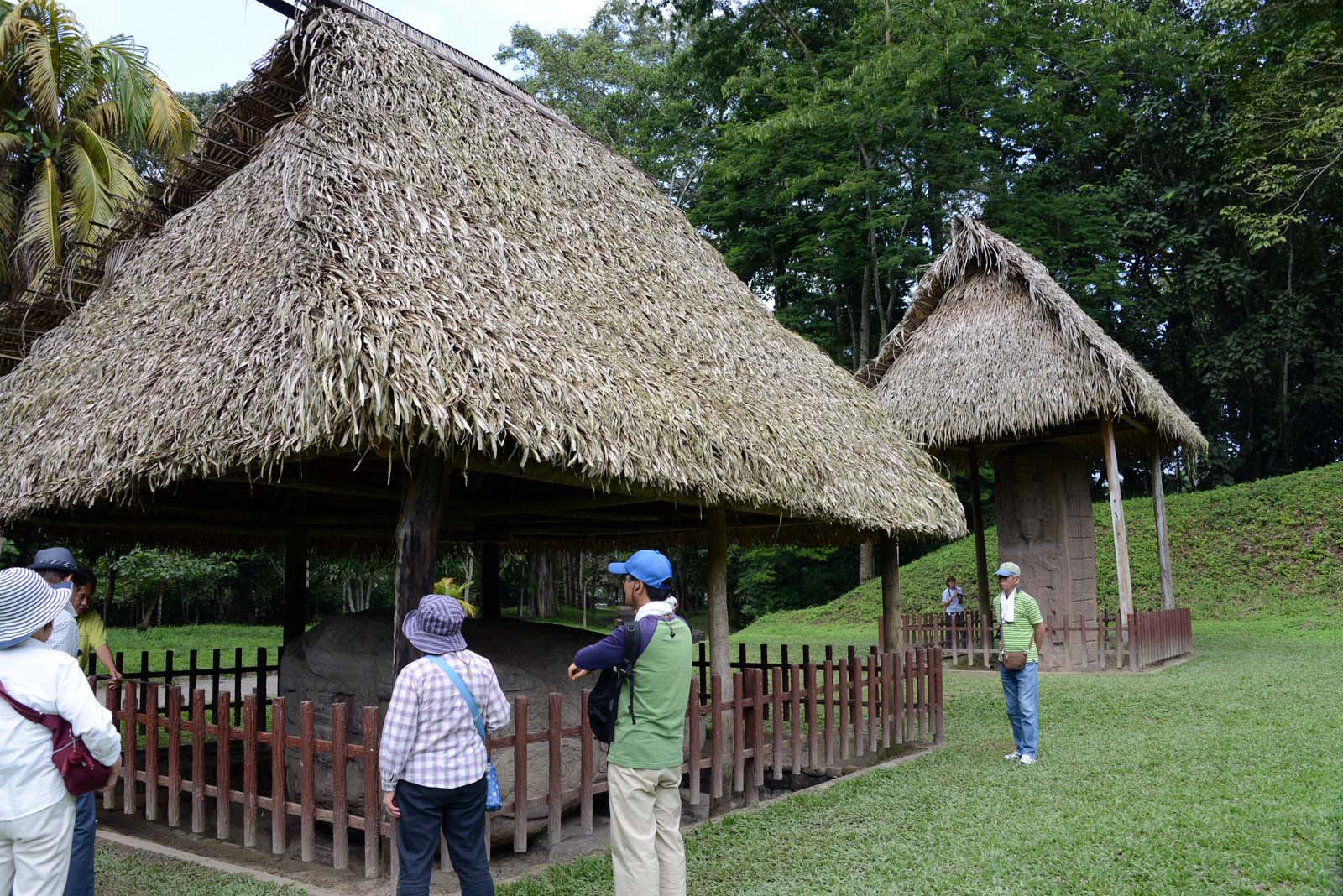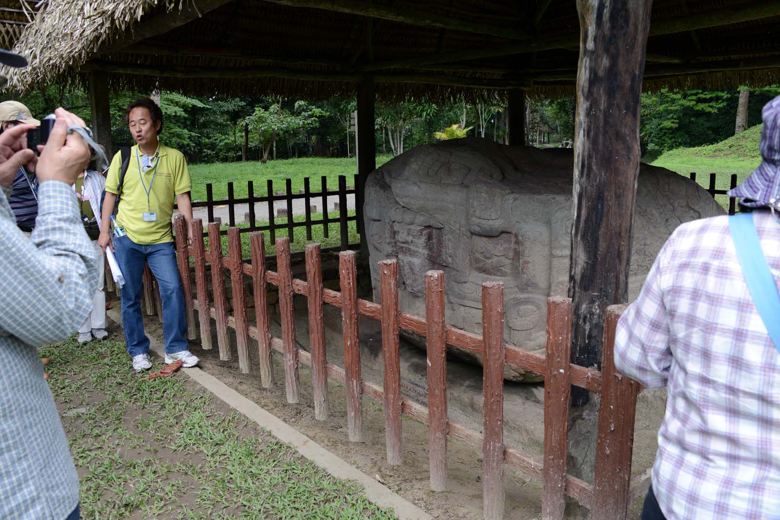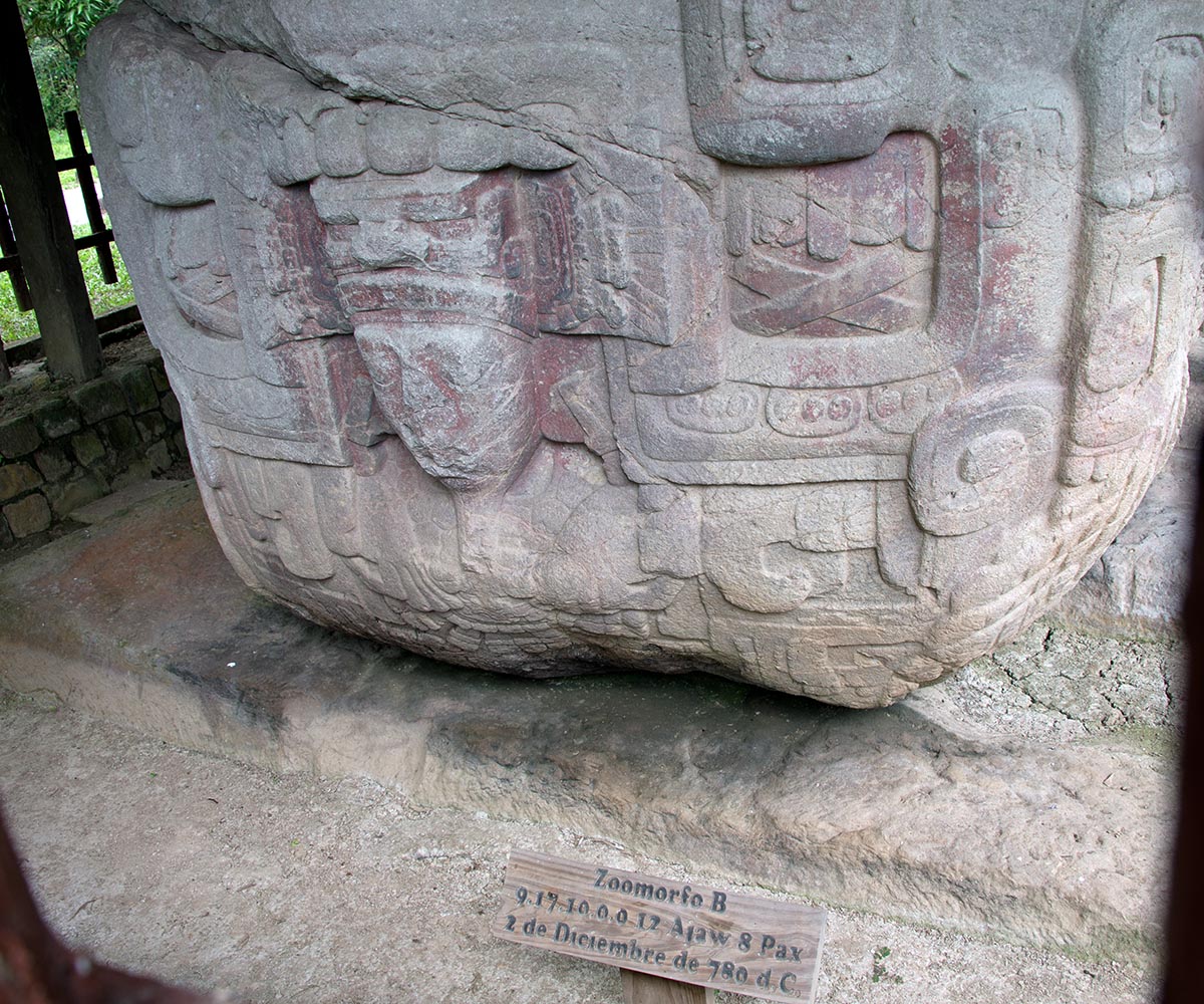 獣形祭壇B 780年に作られたカック・ティリュウの最後の建造物. 長さが3.7m,高さ1.8mの巨大な石彫りです。 南を向いた正面からは王が顔を出し、当時は全体が真っ赤に塗られていたようで, 色が少し残っている。