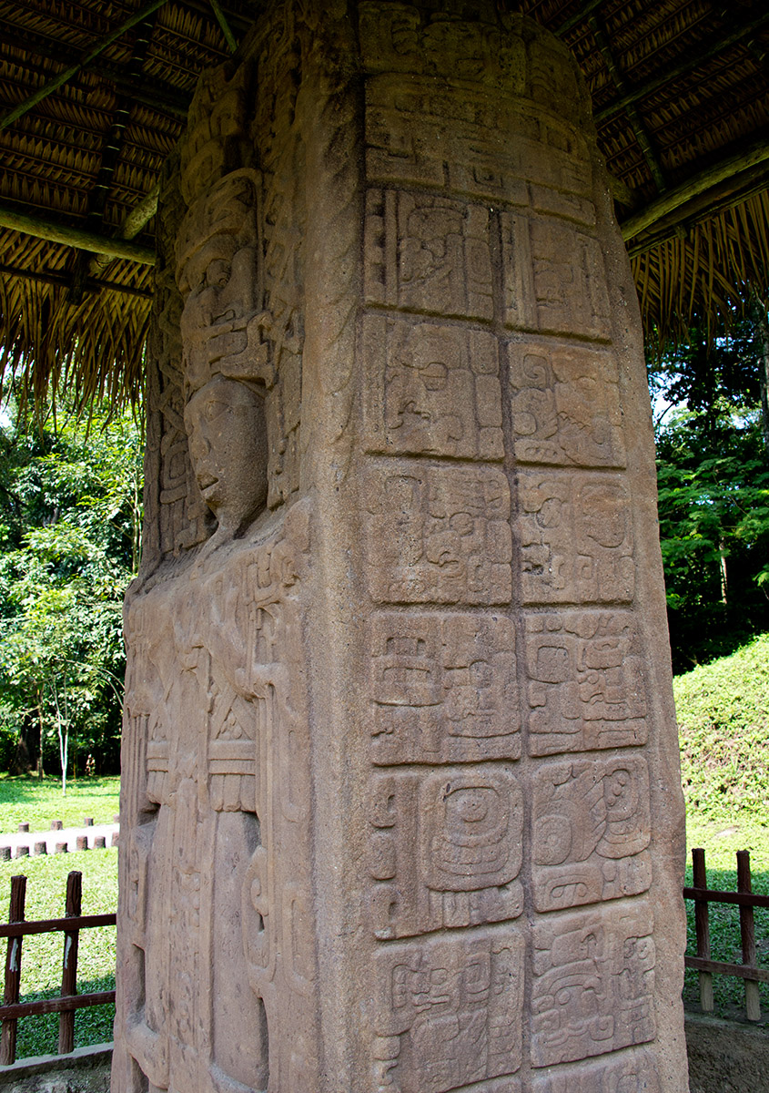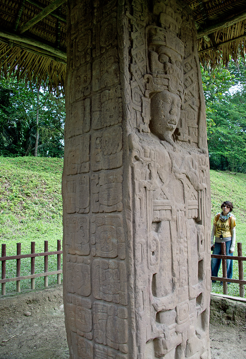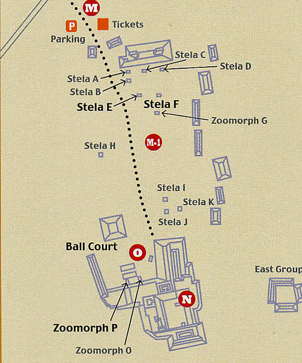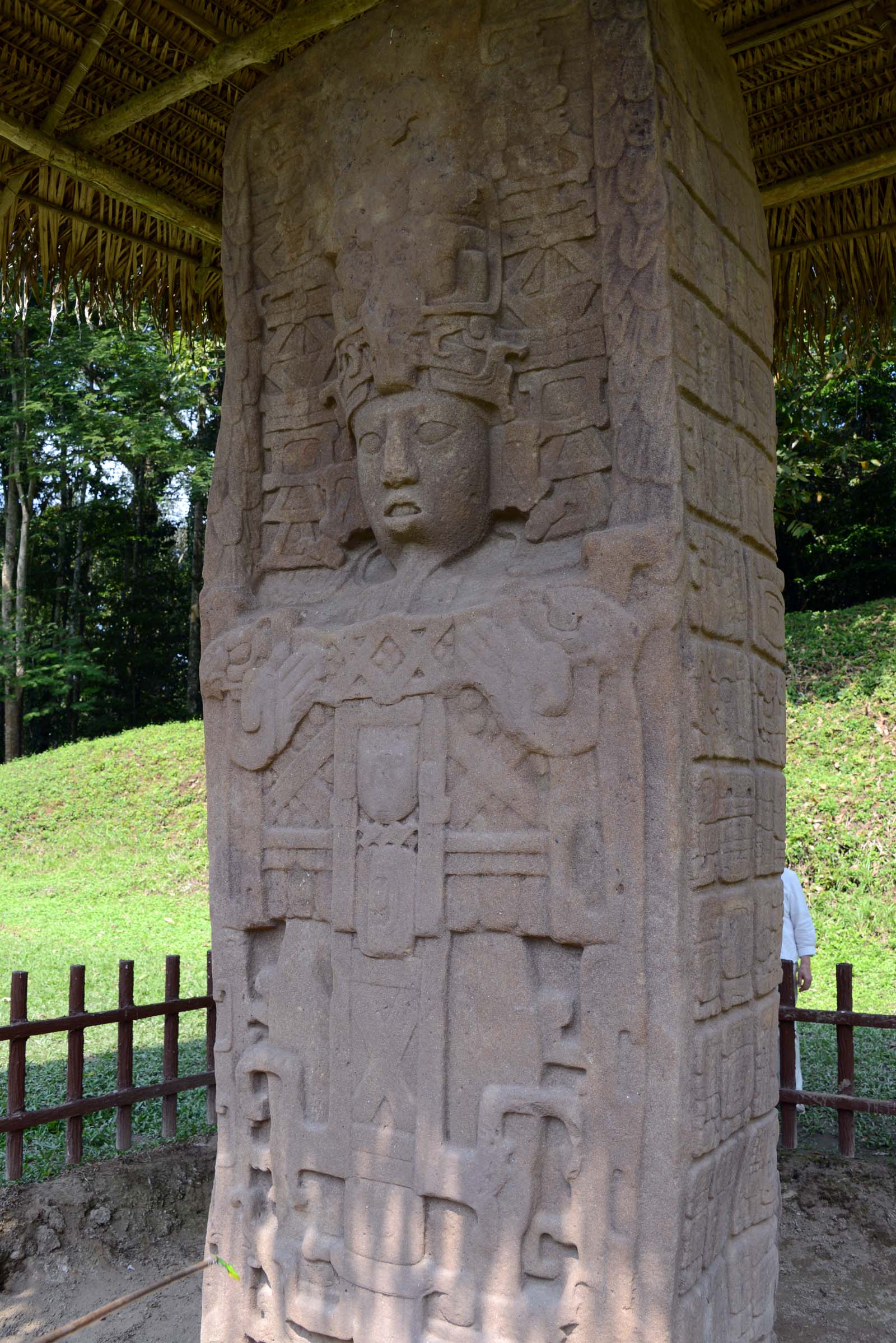 石碑E 771年(9.17.0.0.0.) に建てられ、カック・ティリュウが南北両面に彫られており、高さ7.6m、地下も合わせとると11.7mと最も高い、立派な石碑。