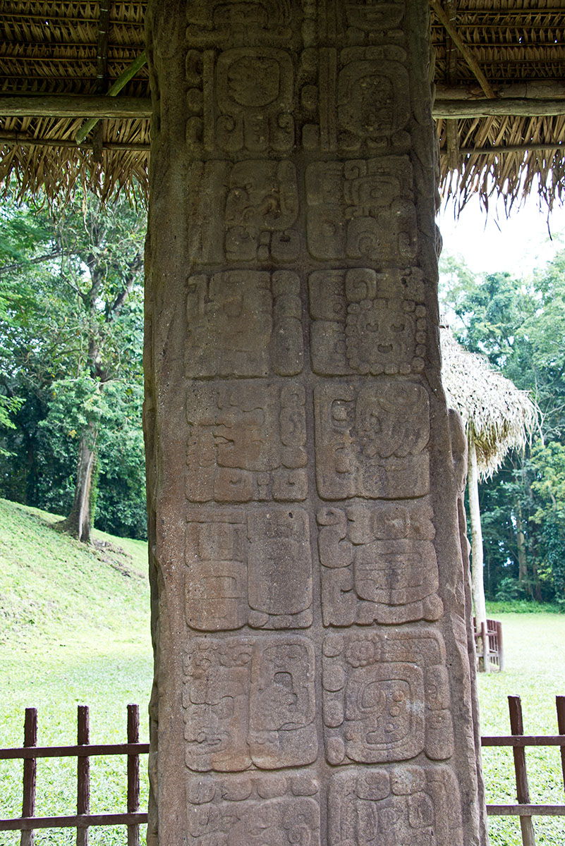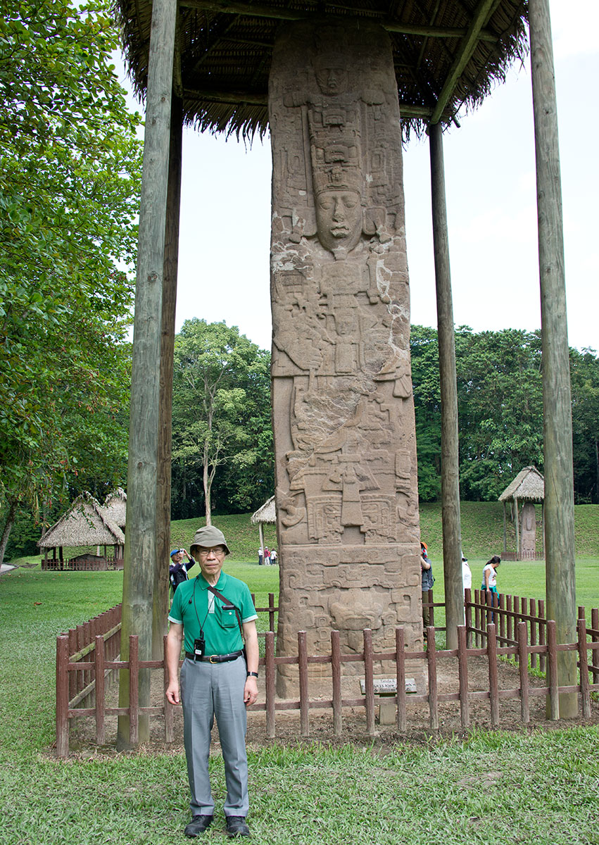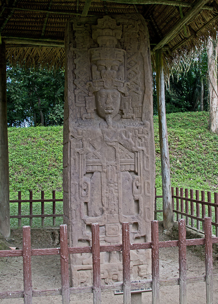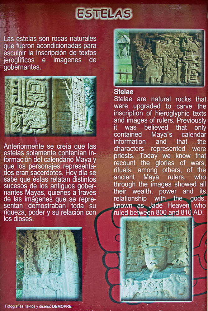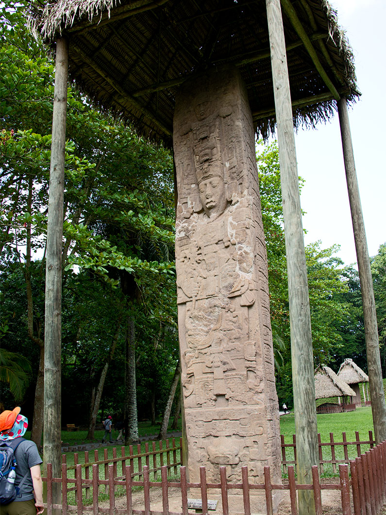 石碑E 771年(9.17.0.0.0.) に建てられ、カック・ティリュウが南北両面に彫られており、高さ7.6m、地下も合わせとると11.7mと最も高い、立派な石碑。