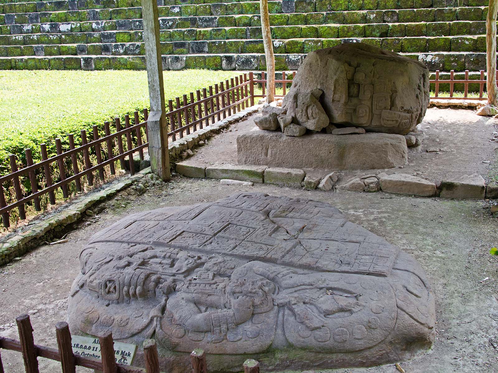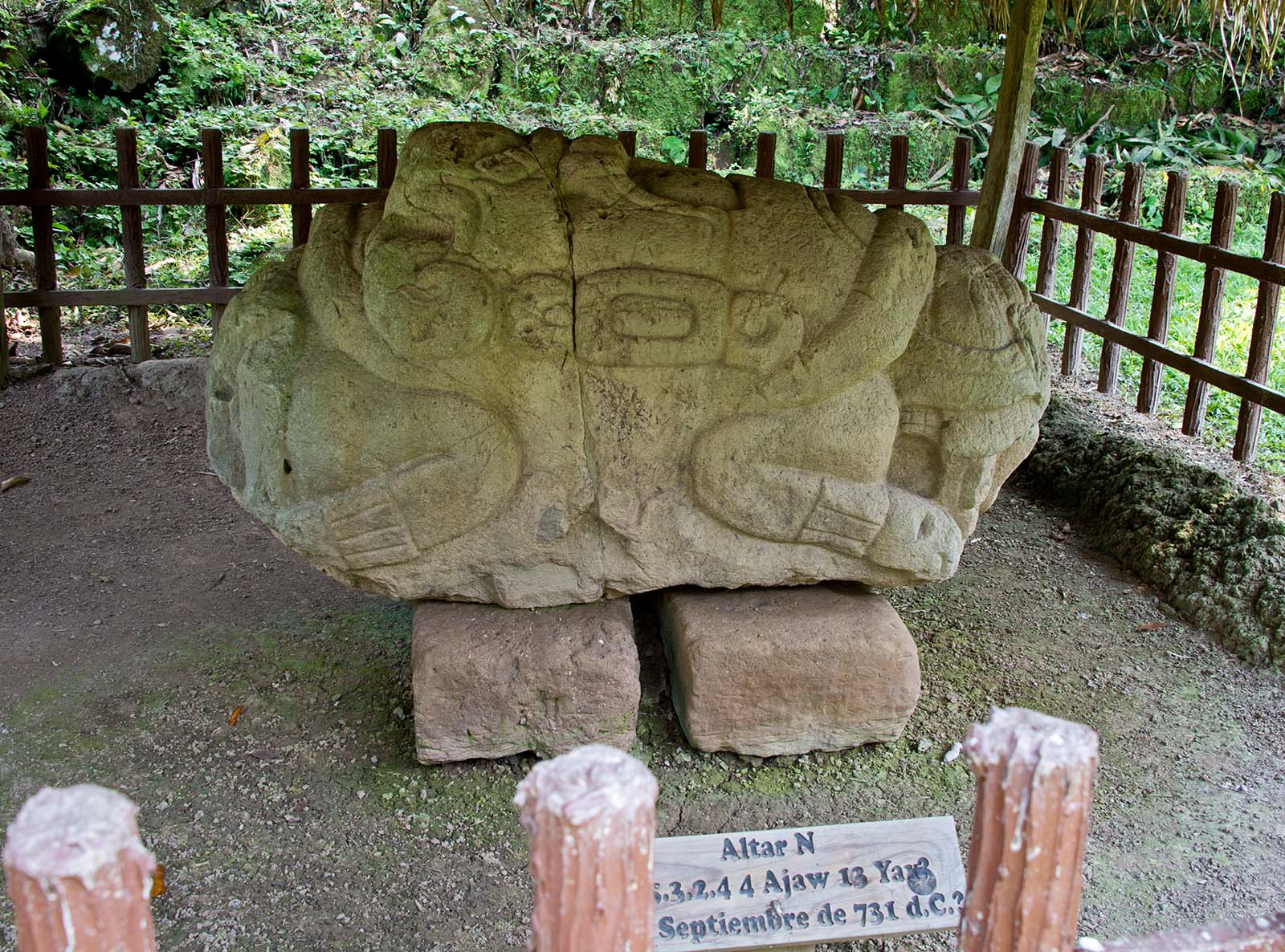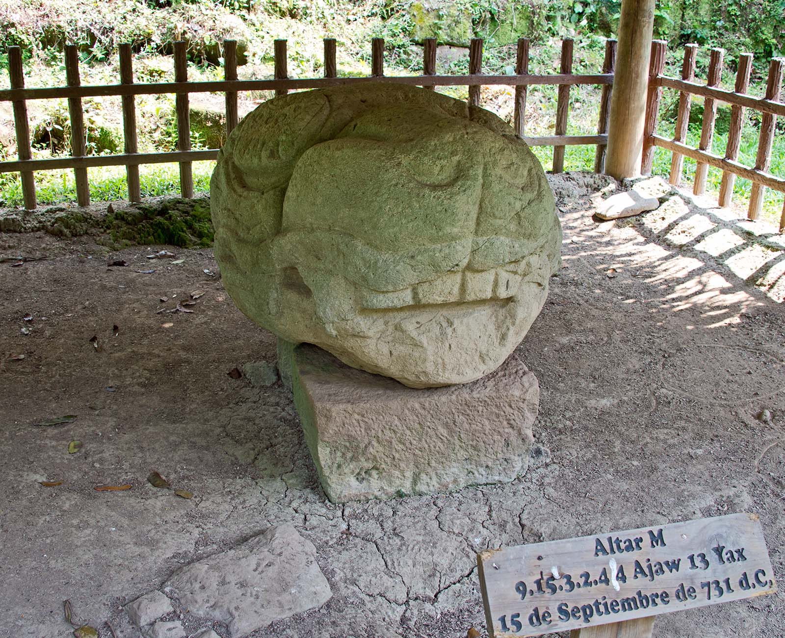 獣形神G カック・ティリュウの顔が彫られ, 石碑EとFを南から見守るような位置に据えられている。カック・ティリュウの死後を継いだシュル・シエロ「空シュル」(785-800年頃)が785年に先王に捧げて建立したもので、マヤの宇宙観で大地を表すとされる亀の形で、先王の魂が亀に宿ったことを示したという説とか、蛙とジャガーを一体化した獣に宿ったという説がある。