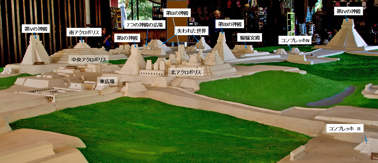ティカル遺跡中心部の模型 (縮尺は全く合っていない、建物の距離は離れている)