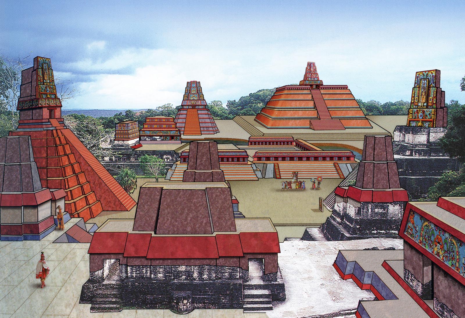 ティカル遺跡中心部の再現図 建造物の多くは赤く塗られていた(写真ガイブック「マヤ人」から)
