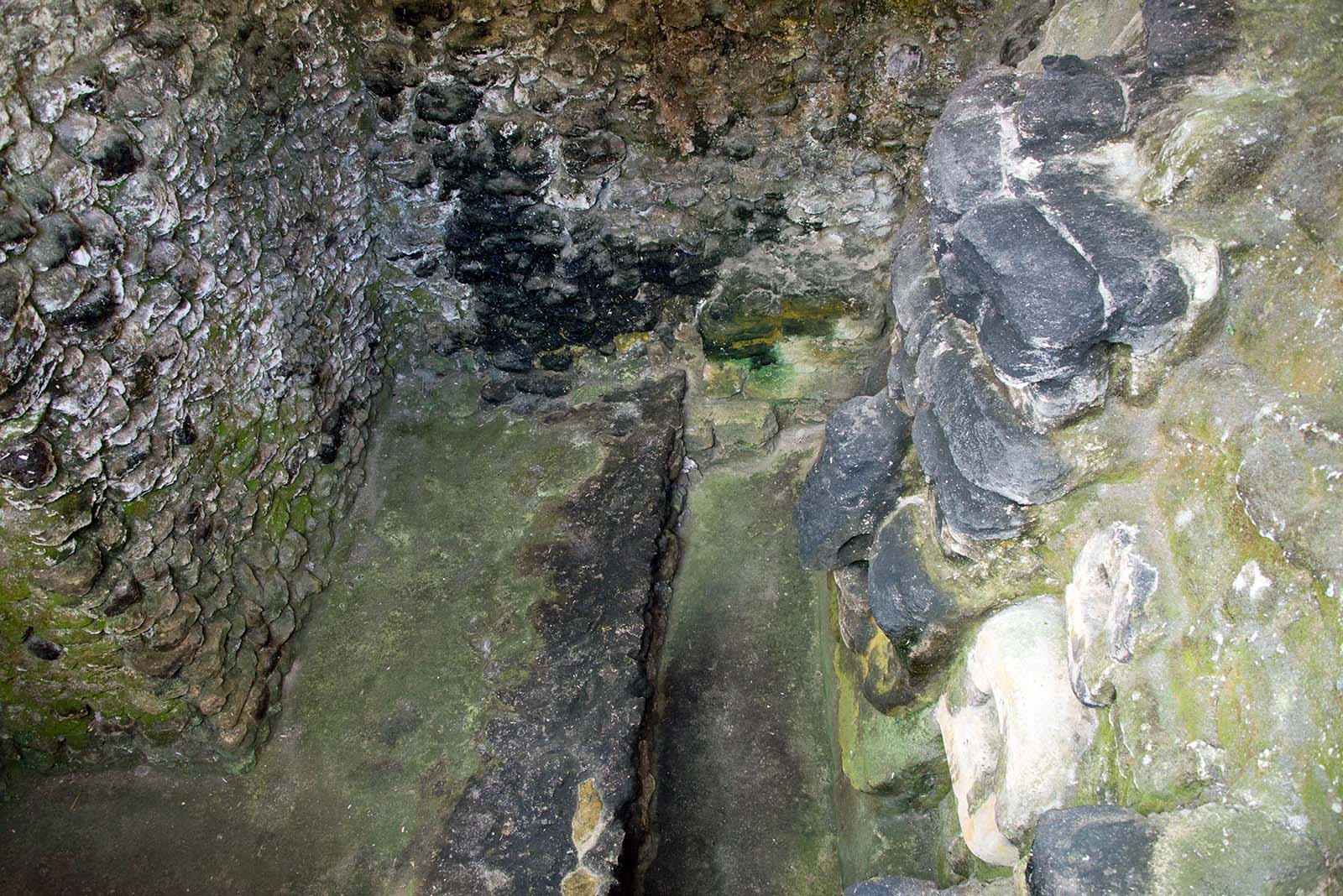 ジャガー神殿頭部 神殿の中にジャガー神がまつられ極彩色の跡かたもなく、一部崩れている。