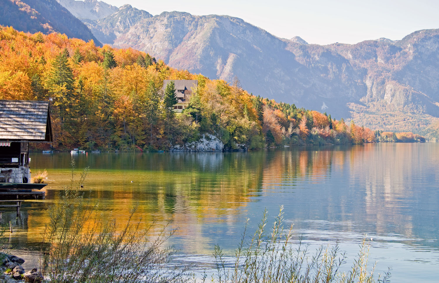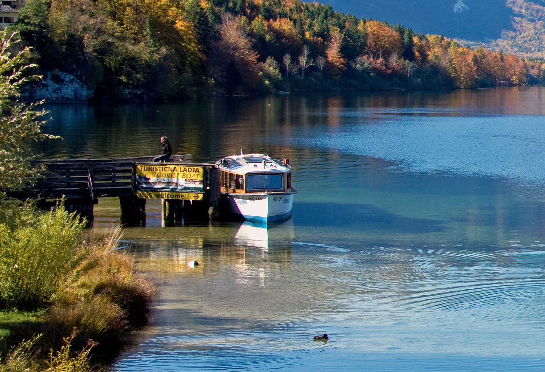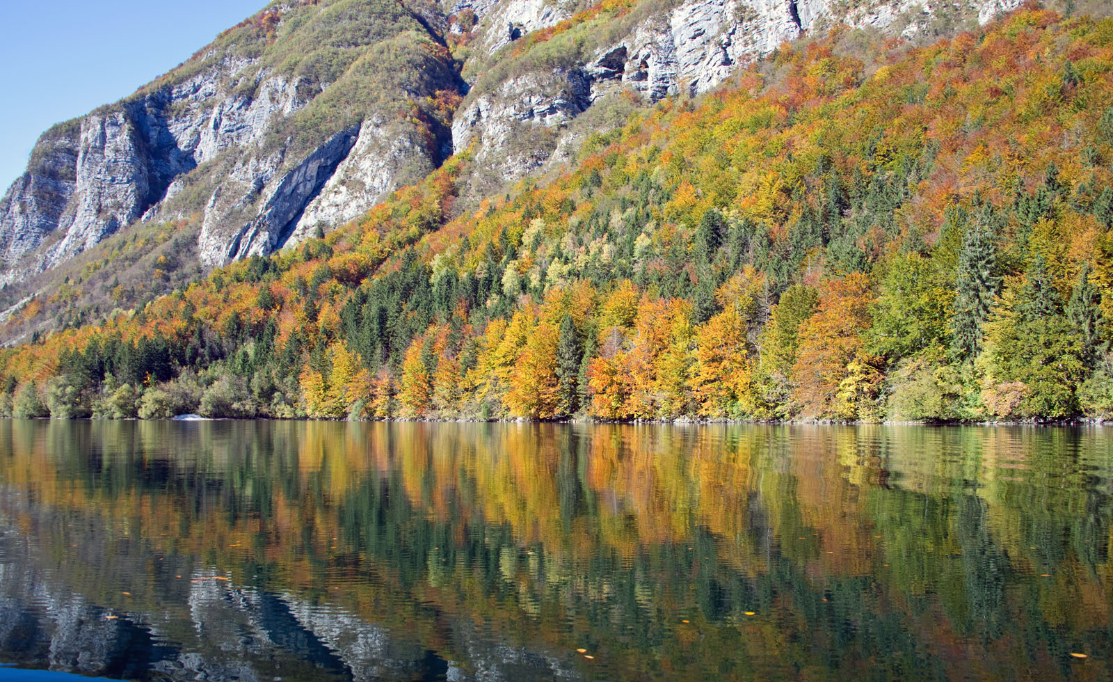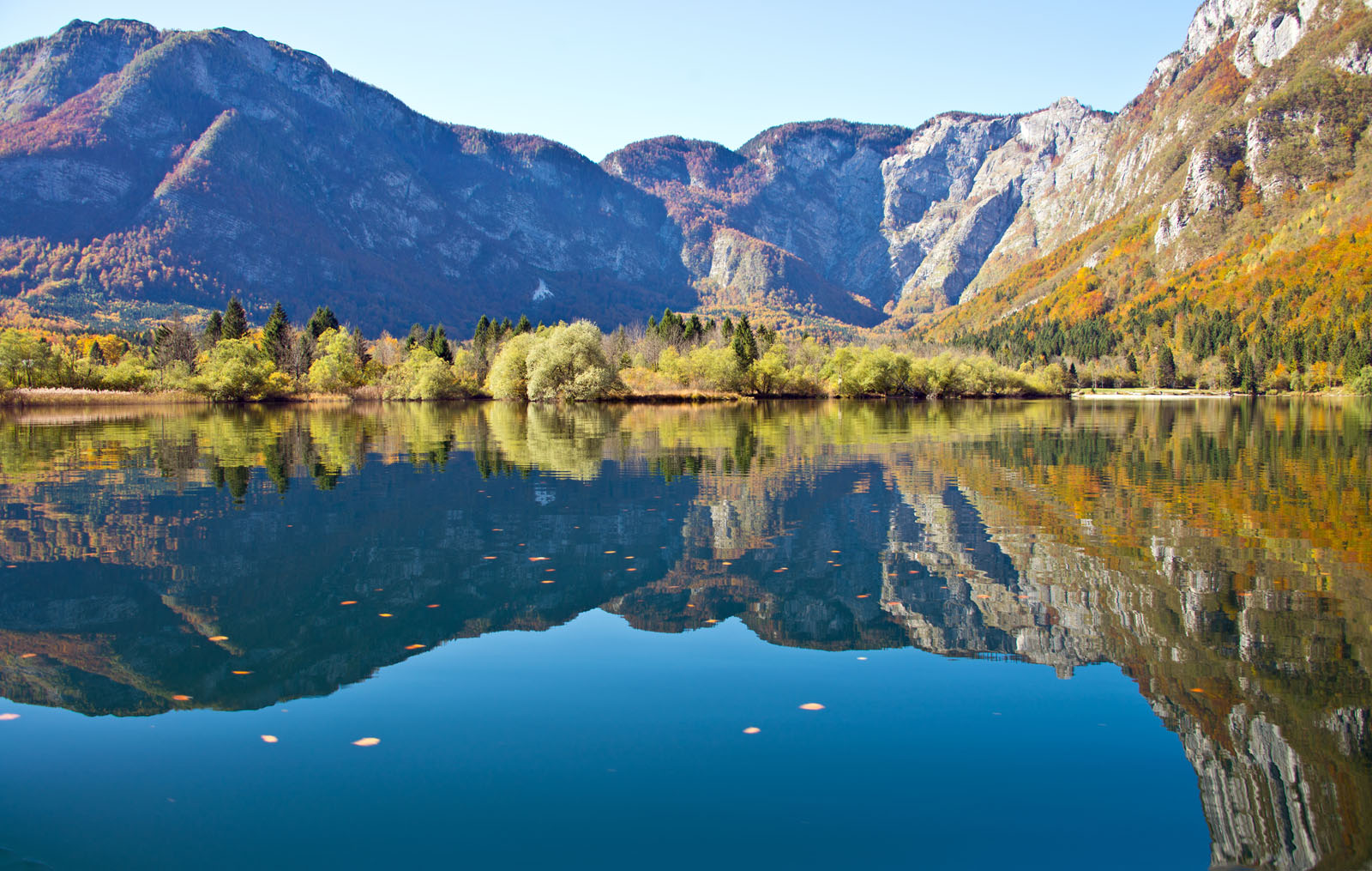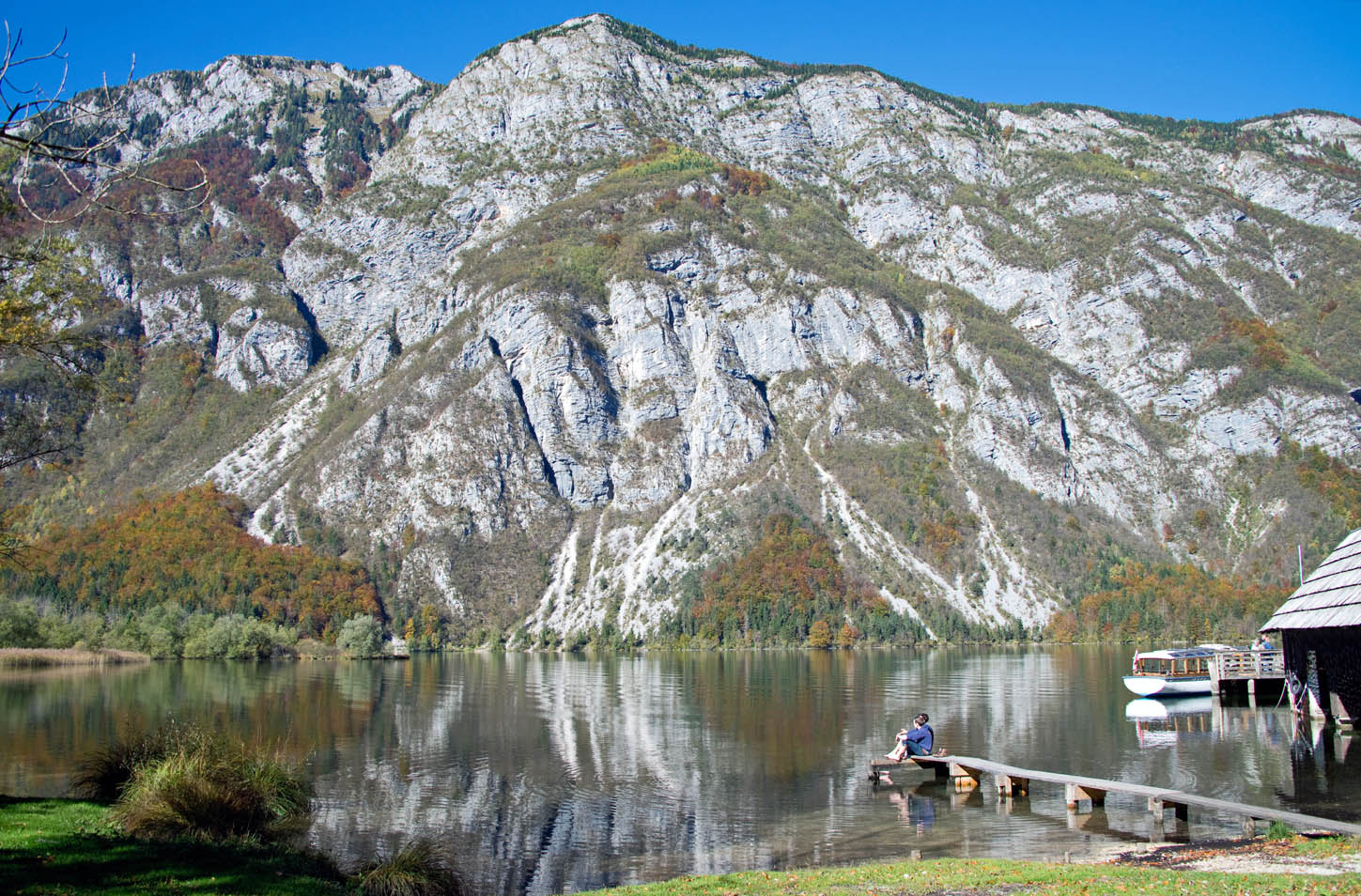 ボーヒン湖はブレッド湖から南西に30kmに位置する。ユリアンアルプスのトリグラフ国立公園の中にあり、澄んだエメラルドグリーンの幻想的な湖である。湖面に映る周囲の山の紅葉と岩肌が素晴らしいです。