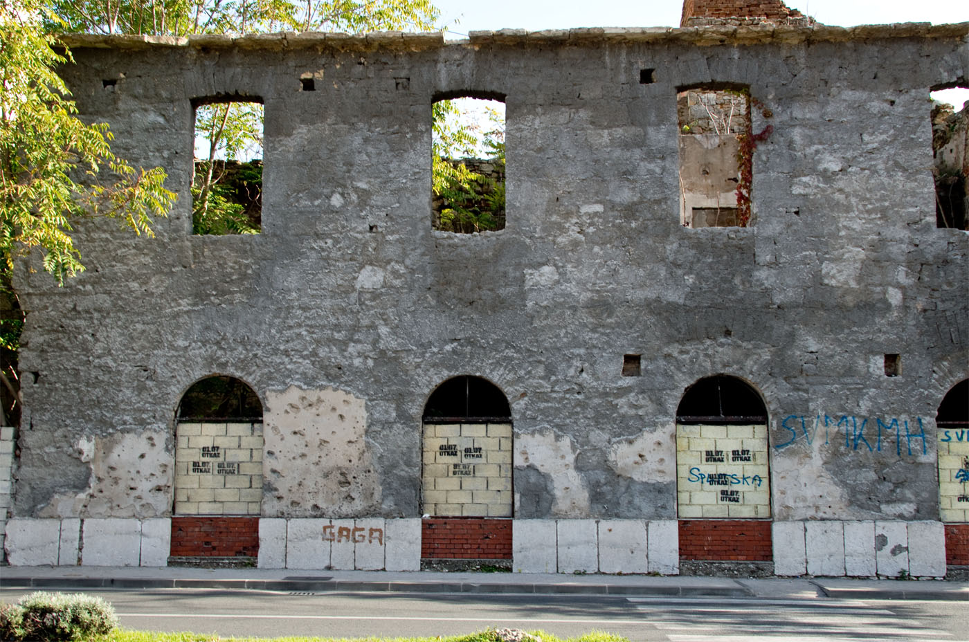 モスタル市街の廃墟には内戦で残された銃弾の跡 |