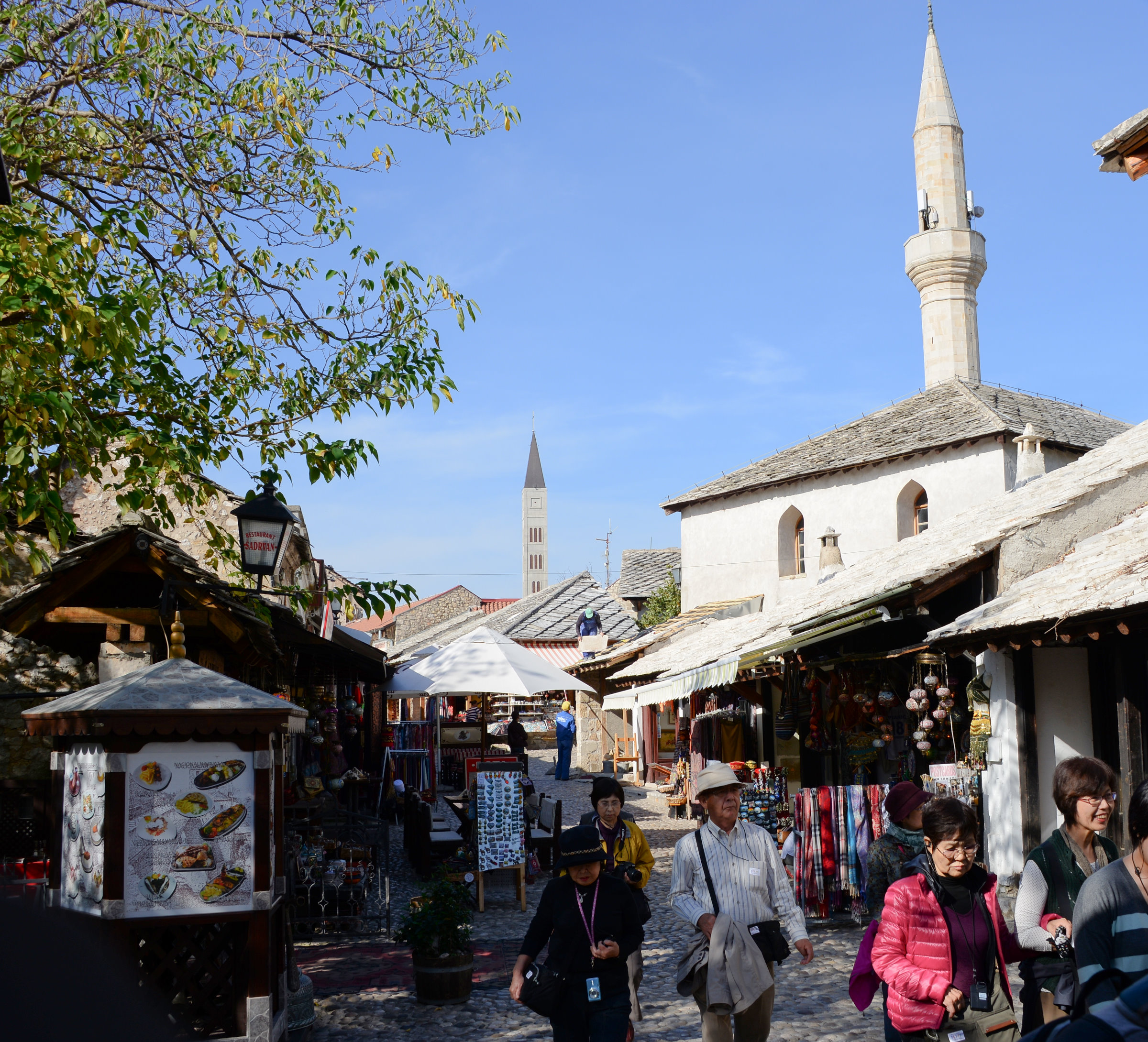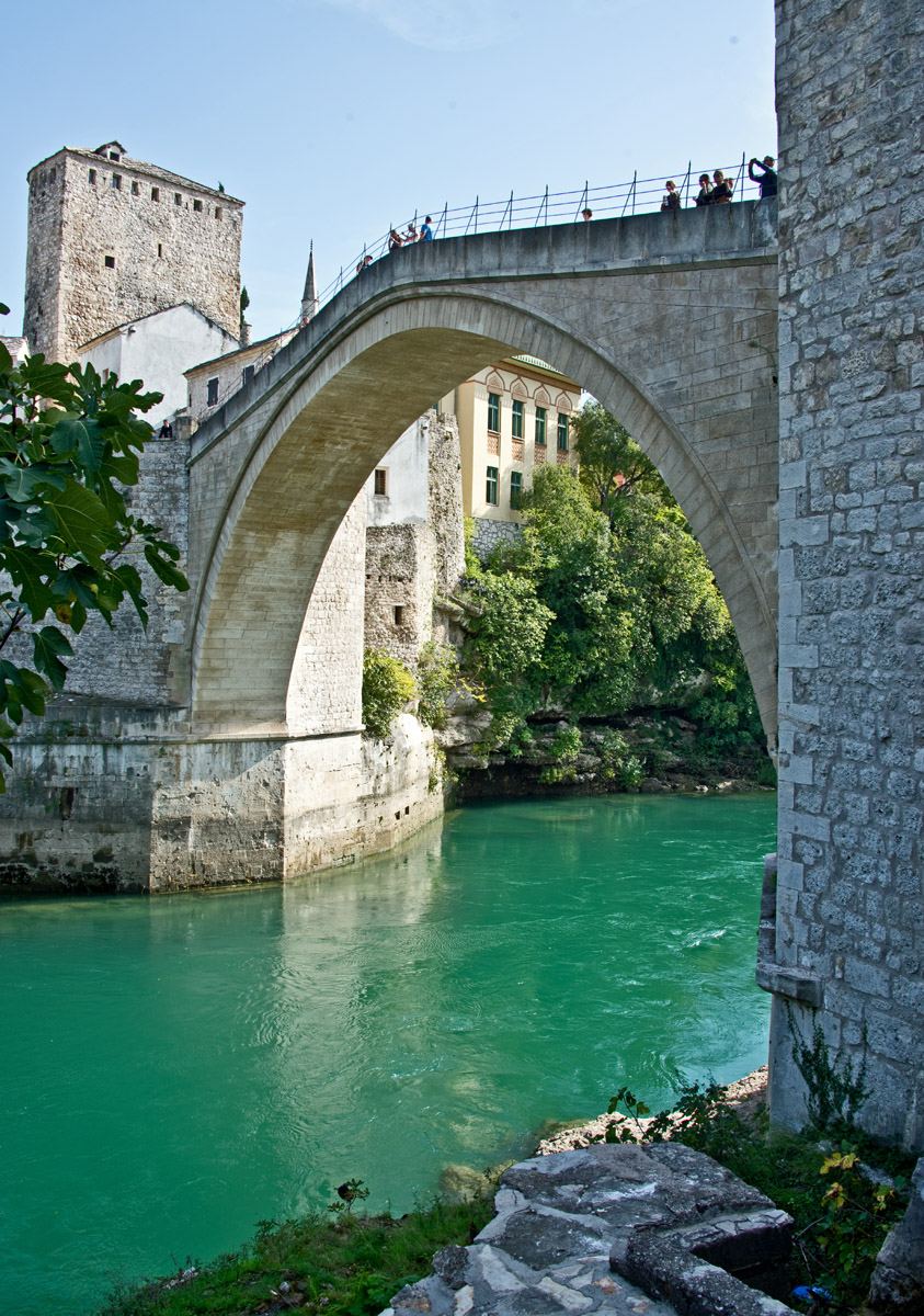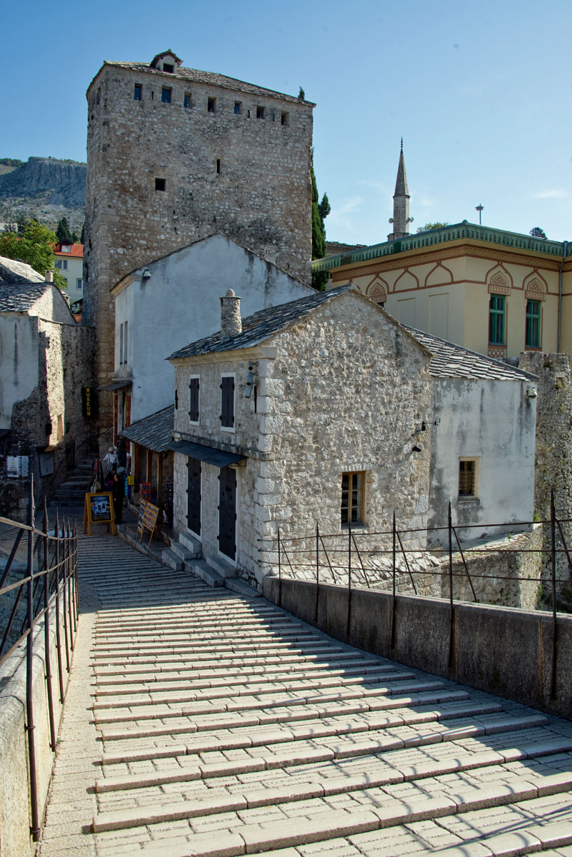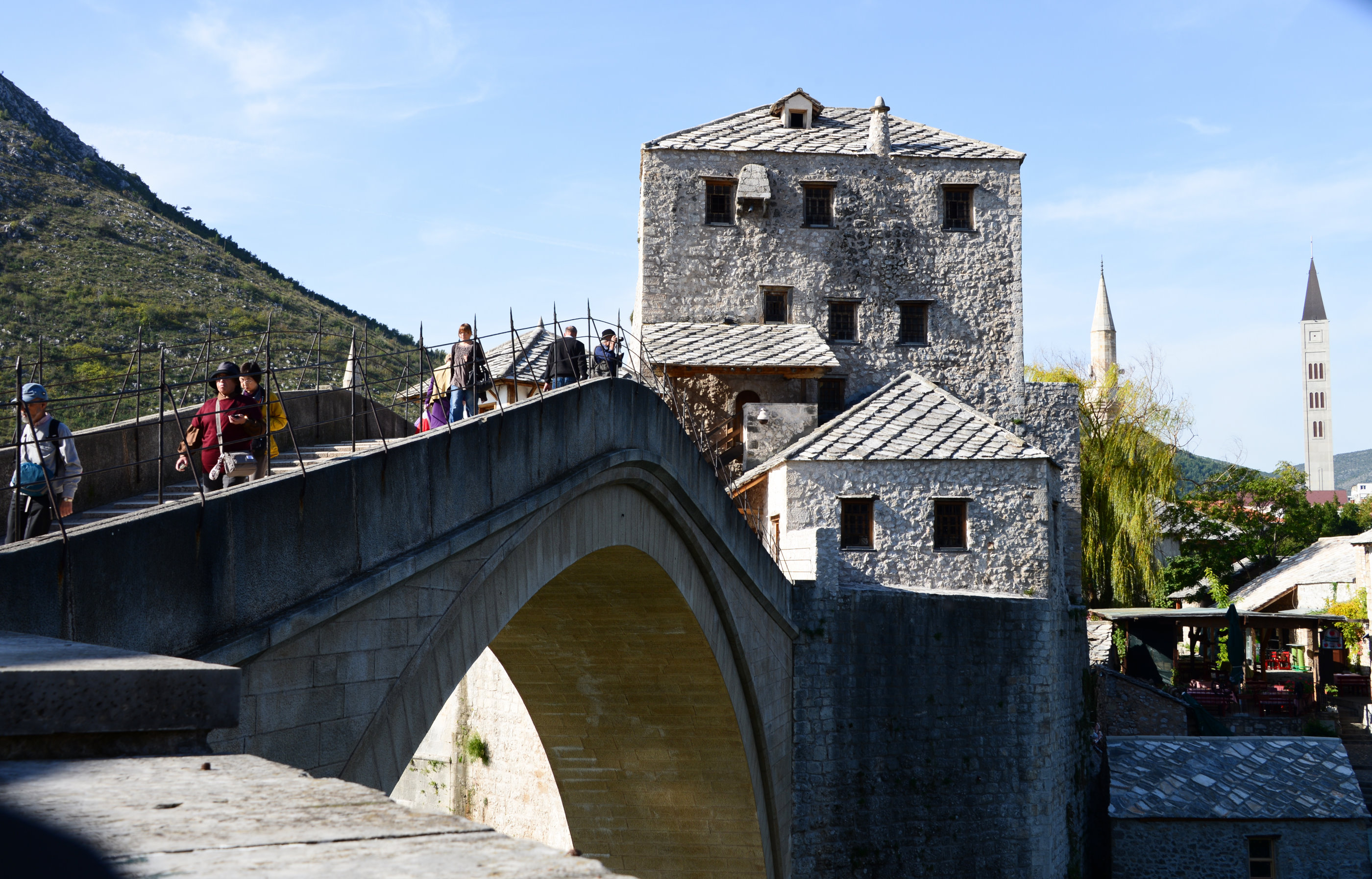 スタリ・モスト(Stari Most)は1566年のオスマン帝国の時代に建設されたトルコ洋式の美しい橋である。全長30メートル、水面からの高さは最大24メートルの石灰岩でできたアーチ橋です。この橋の両側には、要塞化された塔が備えられており、北東にあるのがヘレビヤ塔 (Helebija) 、南西がタラ塔 (Tara) である。この2つは「モスタリ」 (mostari)と呼ばれ、その意味は「橋の護衛者たち」である。 この橋もボスニア・ヘルツェゴビナ紛争でクロアチアのロケット弾によって崩れ落ちました。1995年に紛争が終結すると、1997年から橋の再建工事が始まりました。まずは、川底から破壊された橋の残材を拾い集める作業を行い、その後、残材を乾燥させる作業を行いました。足りない石材は、創建当時と同じ地元の石灰岩が使用されました。ユネスコの支援を受けたトルコ企業によって、創建当時の技法を使って、2004年6月23日に建設当時の姿が再建されました。