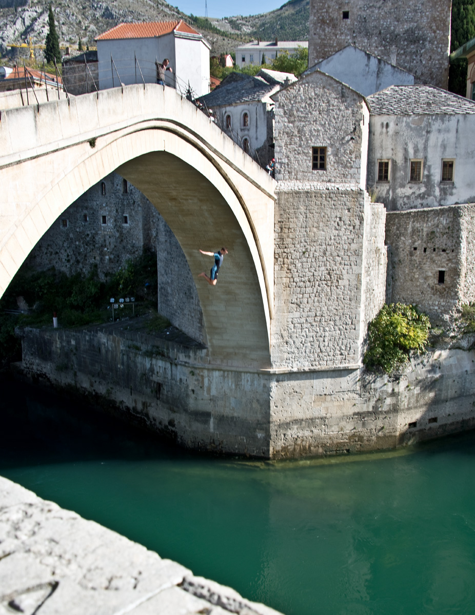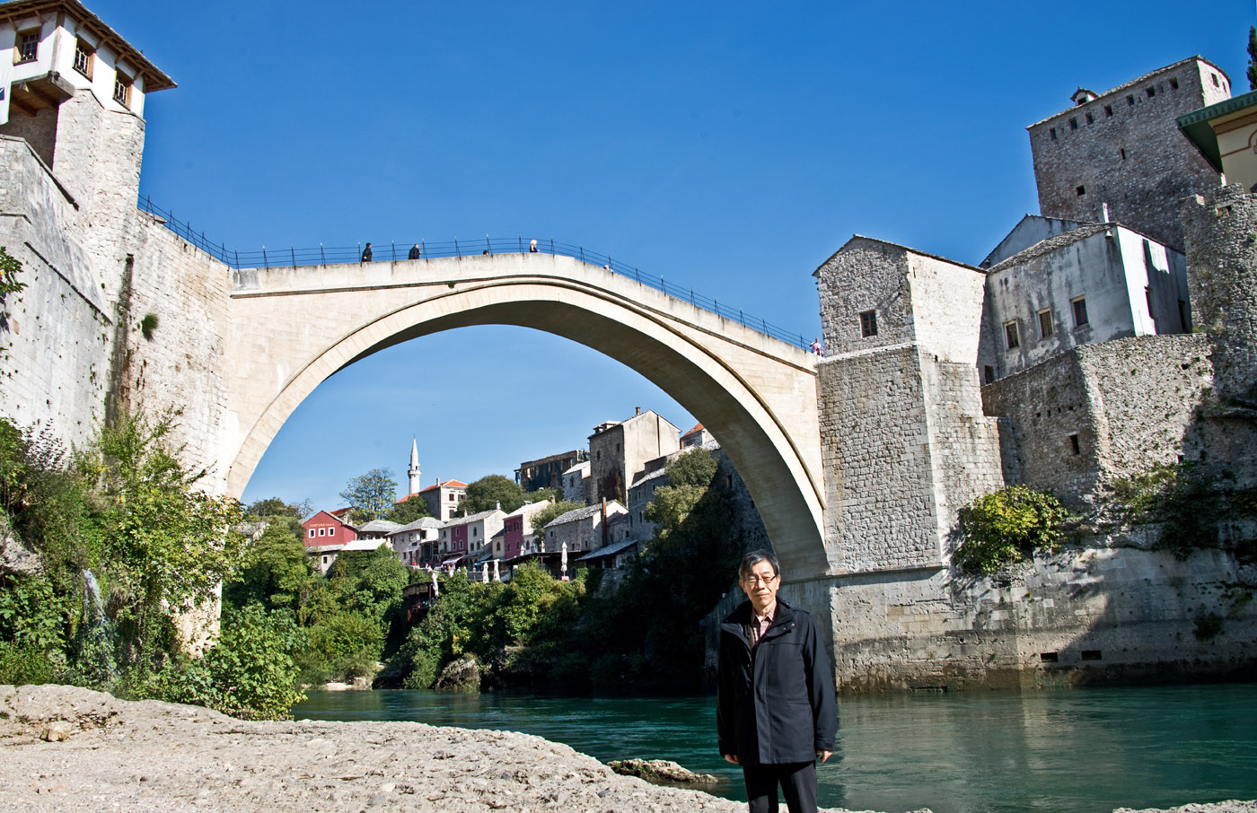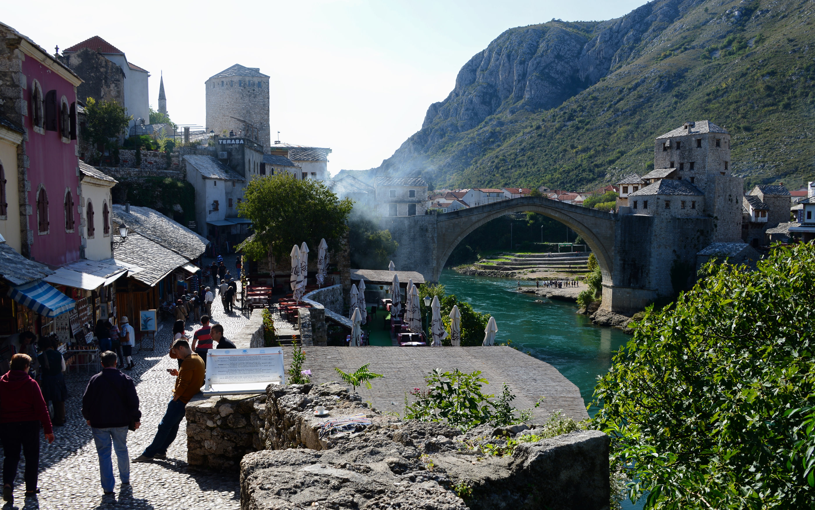 スタリ・モスト(Stari Most)は1566年のオスマン帝国の時代に建設されたトルコ洋式の美しい橋である。全長30メートル、水面からの高さは最大24メートルの石灰岩でできたアーチ橋です。この橋の両側には、要塞化された塔が備えられており、北東にあるのがヘレビヤ塔 (Helebija) 、南西がタラ塔 (Tara) である。この2つは「モスタリ」 (mostari)と呼ばれ、その意味は「橋の護衛者たち」である。 この橋もボスニア・ヘルツェゴビナ紛争でクロアチアのロケット弾によって崩れ落ちました。1995年に紛争が終結すると、1997年から橋の再建工事が始まりました。まずは、川底から破壊された橋の残材を拾い集める作業を行い、その後、残材を乾燥させる作業を行いました。足りない石材は、創建当時と同じ地元の石灰岩が使用されました。ユネスコの支援を受けたトルコ企業によって、創建当時の技法を使って、2004年6月23日に建設当時の姿が再建されました。