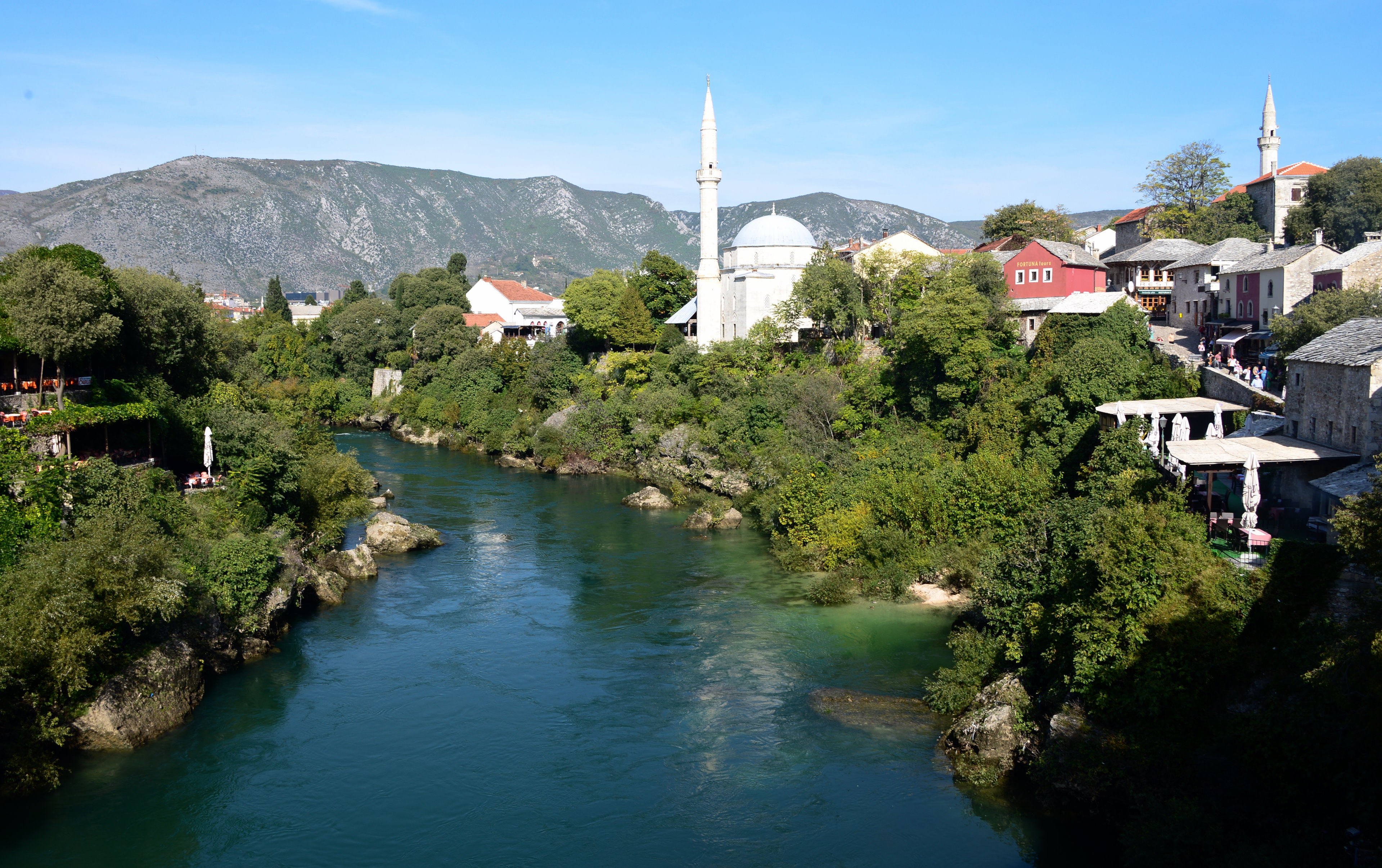 スタリ・モスト最高部から見たネトレヴァ川 対岸左に白いミナレットのコスキ・メフメット・パシャのモスクがある