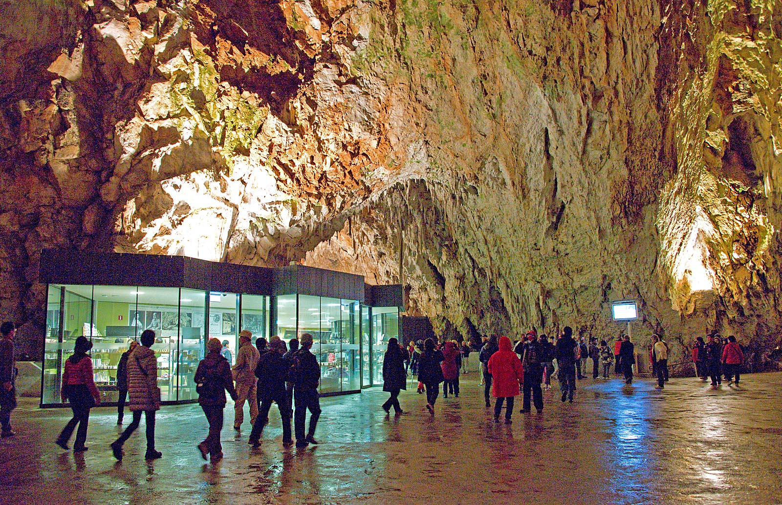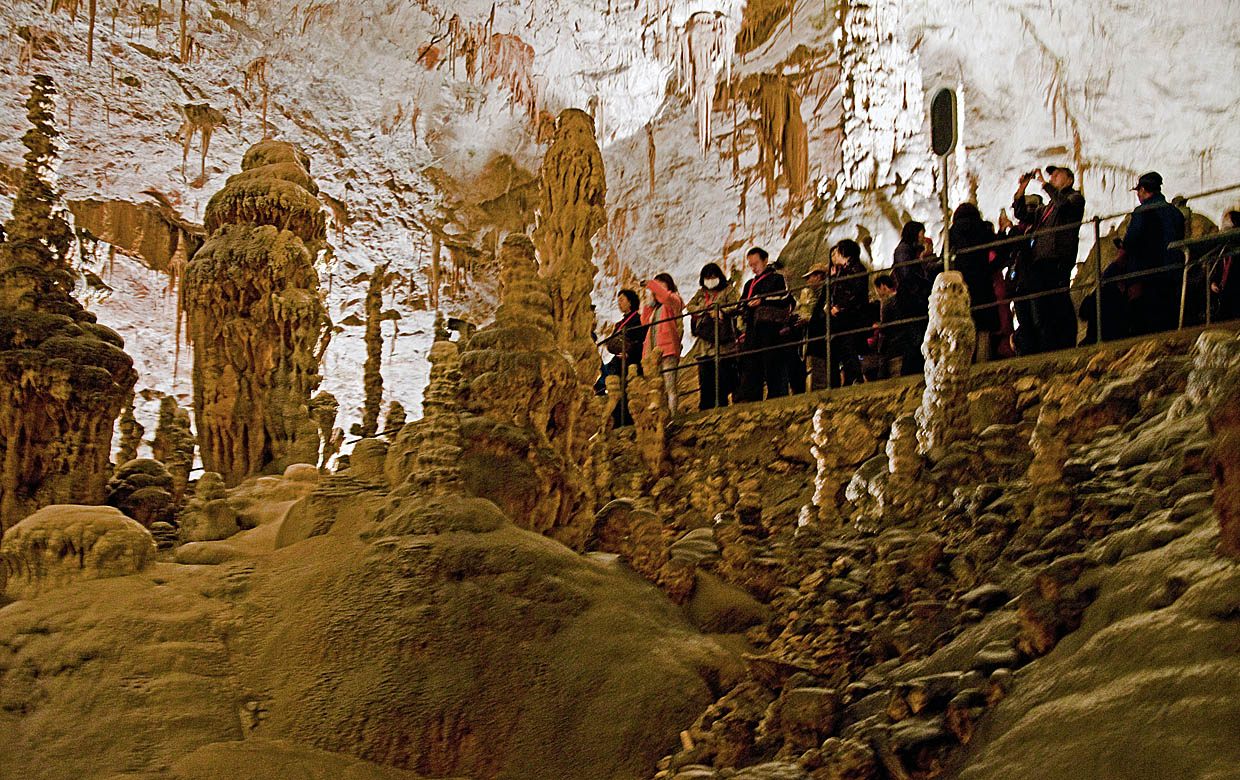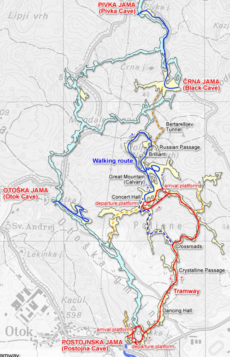 トロッコから下車し、2km程度徒歩で観覧する。「高層建築」と呼ばれるところから、大きい山(ヴェリカ・ゴラ)という洞窟の山に登り、ノアの箱舟などの石筍を見る。数々の鍾乳石を見ながら山を下り、ロシア橋を渡る。この橋は、第一次世界大戦の間、ロシア捕虜によって建設されたものである。そして鍾乳洞は最も美しい洞窟(レペ・ヤメ)に続く。ここではスパゲティホール、白のホール、赤いホールを巡る。「スパゲティ」と呼ばれる美しい細く繊細な中空状の氷柱のような形状の鍾乳管がある。最も美しい「ブリリアント」を見て、高さ40m、広さ3000平方mの大きなコンサート・ホールと呼ばれる空間に至る。実際にコンサートが開催され1万人を収容でき、ショップもある。ここから帰路の電車に乗る。
