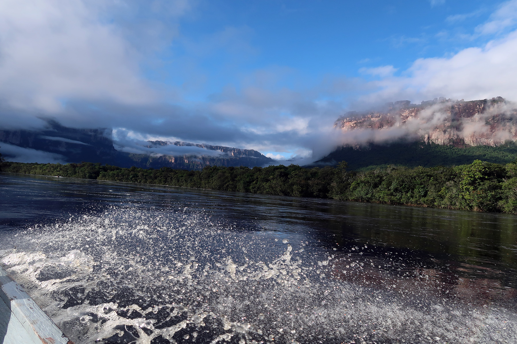 両側のジャングルとテプイが美しい。川幅の広いところは水面は穏やかで乗り心地は悪くない。 |