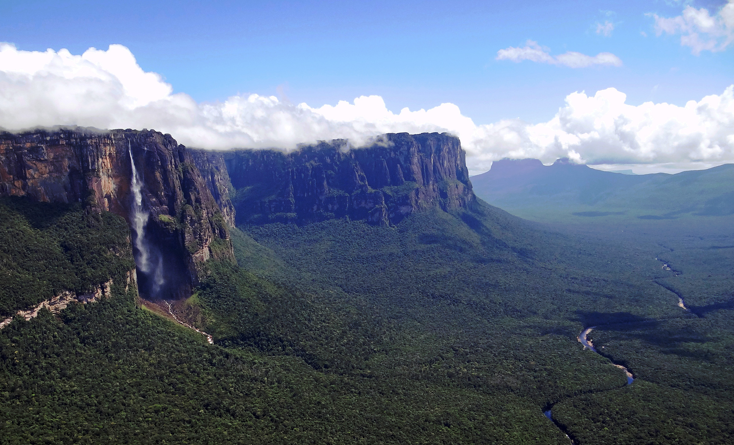 航空写真 アウヤンテプイ、エンジェルフォール、チュルン川(河原にキャンプも見える)(Form Wakipedia)