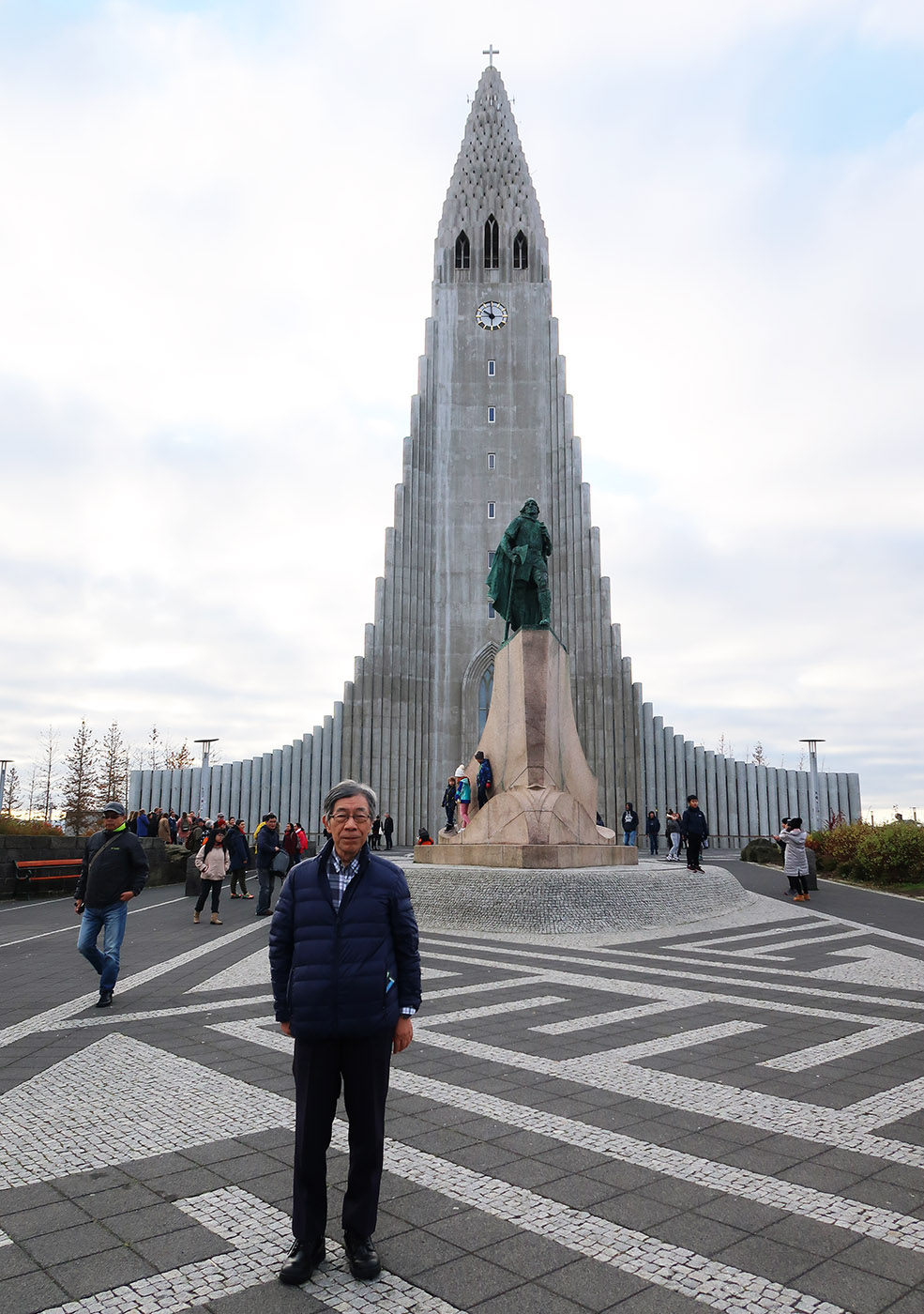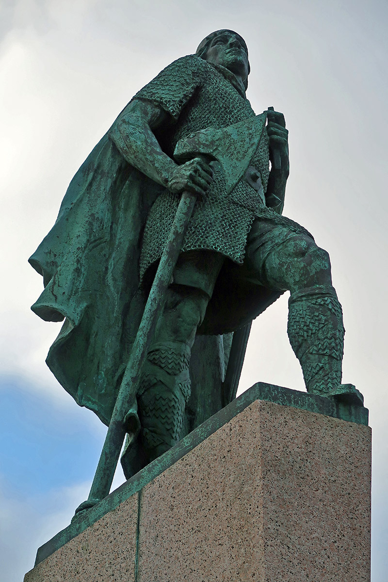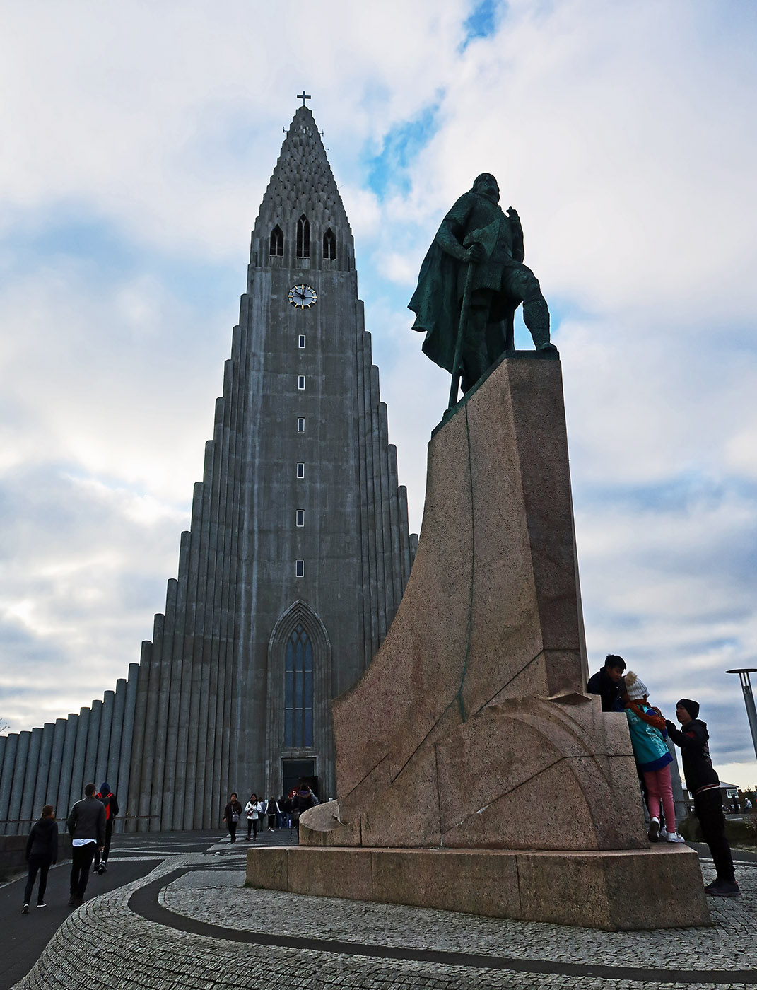 教会の前に立つ探検家レイフ・エイリクソンの像