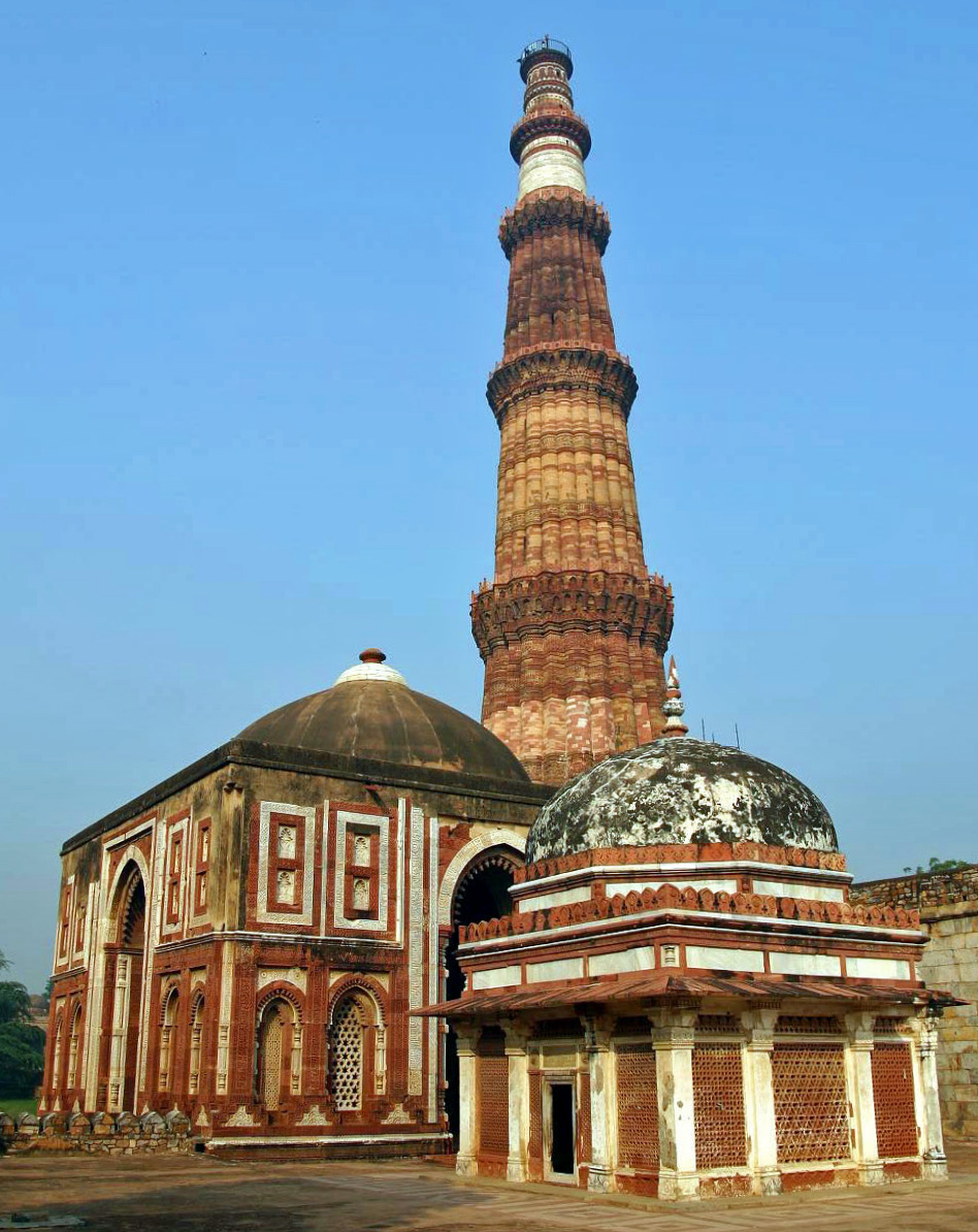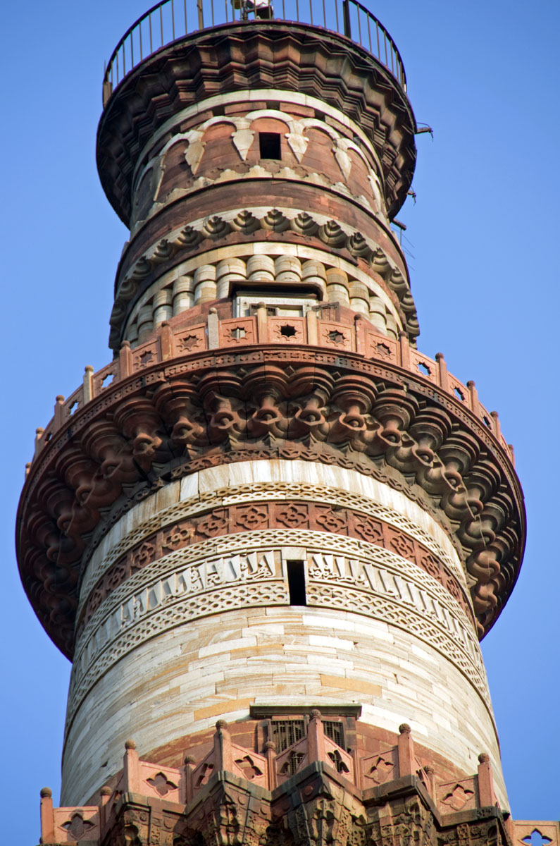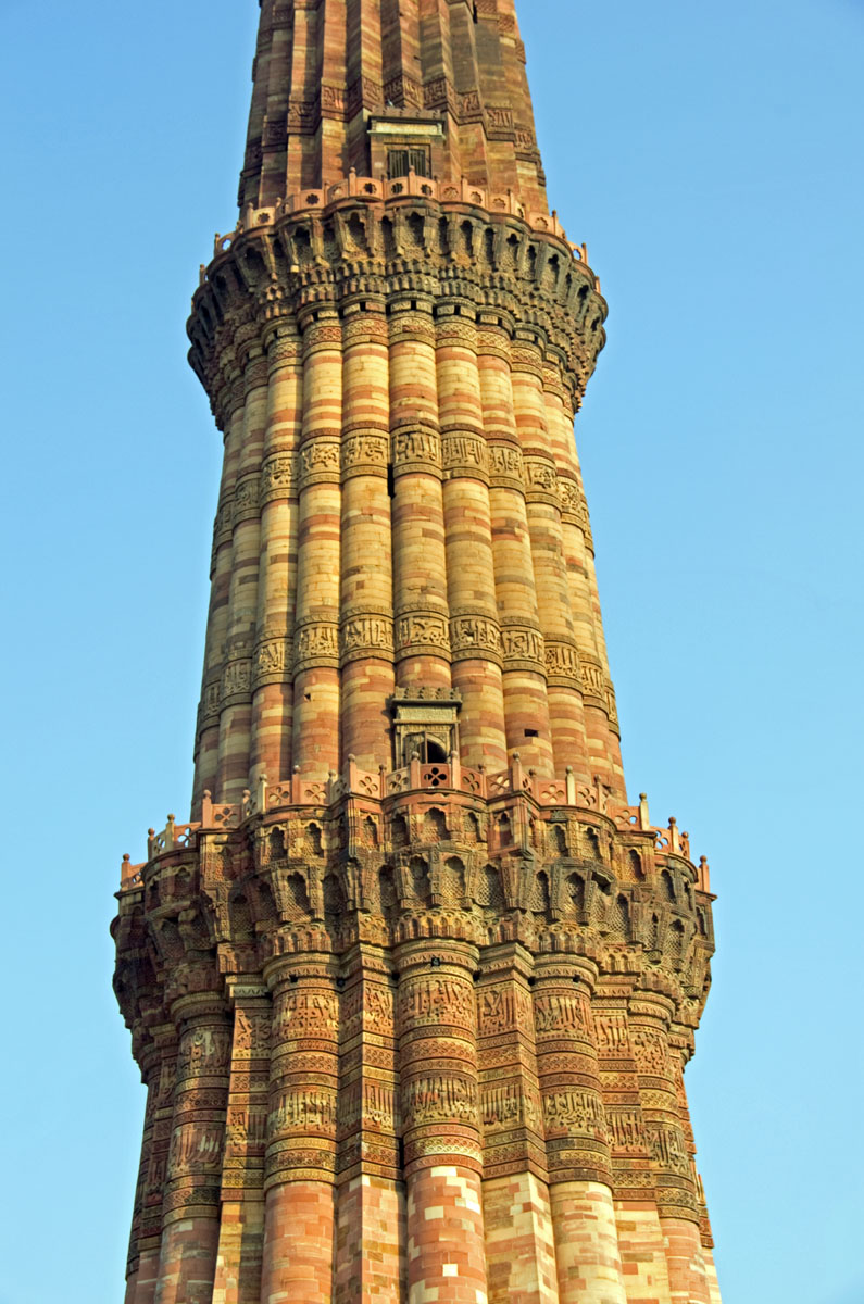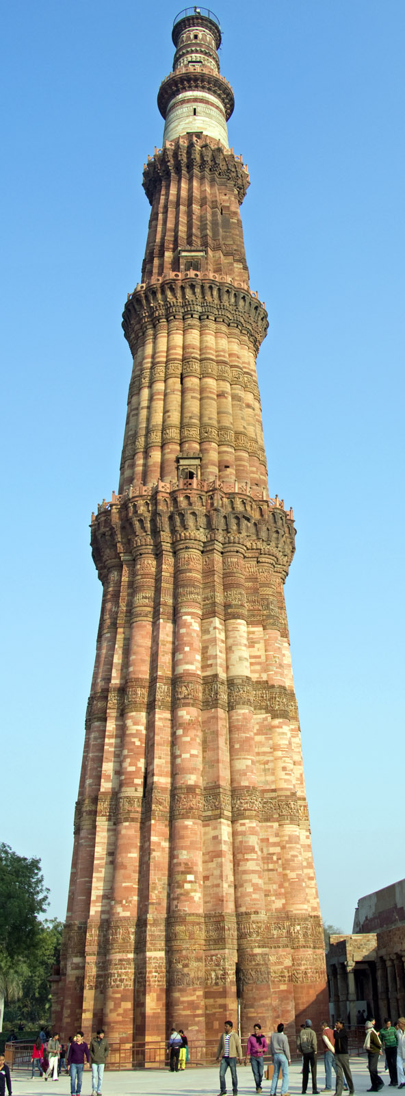 1200年頃にアイバク帝が戦争勝利の記念碑として3層まで建設したイスラム建築様式の巨大な尖塔.14世紀にはフィルーズ・シャー帝が塔の白い部分の4層と5層を増築した.