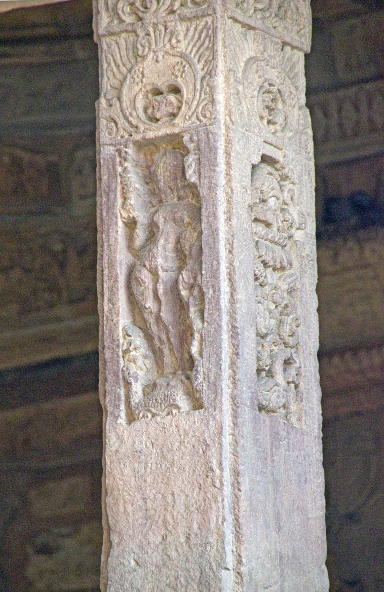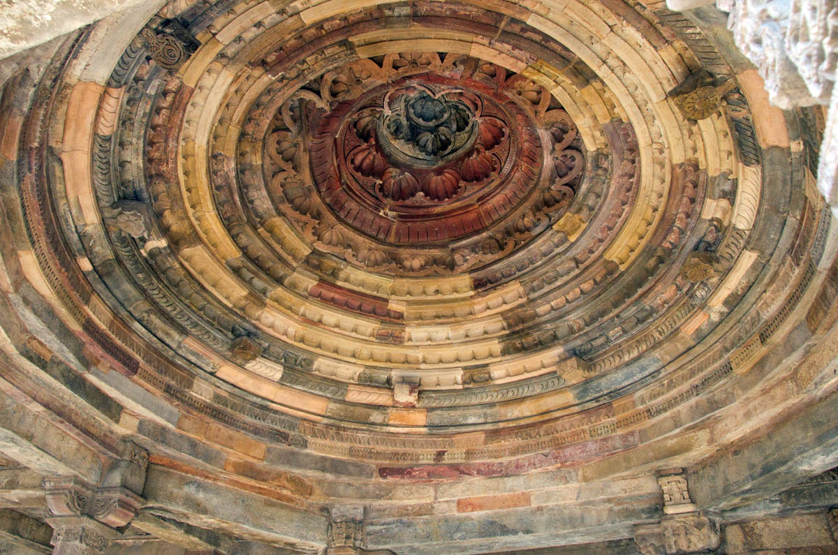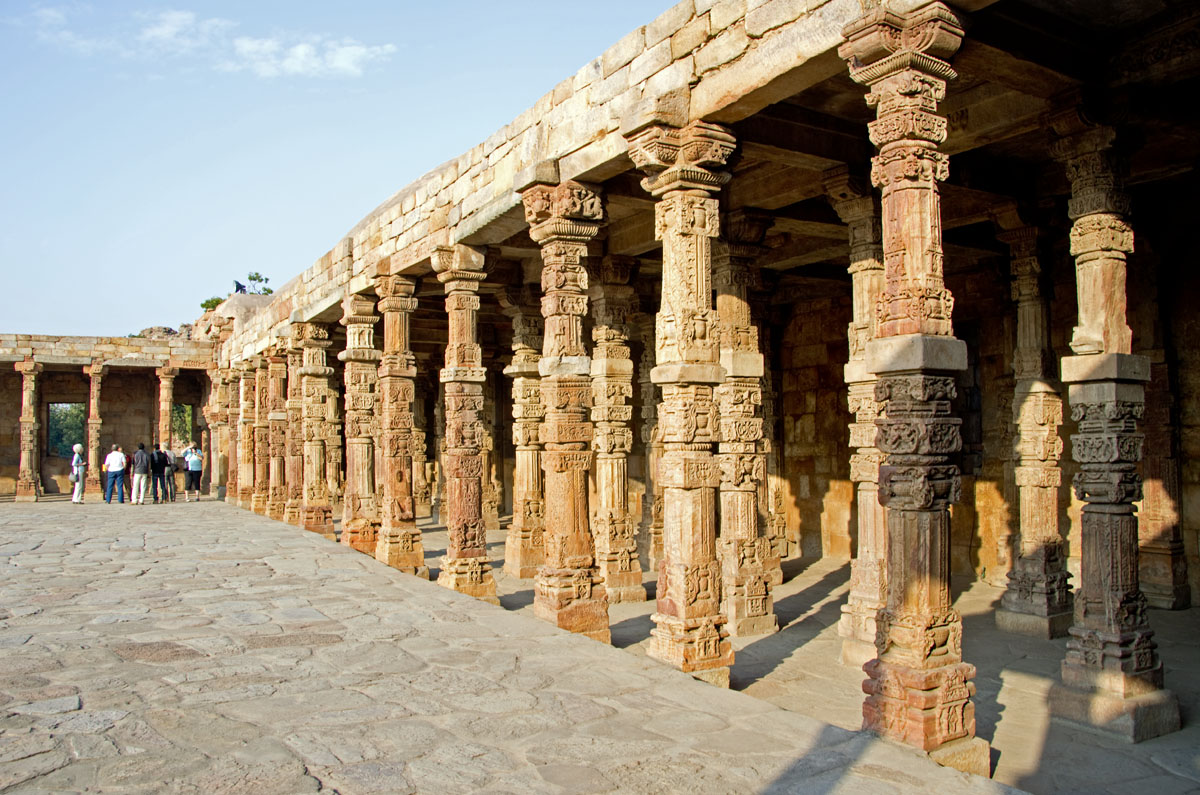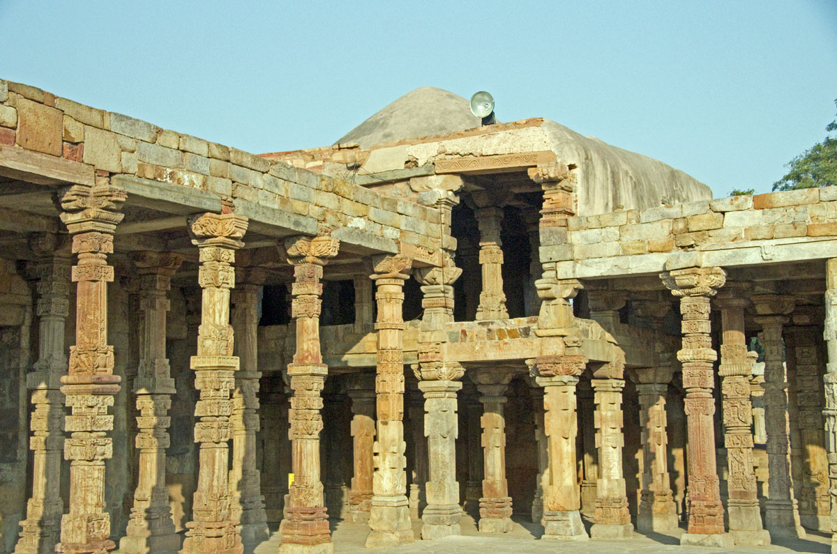 アイバク帝は周辺のヒンドゥー教やジャイナ教の寺院を廃止・解体し,それらの石材をモスクの建材に流用.イスラム教では偶像崇拝は禁止され,建築に神や動物の像はなく,図案化した草花や幾何学模様のみ.しかし、このモスクではヒンドゥー寺院の石建材をそのまま使用したために,女神像などが柱に残されている.