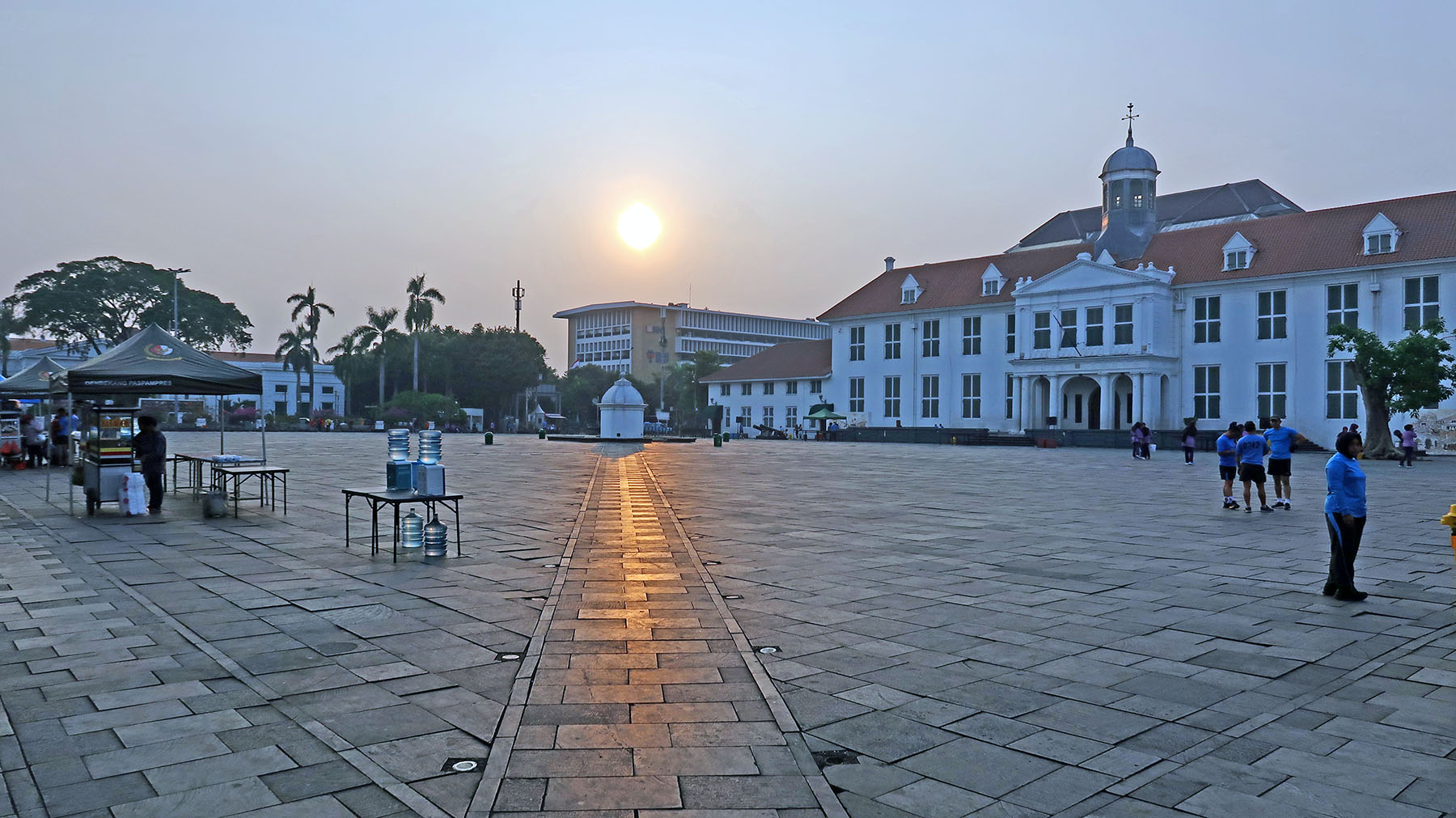 早朝のファタヒラ広場 右はジャカルタ歴史博物館
