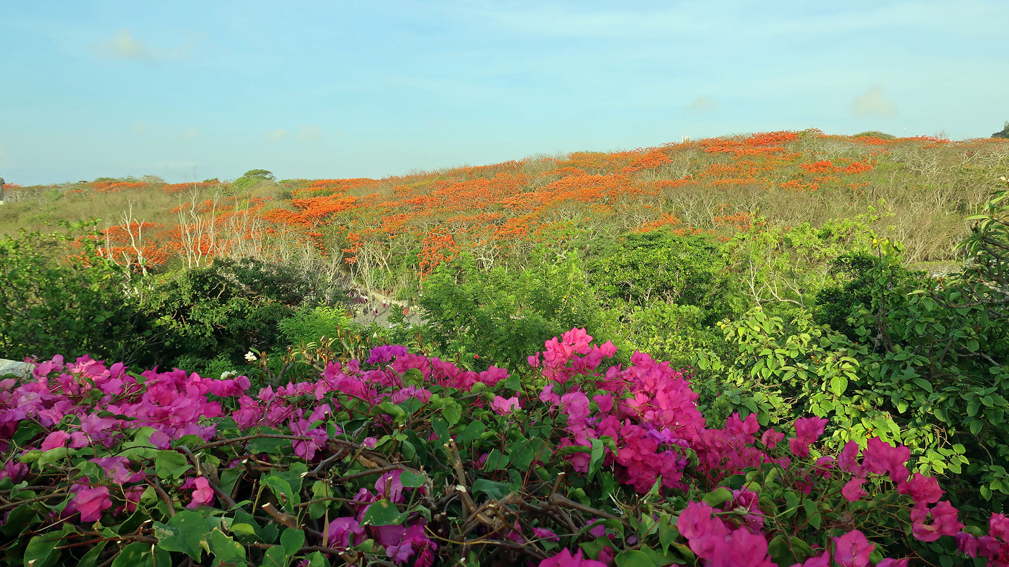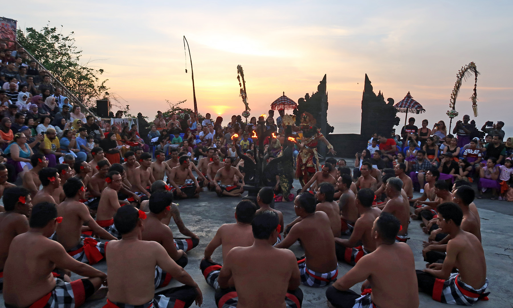 夕日が沈む前に始まるダンスも半ばになると日がインド洋に沈みます。ウルワツ寺院の3重のメルも遠くに見えとても絵になる光景です。