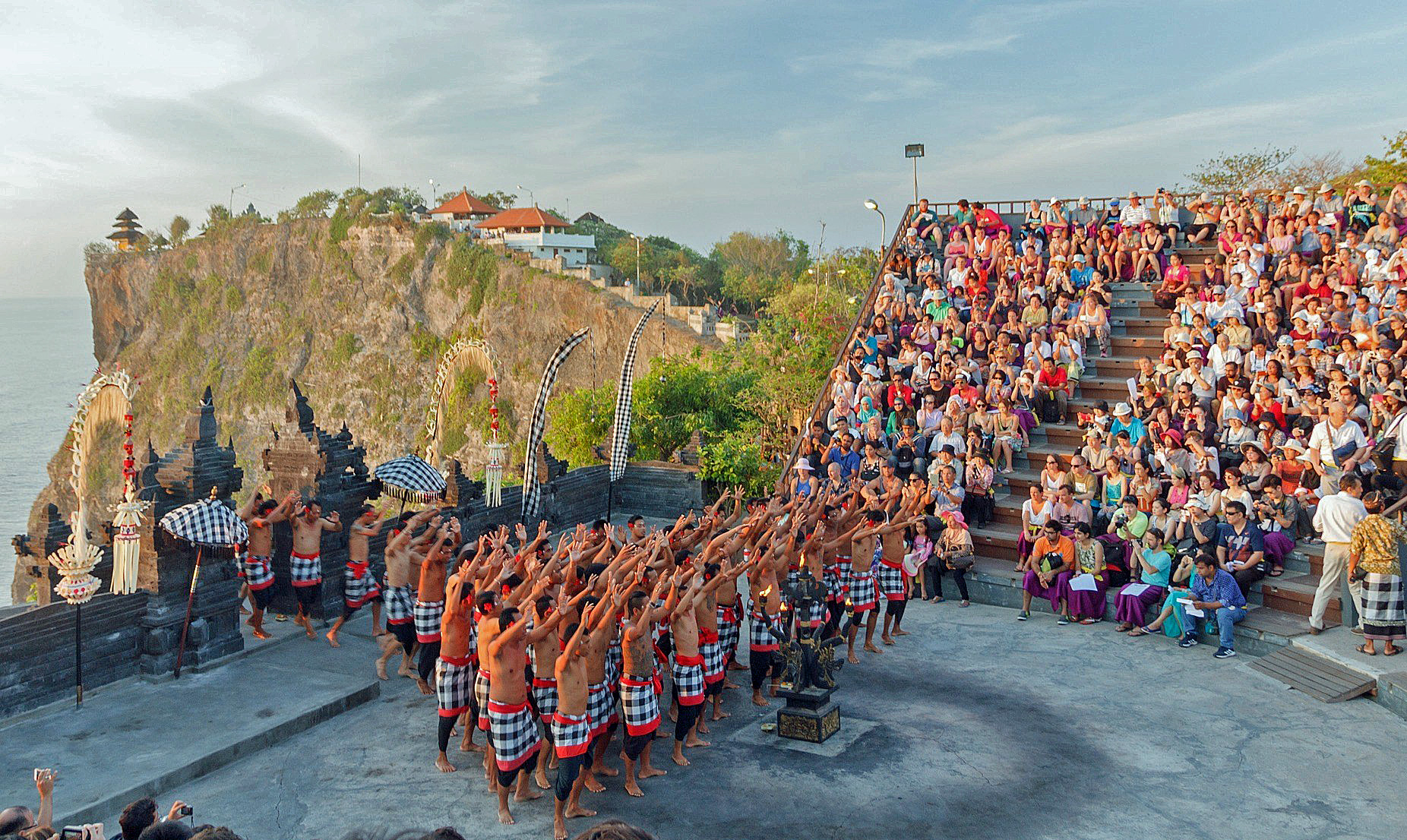 ウルワツ寺院は、バリ島南部バドゥン半島の南西の岬の先端にある、海の精霊ブタラ・ダラム・ベジを祀ったバリ・ヒンドゥー教の寺院です。寺院は昔、ウンプ・クトゥラン僧により建立され、15世紀に高僧サンヒャン・ニラルタが、三層のメル(多重塔)などを建立し現在のようなお寺になったといわれています。インド洋の荒波が打ち寄せる断崖絶壁の上に建てられたウルワツ寺院は、海に沈む夕日をバックにした素晴らしい情景が大変有名です。また、夕方6時から毎日行われるケチャダンスは、時間とともに色を変える空という自然の素晴らしい演出と相まって、いつも多くの観光客が訪れる人気の伝統舞踊公演です。