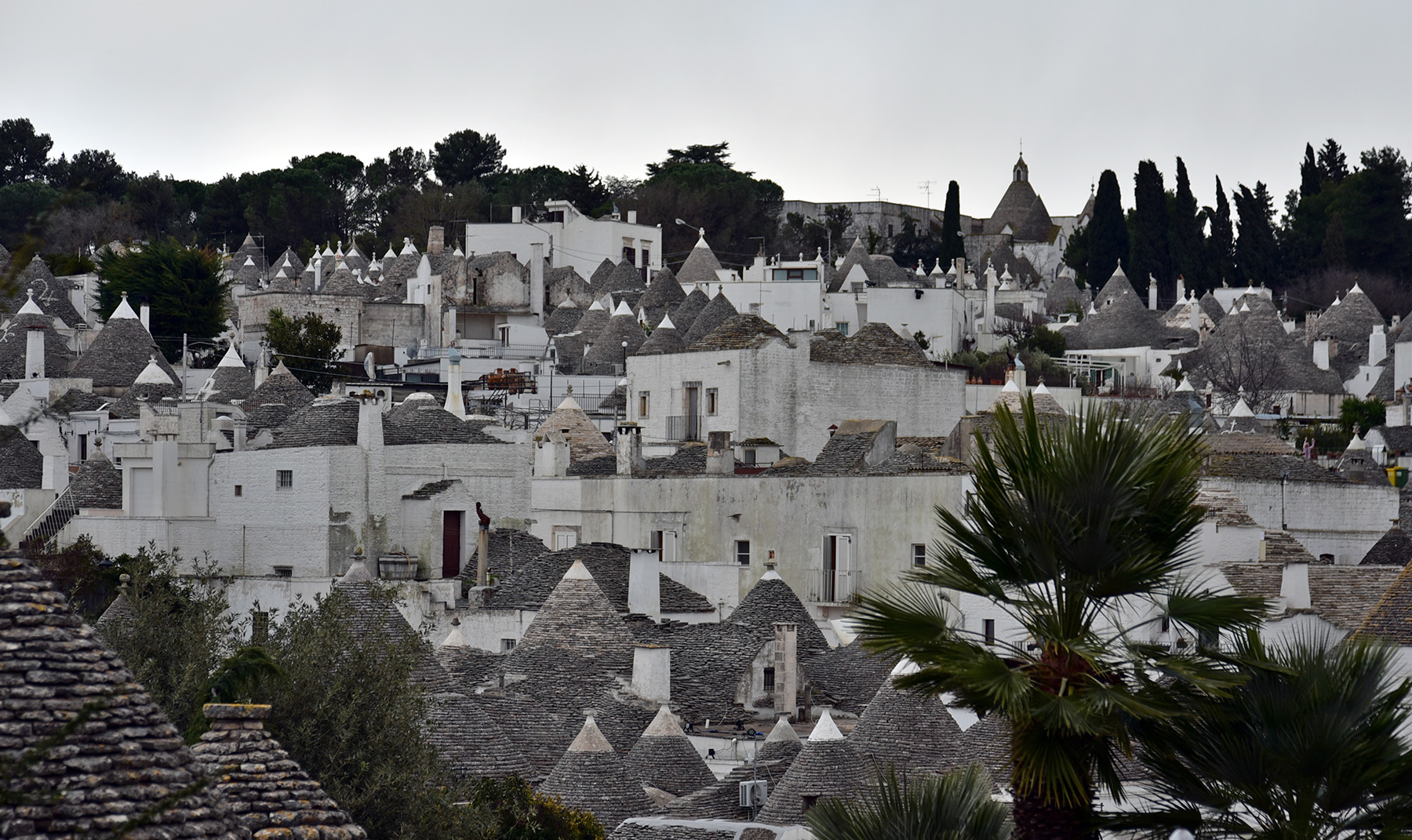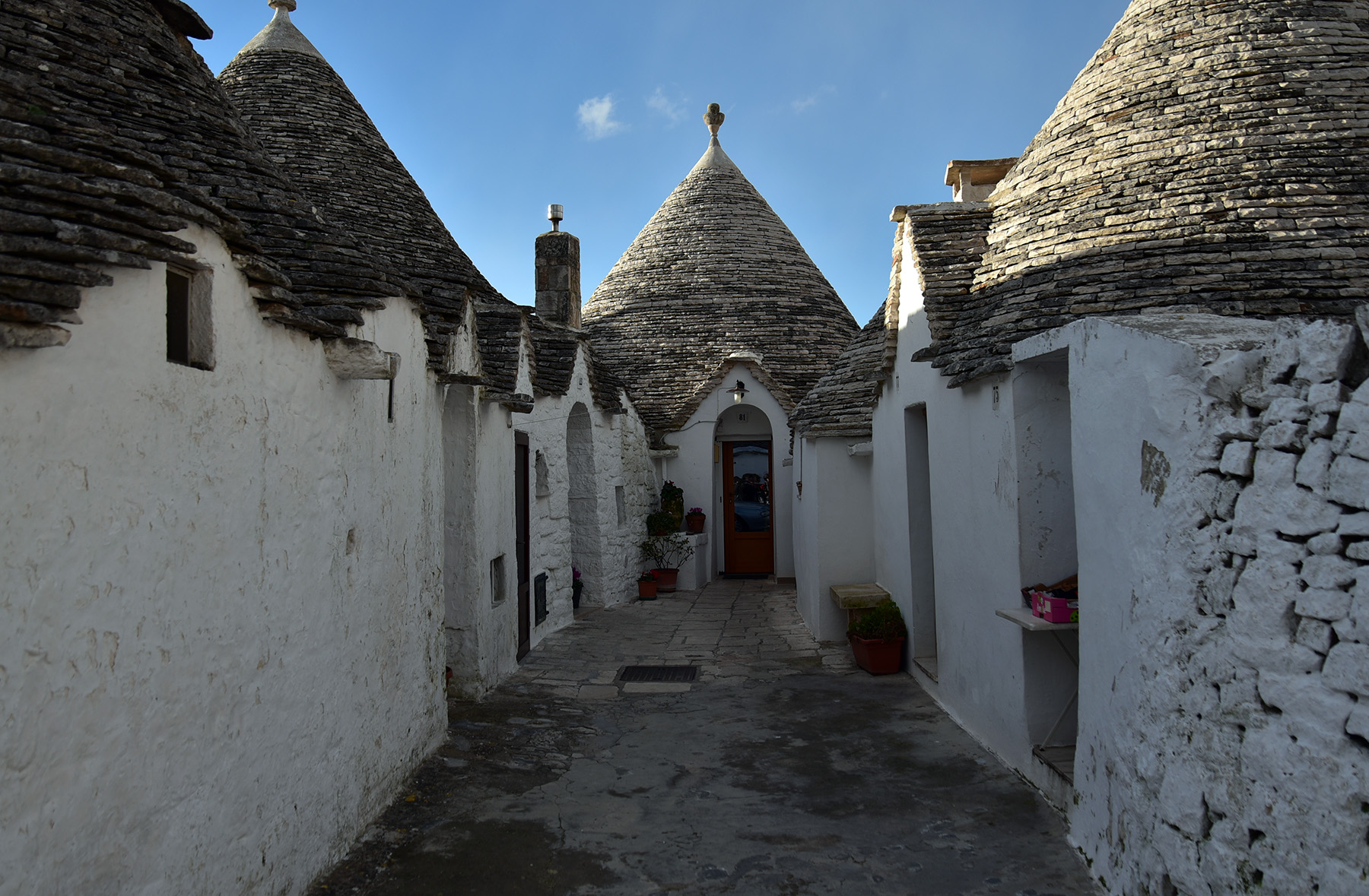 アルベロベッロは17世紀ごろから建築の始まった円錐形の石の屋根と白い石の壁が特長的なトゥルッリの街並みで有名。モンティ地区は商業地区で、ショップ、レストランがある。 アイア・ピッコラ地区は住宅がある。1996年に世界遺産登録。