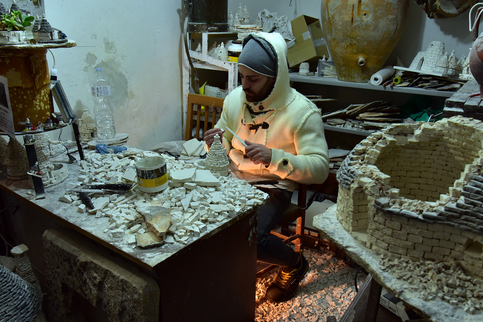 飾りものの小さいトゥルッリを作る職人 実際の構造通り石で作っている。