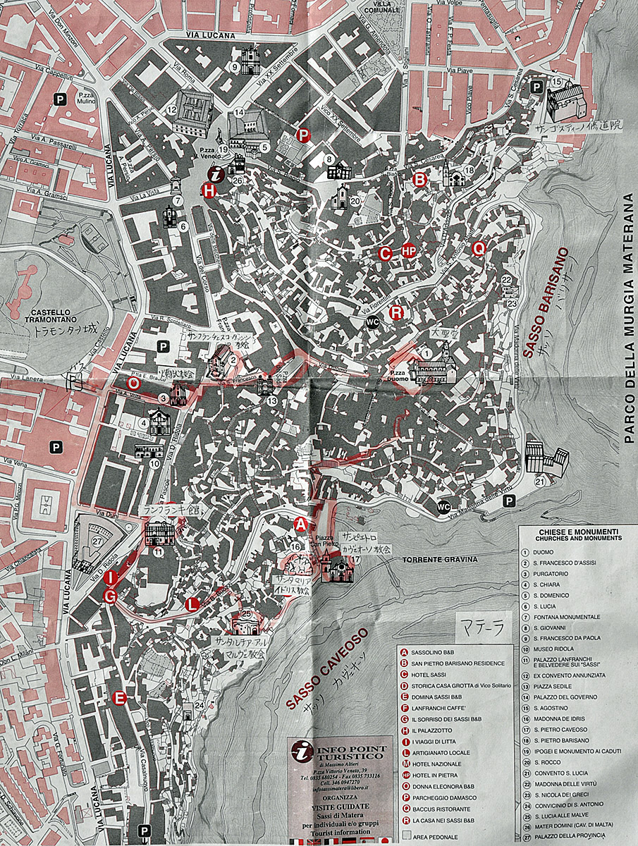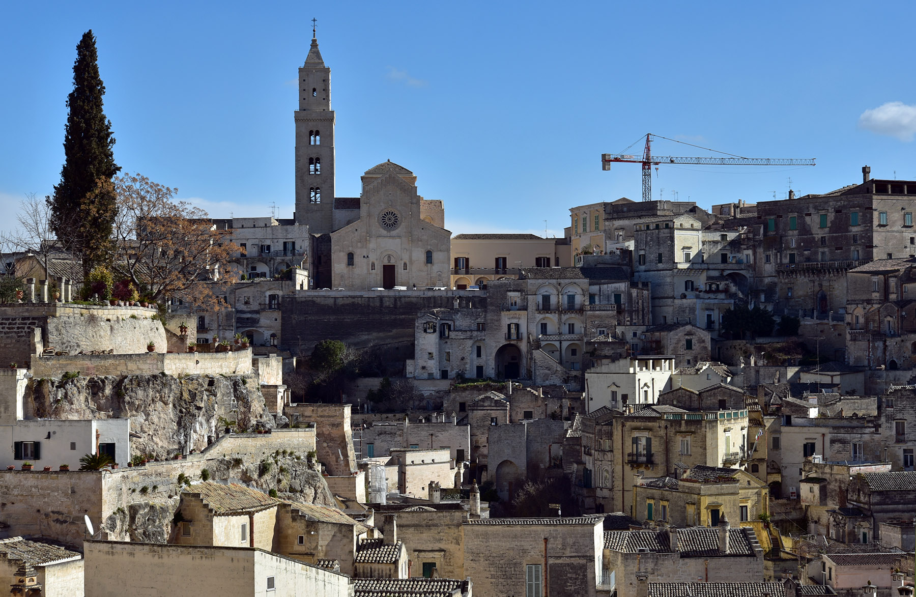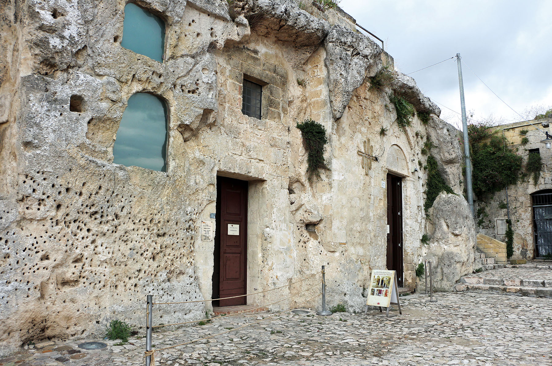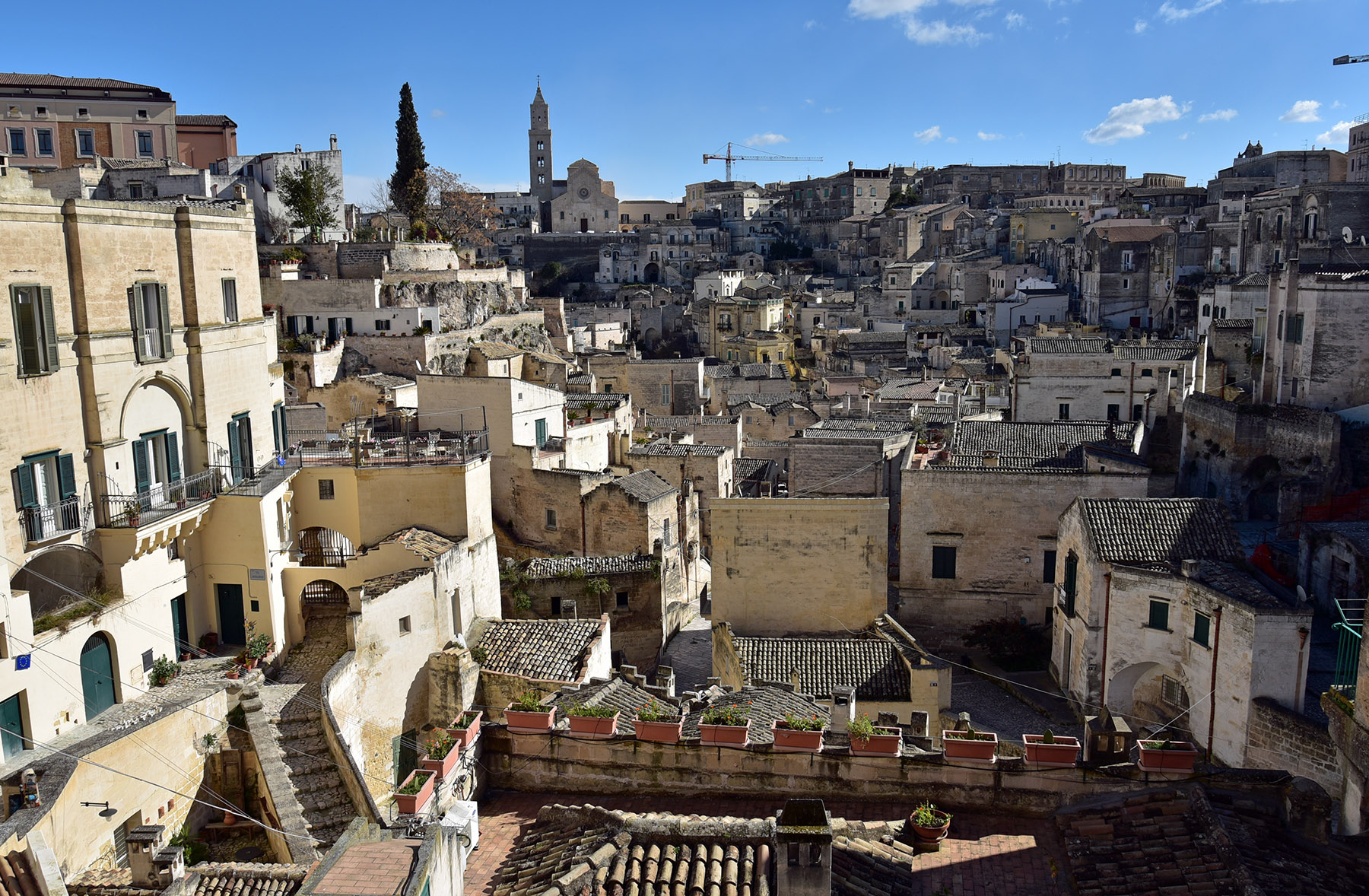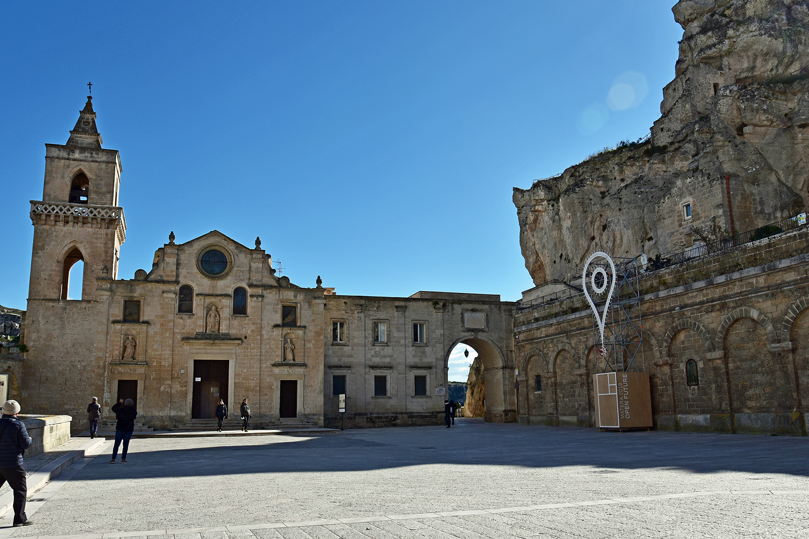 マテーラはバジリカ州第2の都市、旧市街には石灰岩の岩を掘った岩窟住居サッシが多数ある。美しいフレスコ画の岩窟教会、サッシを利用したレストランなどがある。旧市街全体が1993年世界文化遺産登録された。