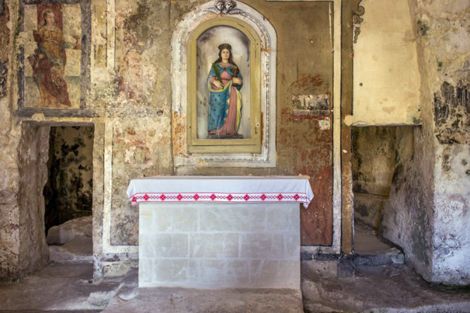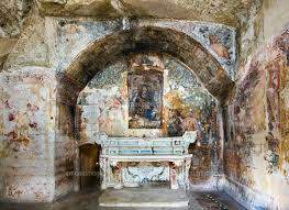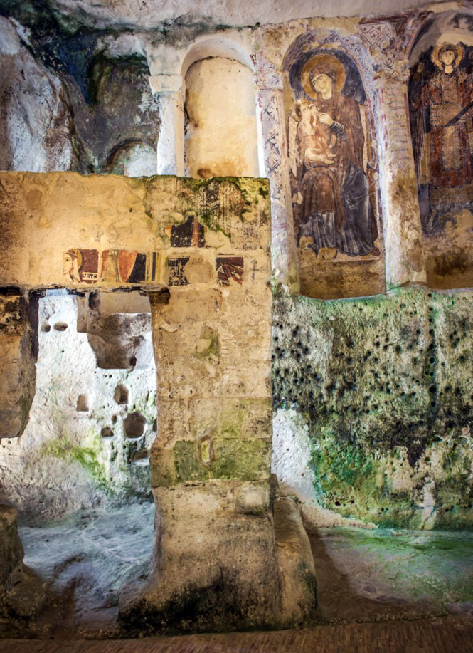 サンタ・ルチア・アッレ・ヌルヴェ教会は9世紀に建設された聖ルチアを祭る女子修道会の岩窟教会であり、授乳する聖母、聖ルチアを描いたフレスコ画が綺麗に残されいる。13世紀に住居に転用され、内部で炊飯などを行ったため、煤などが壁に付き、痛んだ絵もあるが、当時を今に残す素晴らしい遺産である。内部は写真撮影禁止されているが、ガイドブックやホームページから引用して掲載している。
