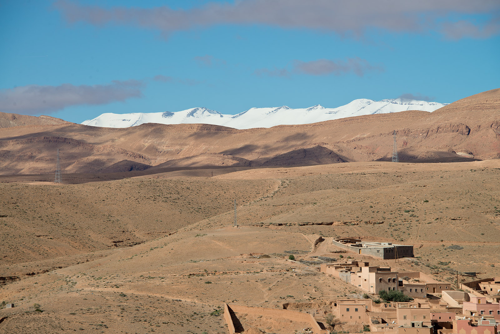 アトラス山脈を見ながらカスバ街道を進む。カスバ街道は、アトラス山脈南部の砂漠地帯の、ワルザザードからダデスの谷を通りティネリールを経てエルラシディアを結ぶ道。