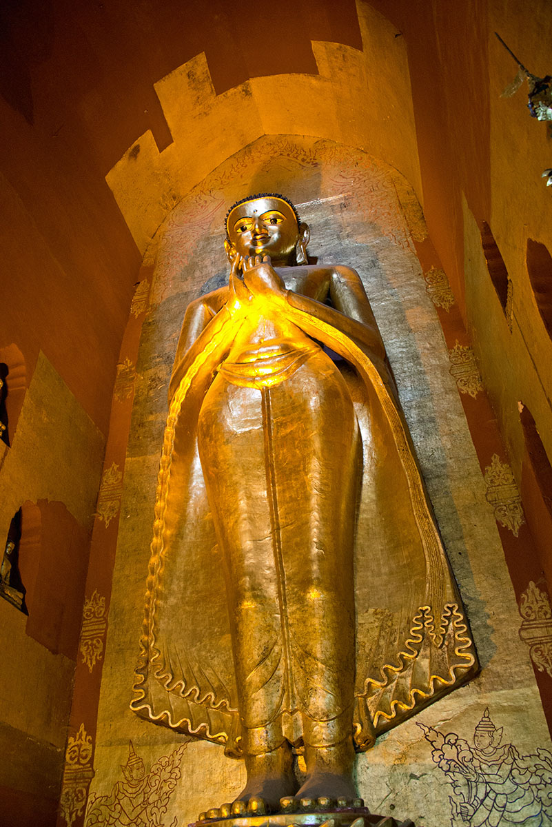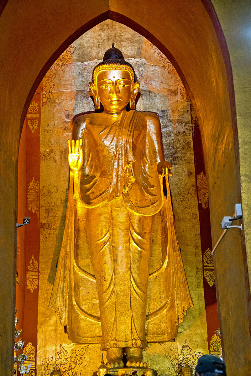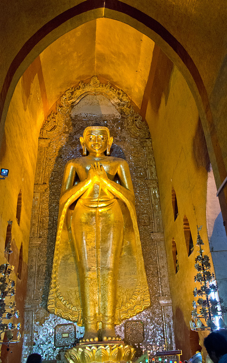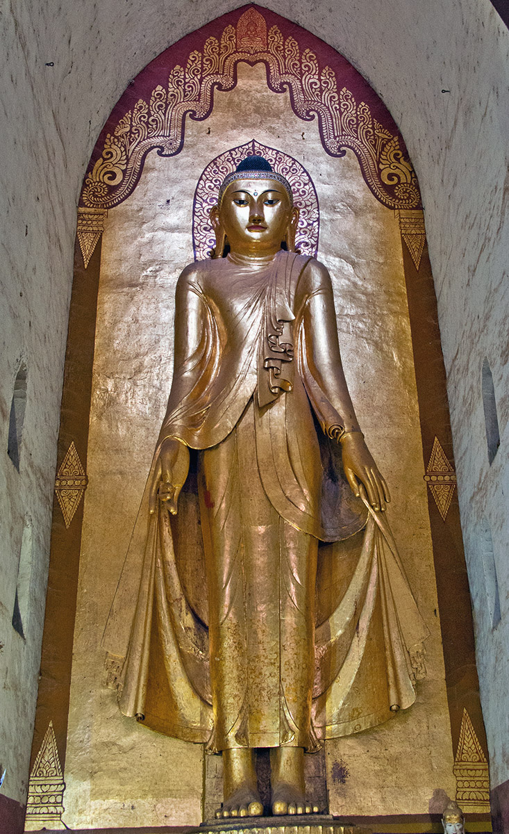 アーナンダ寺院は、バガン遺跡を代表する最大の寺院遺跡である。上座部仏教(小乗仏教)を導入し、ミャンマー族最初の統一国家を築いたバガン朝の第3代の王チャンスィッターによって、11世紀末〜12世紀初頭に建設された。高さ50m、面積63m四方の白亜の寺院の内部には、4つの仏像が東西南北に向いて整然と安置され、釈迦(仏陀)の生涯を描いた80点の浮き彫りがある。アーナンダーは釈迦の一番弟子の名前である。