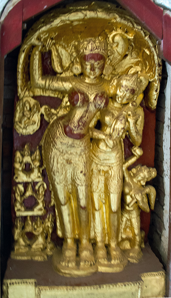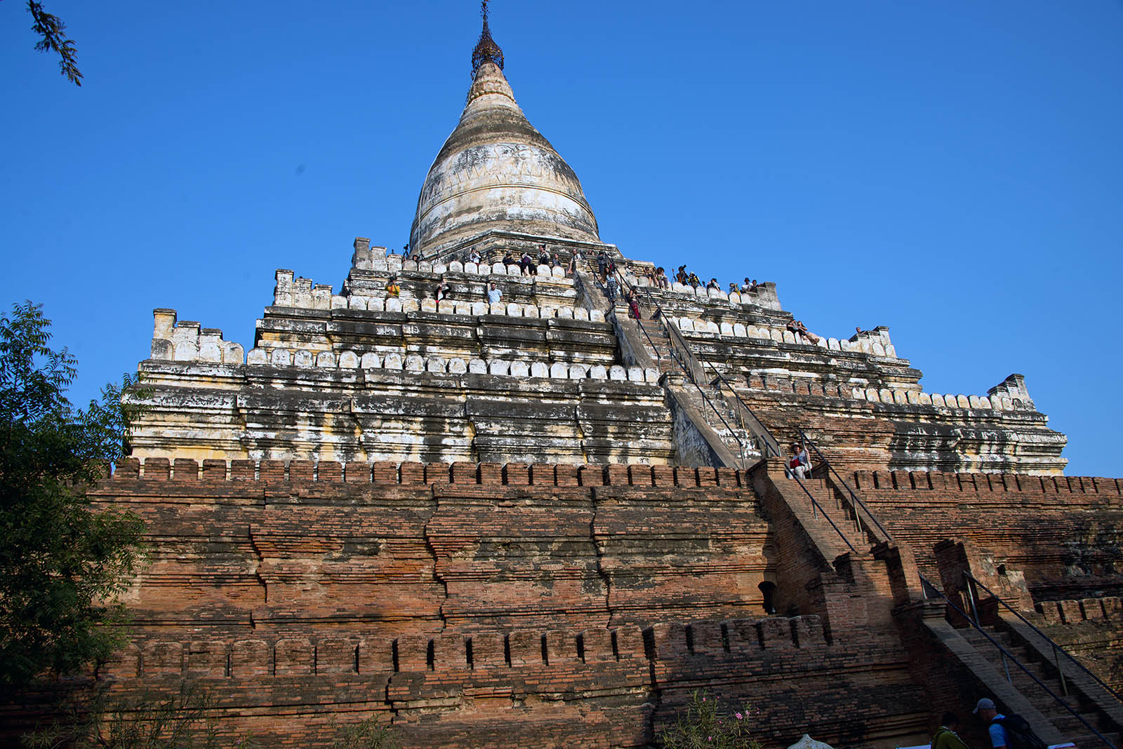シュエサンドーパゴダは、アノーヤター王がモン人の国タトゥンを征服した直後に建てたパゴダです(1057年)。モン人が所有していた釈迦の遺髪もタトゥンから持ち出され、このパゴダのなかに納められたそうです。5層構造で、登れるパゴダとして最も有名で、急な階段には手すりがついており、何とか登れる。そして、上層は夕陽鑑賞の絶好のポイントとなっている。