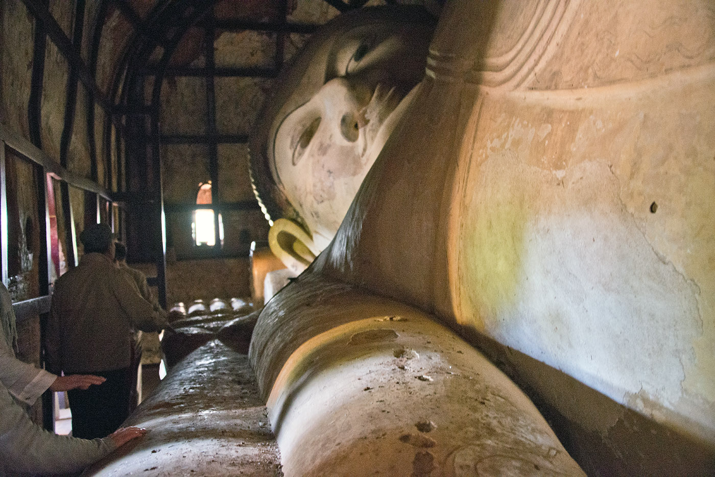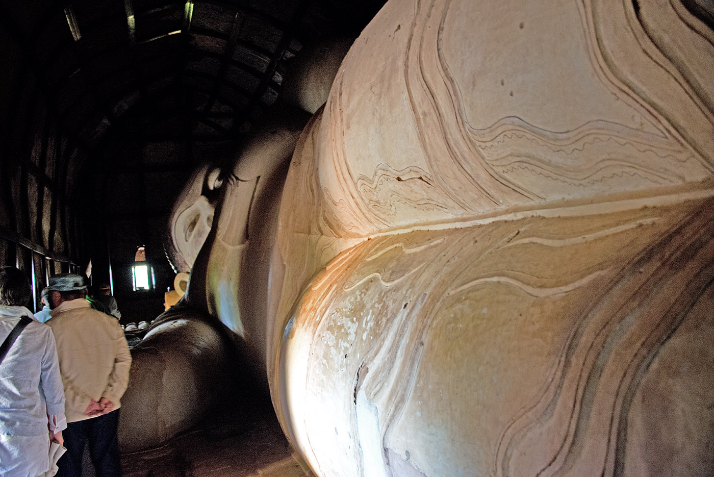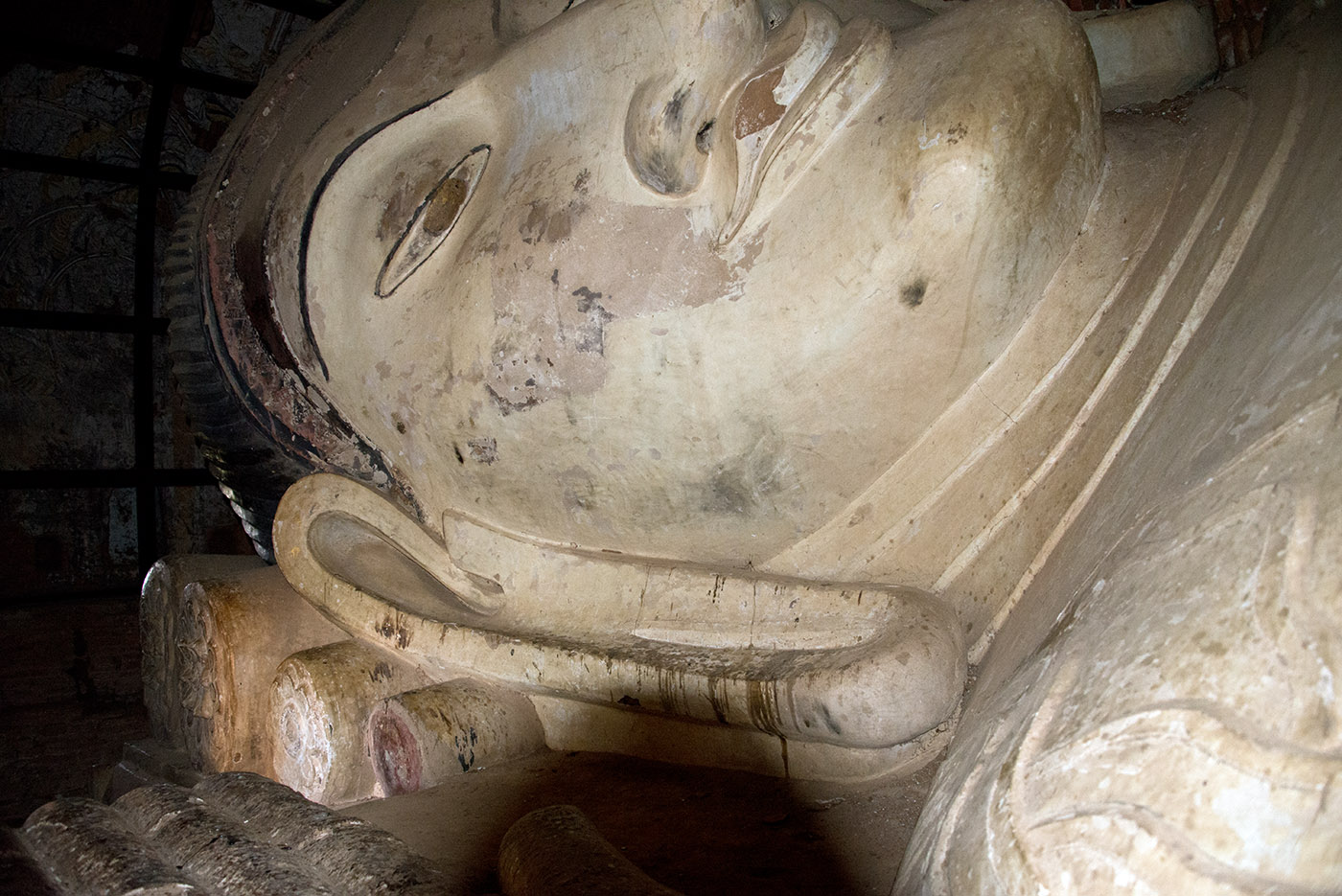 シュエサンドー・パゴダの敷地にある倉庫のような建物の中の暗い空間に18mの涅槃仏が穏やか横たわっている。11世紀の建造であり、涅槃仏は通常は北枕であるが、これは南枕である。