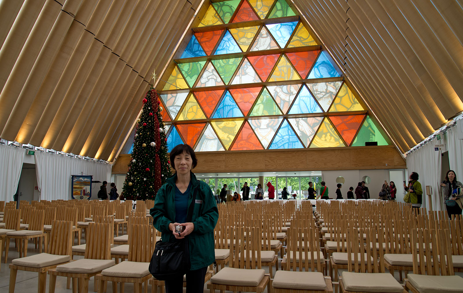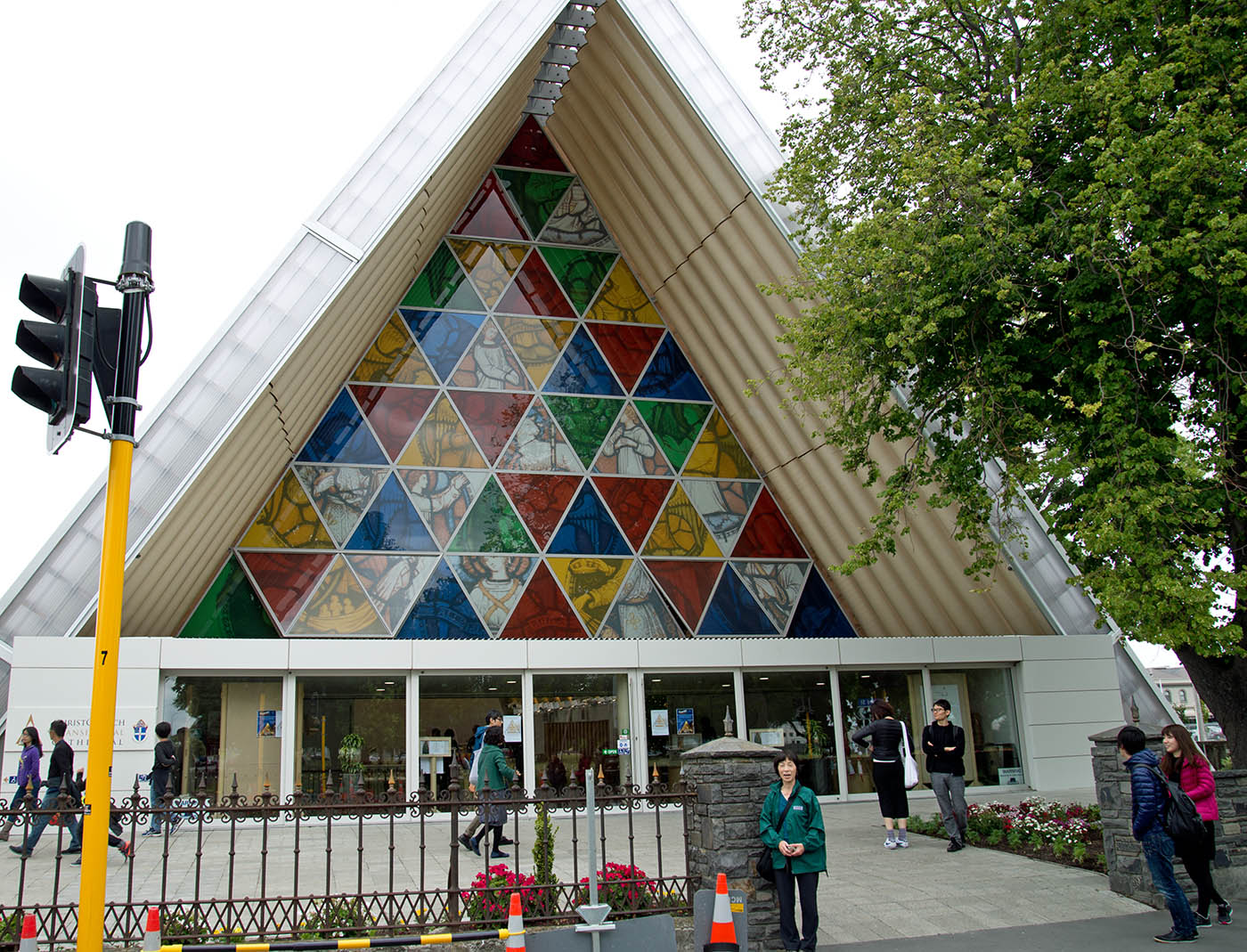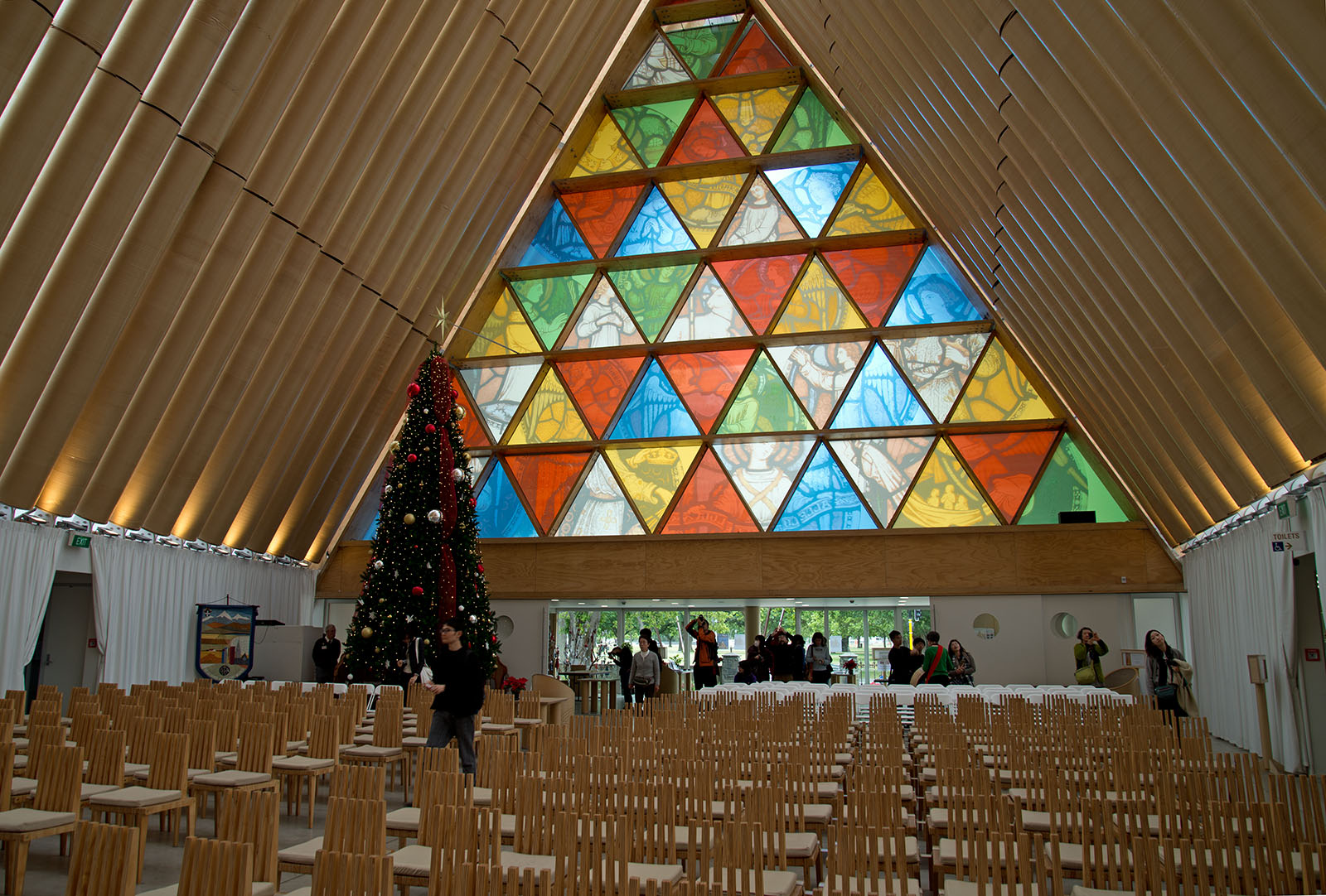 2011年2月22日にニュージーランドで発生したマグニチュード6.3のカンタベリー地震。日本人を含む185名の命を奪ったこの地震で、クライストチャーチの中心部にあったゴシック様式の大聖堂も崩壊。尊い命とともに、街のシンボルもなくなってしまった。そのクライストチャーチ大聖堂に代わる臨時の聖堂が2013年に完成した。サランラップの芯の様なボール紙でできた「紙の聖堂」を無償で設計したのが、世界的な建築家・坂茂(ばん しげる)氏である。この坂氏は、 紙を資材として使い建築の可能性を広げて見せただけでなく、世界中の被災地に飛び支援することでも有名な建築家。この「紙の聖堂」では、防水処理を施された長さ20m直径600ミリの不燃性の紙管が90本以上使用された。基礎にコンクリートを流し込んだ後、オリジナルの大聖堂の平面と立面のジオメトリーを受け継ぐように、紙管の角度を調節したという。耐久年数は約50年だが、紙管を雨や日光から保護する為に屋根や外壁にポリカーボネート製の板がその上に張られている。ニュージーランド産の紙管や建材を使用した事で建設時間を短縮するだけでなく、建物を訪れる人々のスピリットも持ち上げている。