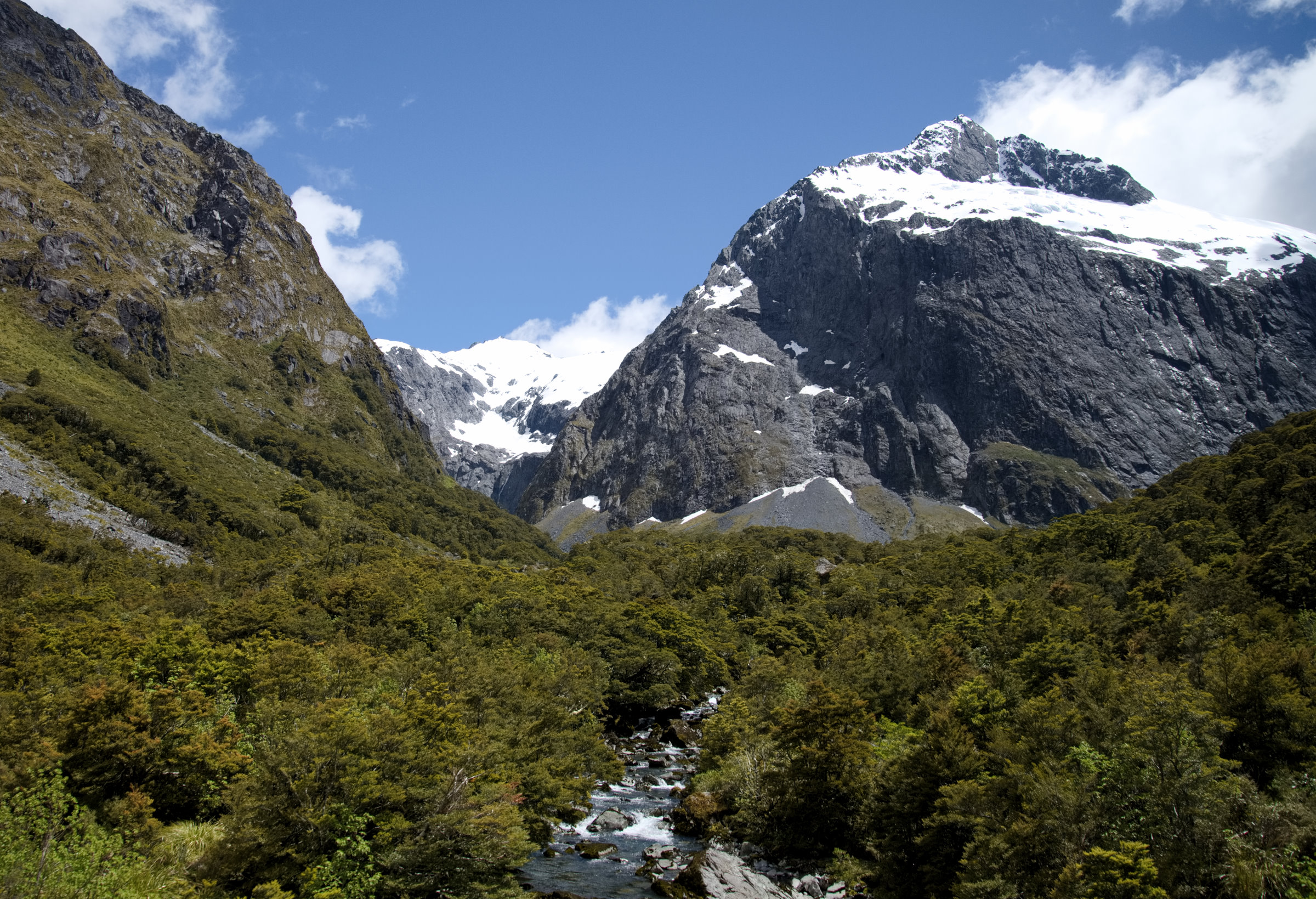 正面の三角の山がマイターピーク、右がライオン岩、岩の左奥がスターリング滝、右奥の雪山がペンブローブ山