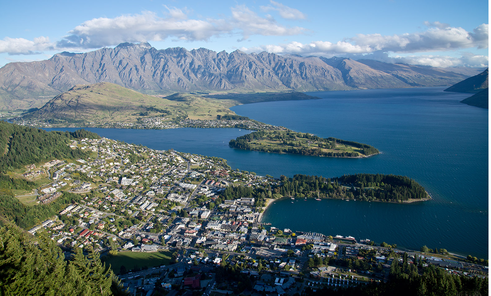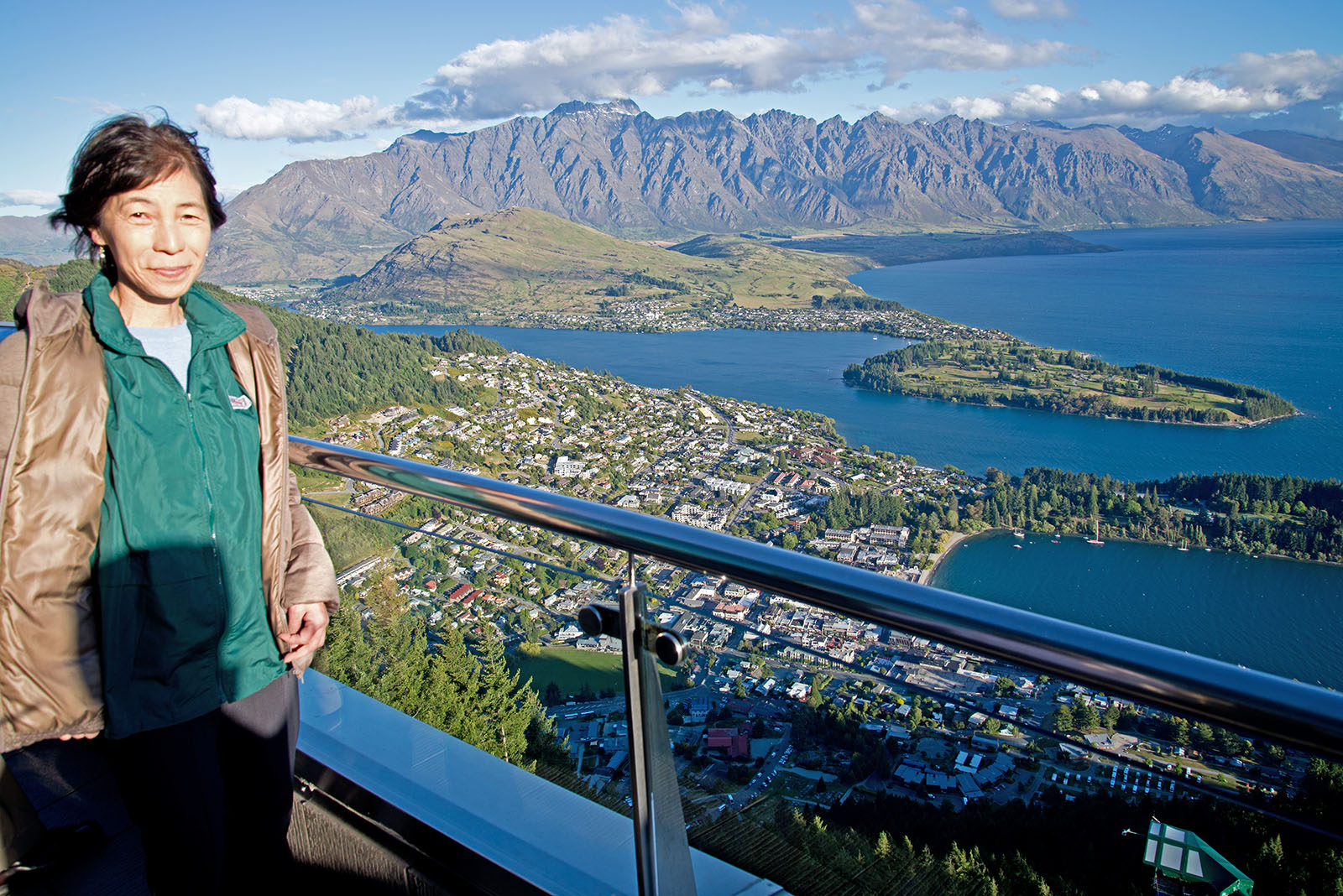 スカイラインゴンドラ展望台からクイーンズタウンの街、ワカティプ湖、南アルプス