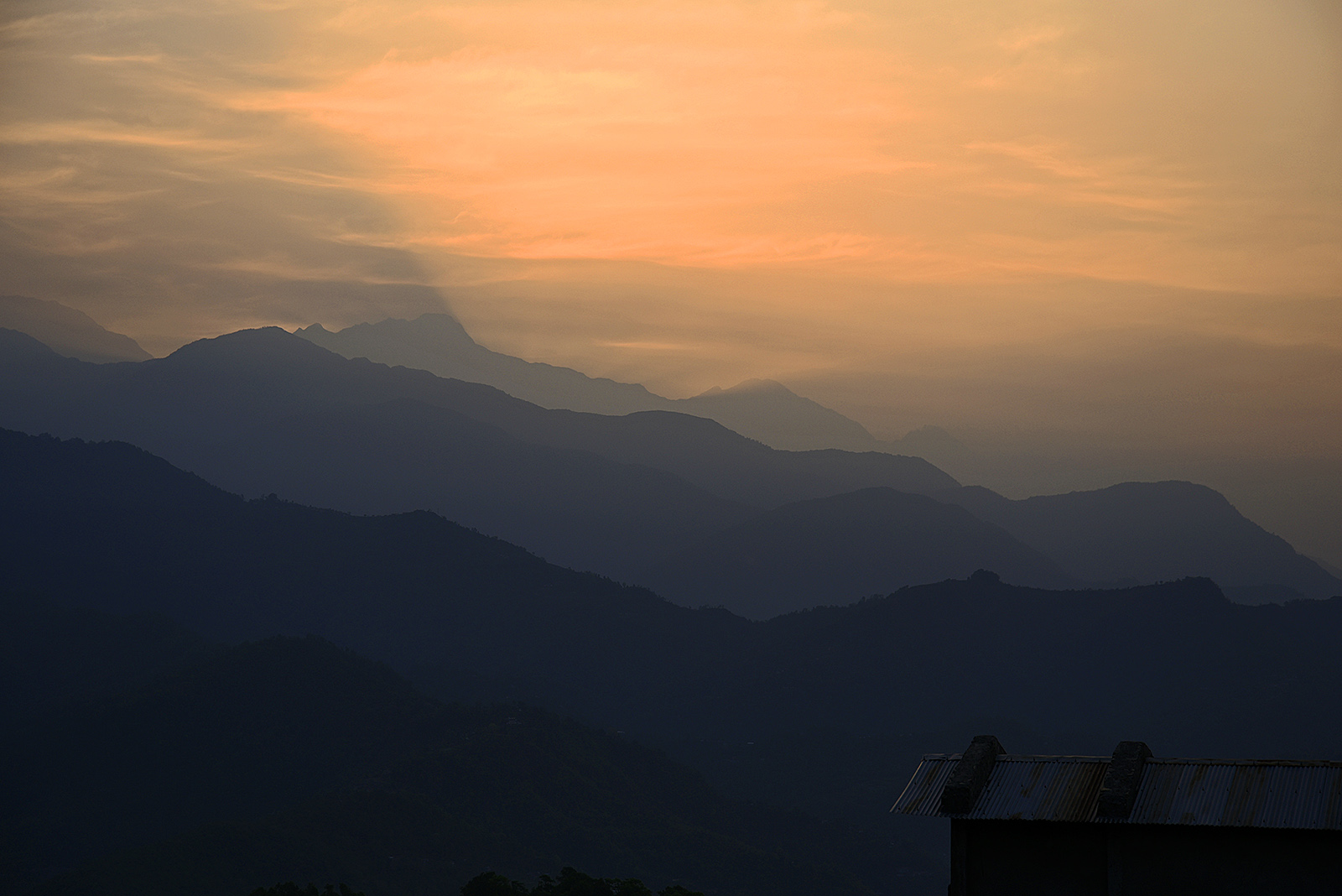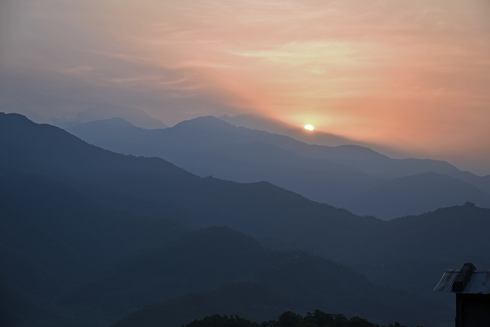 朝4時に起きて、暗い中をマイクロバスで山道を登り、日の出を見る。ヒマラヤフロントホテルはポカラの町からサランコットの丘に登る途中にある。