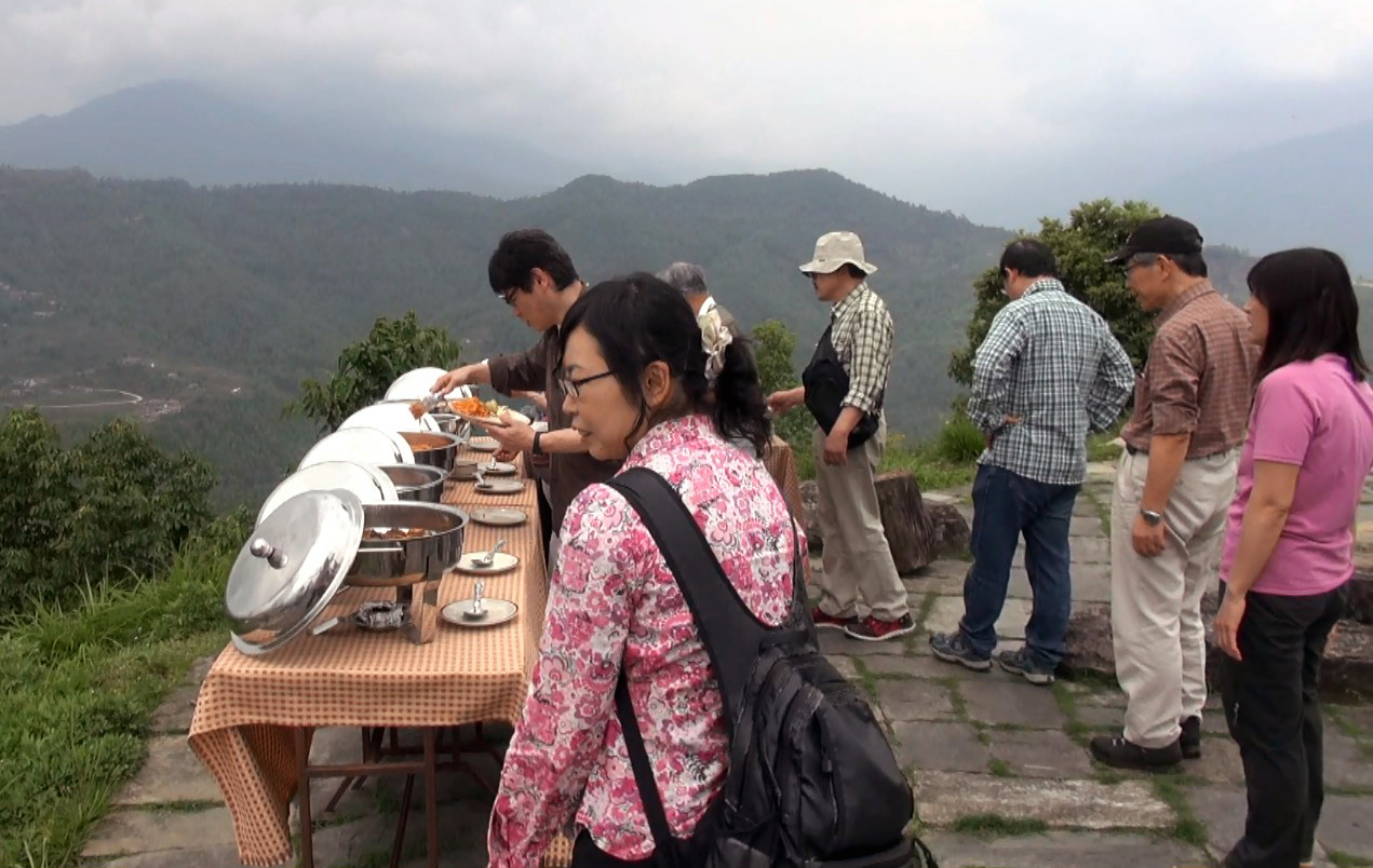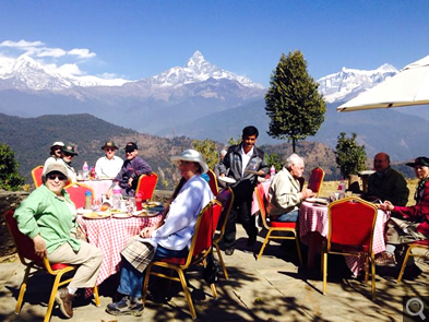 屋外にテーブルを並べてランチ 残念ながらアンナプルナの峰は雲の中。