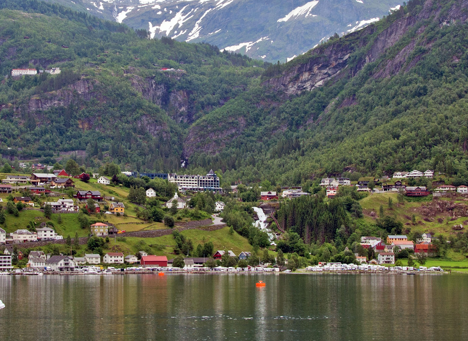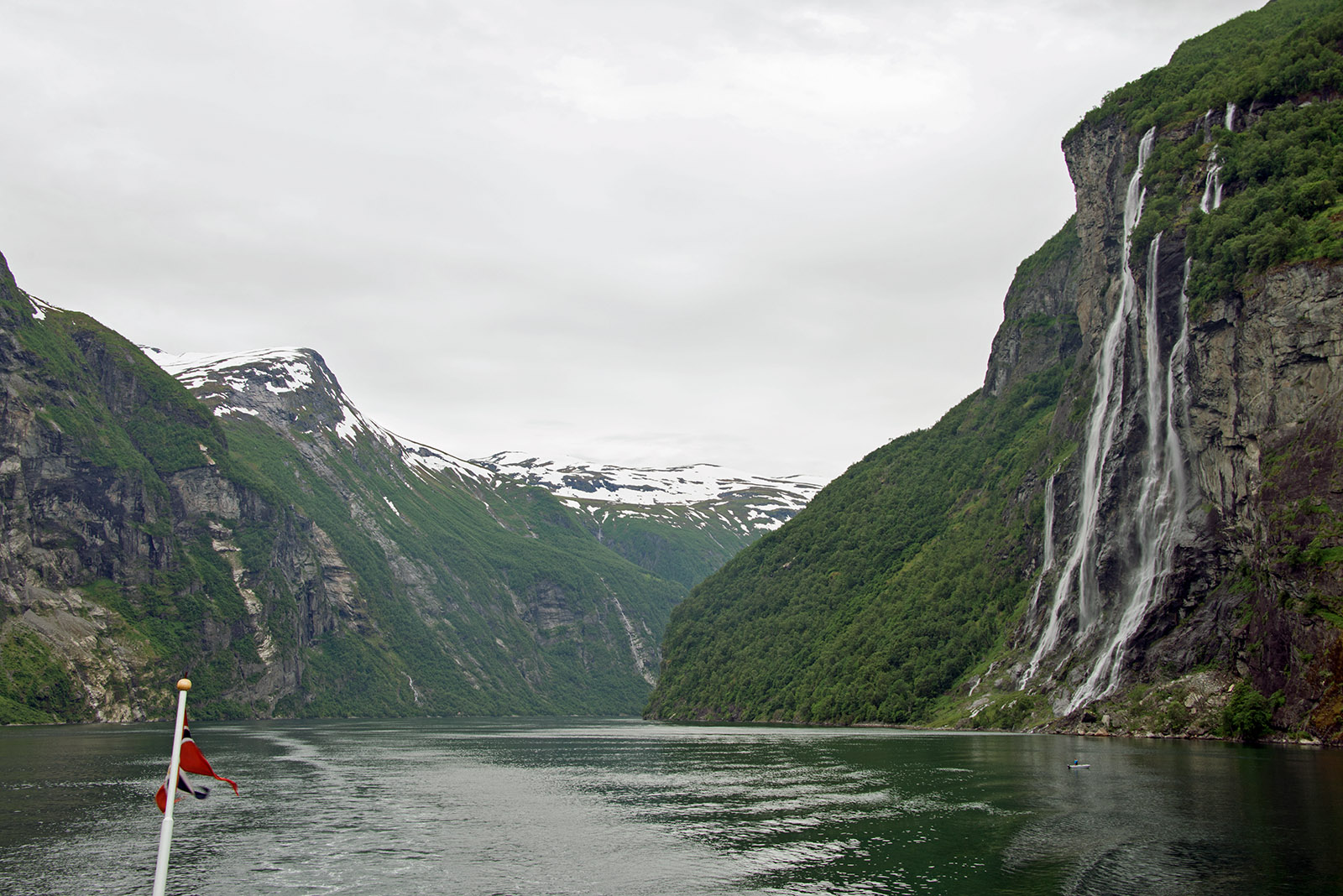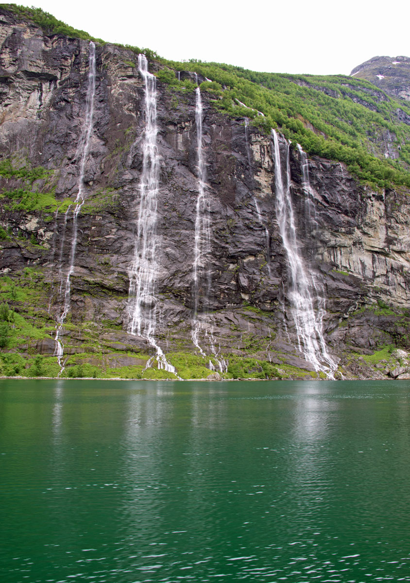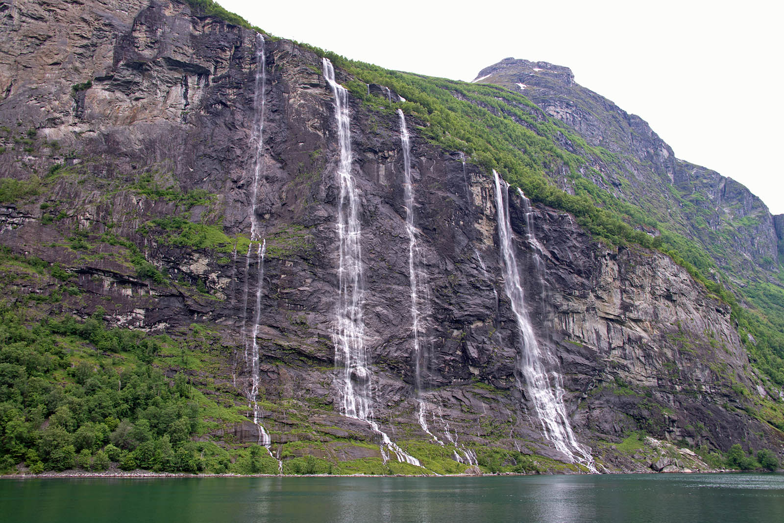 ガイランゲル~ヘルシルト間のクルーズは、フェリーで約1時間の旅です。山頂に氷河を抱く山々や、標高1200~1500mの切り立った断崖絶壁が両側に迫る。断崖絶壁の岩肌を流れ落ちるのは、繊細な流れの「花嫁のベール」あるいは「七人姉妹」と呼ばれる7筋の滝、酒瓶の形のような「求婚者の滝」など数々の滝がある。