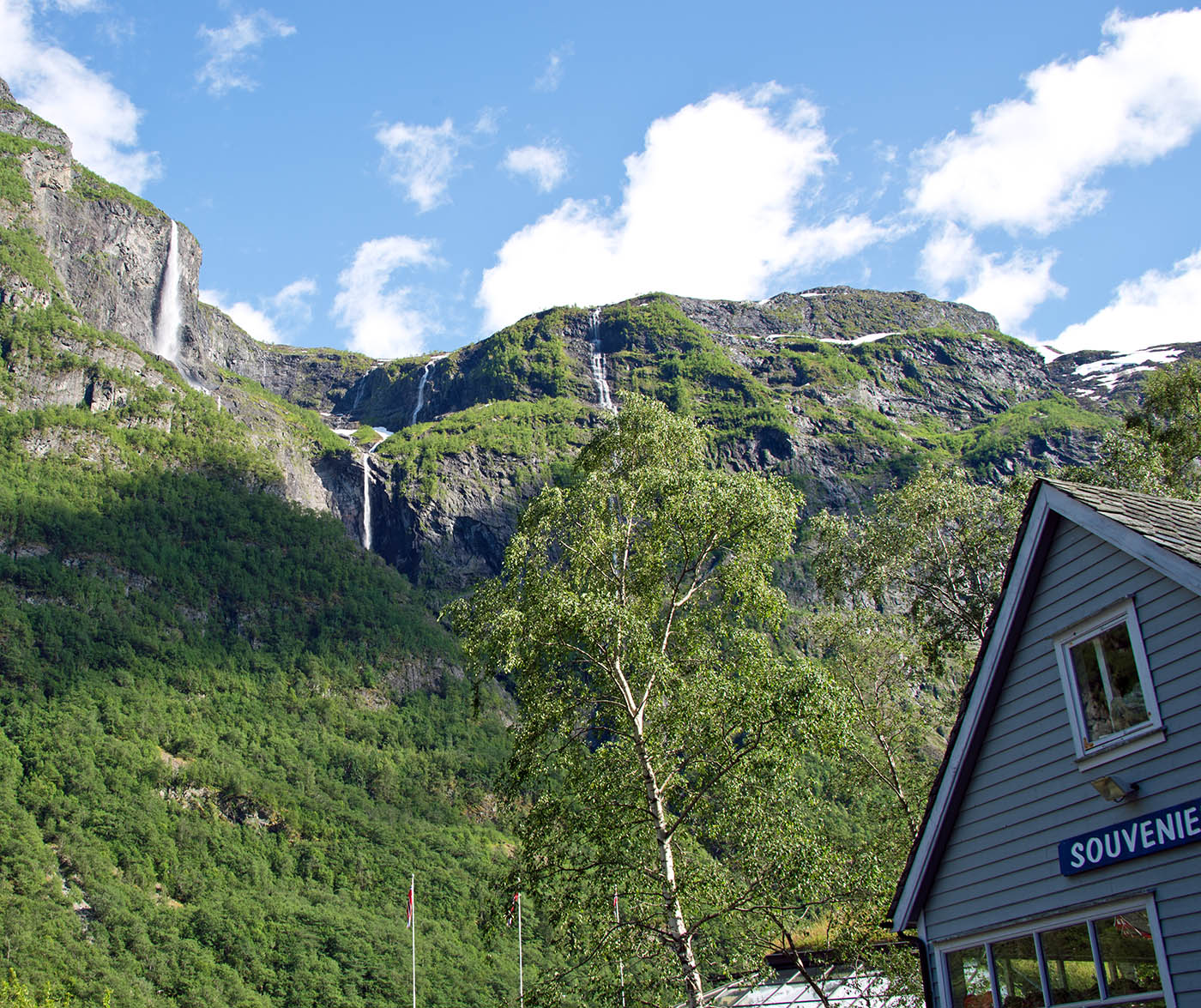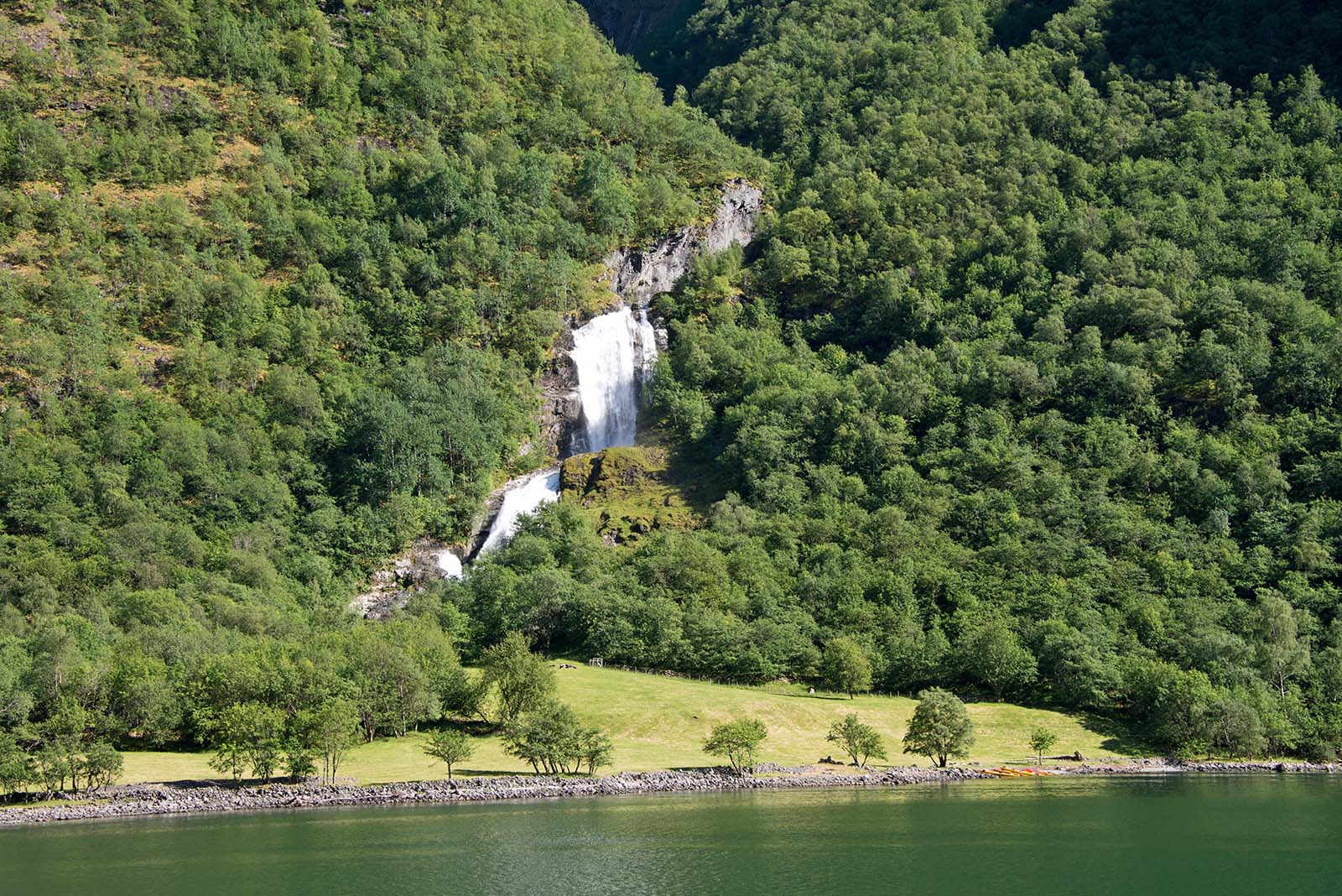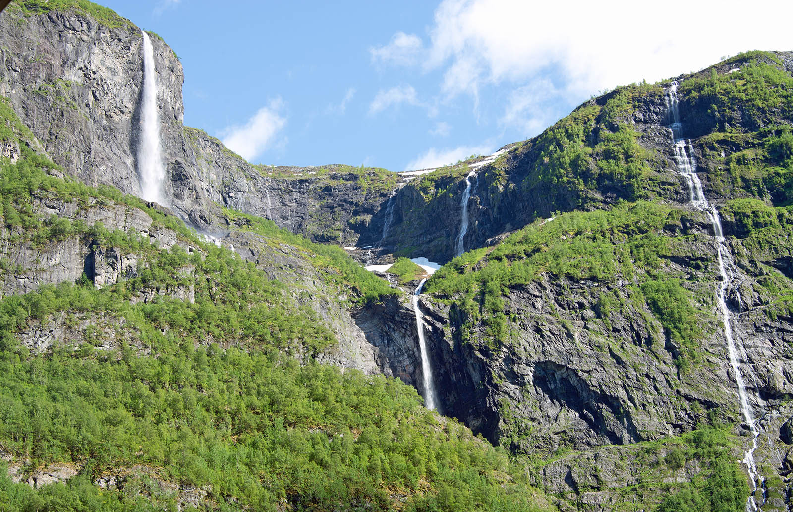 列車からフィヨールドを鑑賞 山頂から滝が流れちている。