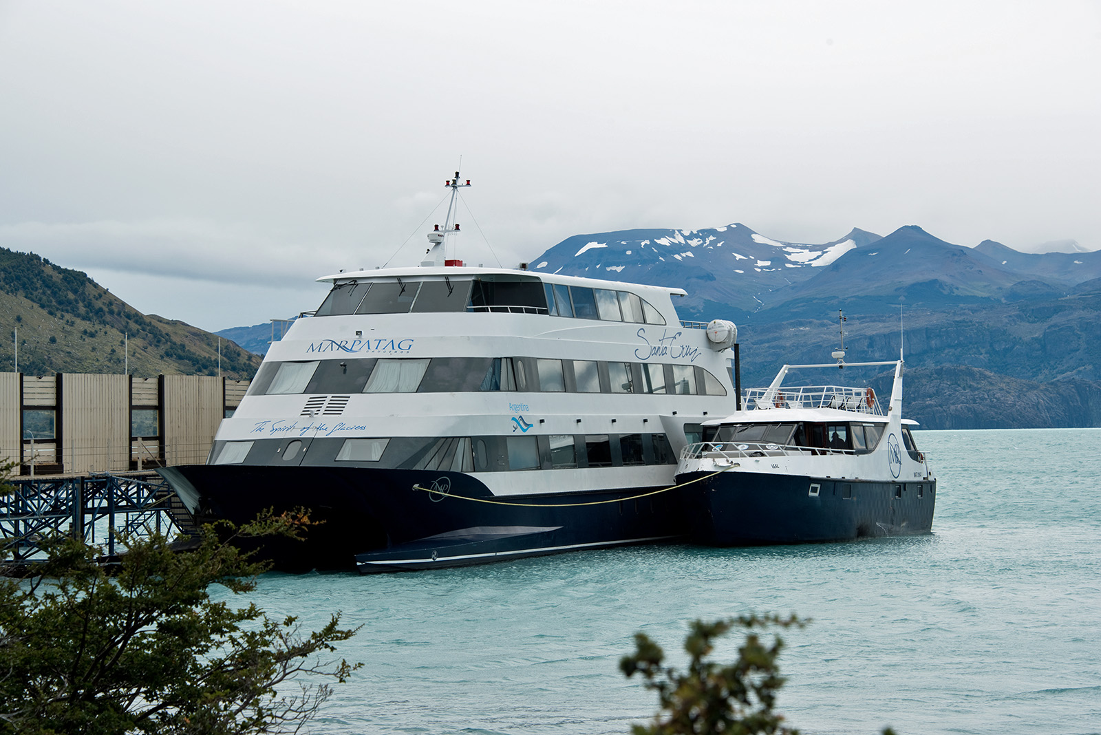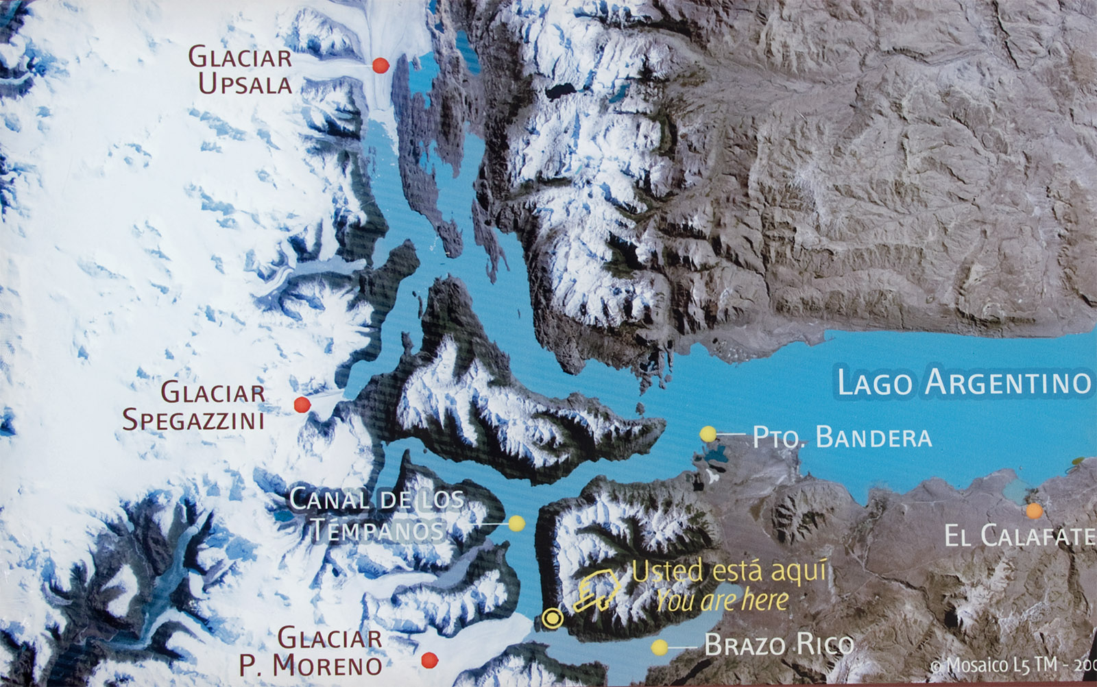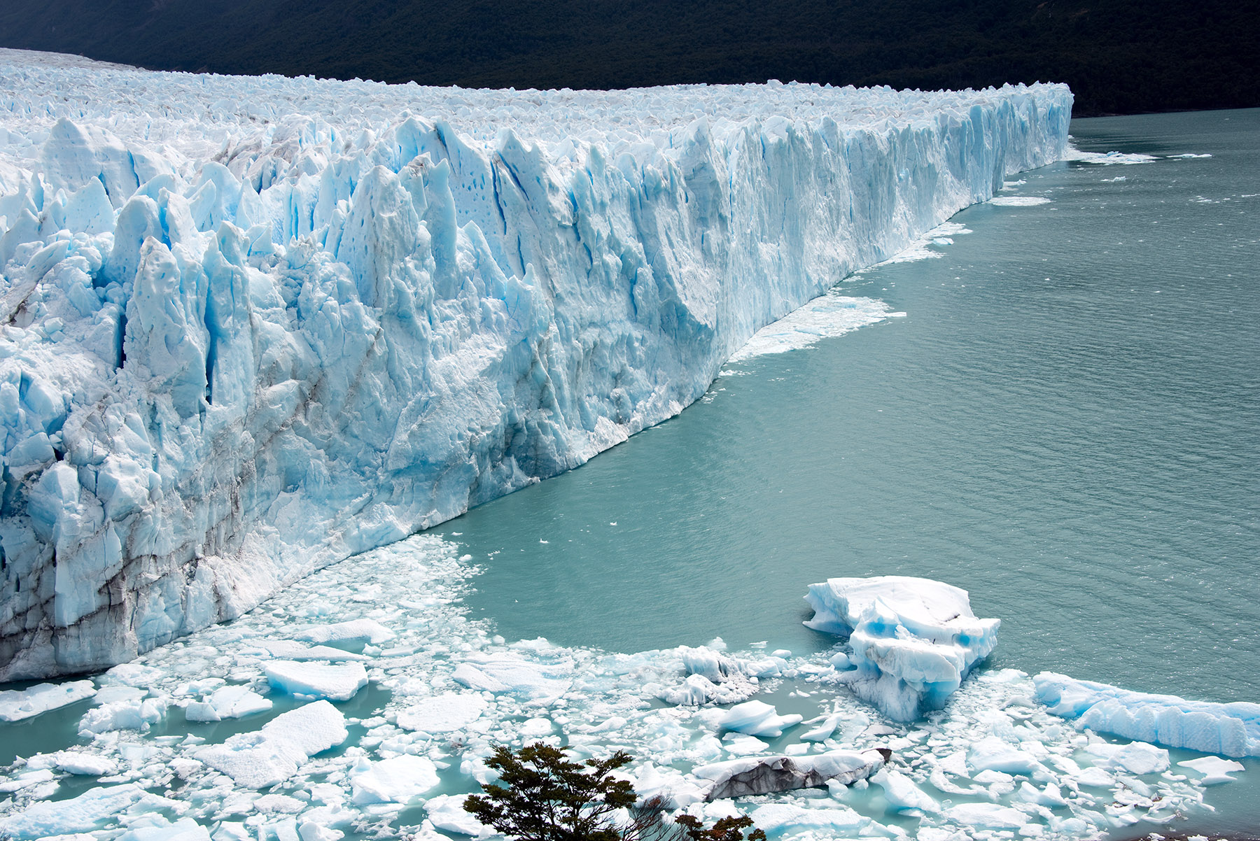 ペリト•モレノ氷河 北側 左端では氷河が陸に乗り上げ、ダムになっており、左側のブラゾ水路の水位が高くなっている。