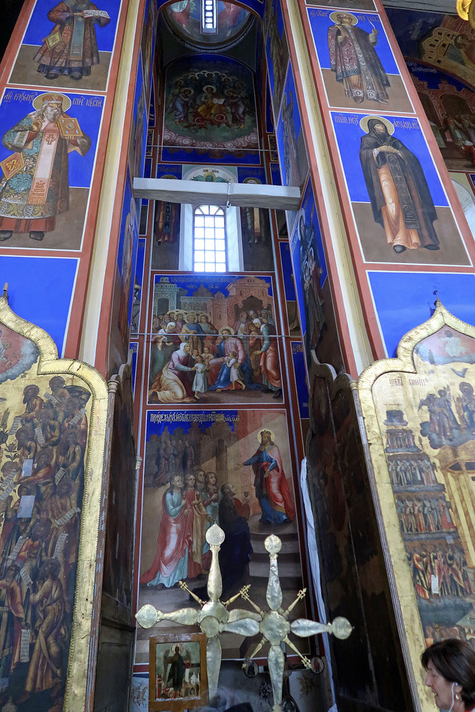 聖堂内のフレスコ画(青色が輝く)と十字架