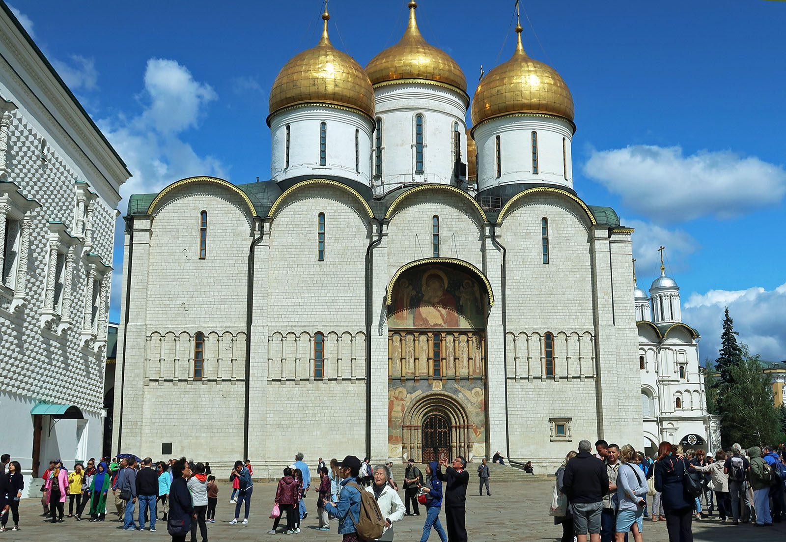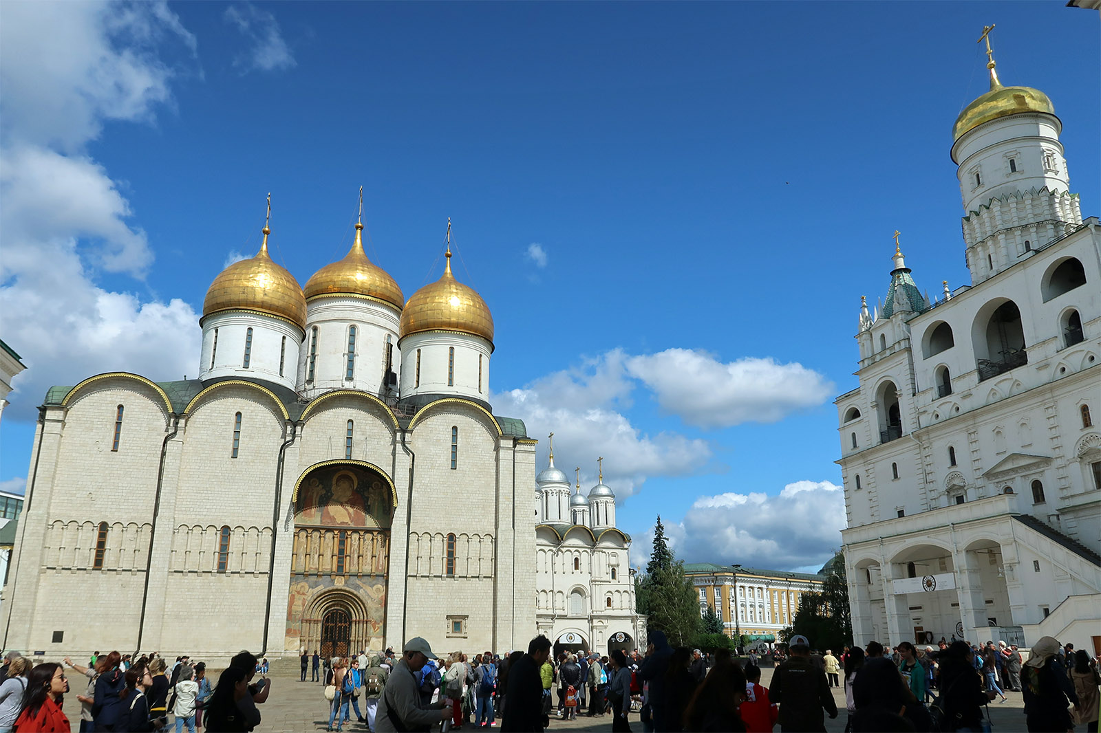中央:イワン大帝の鐘楼, 左:アルハンゲルスキー聖堂, 右:ウスペンスキー大聖堂