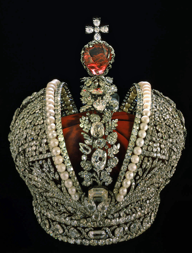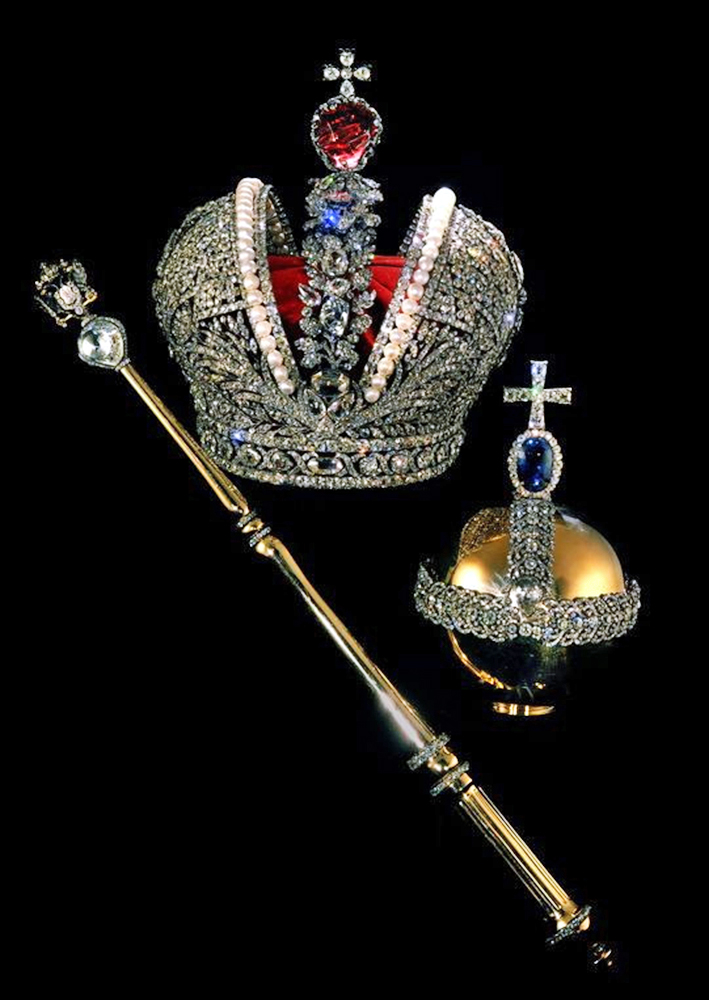 注目は189カラットのダイヤモンド「オルロフ」であり、これは、持ち主を次々に変死させるという悪名が高い。 多くの持ち主を経て、最終的にエカテリーナ2世の愛人であったロシア貴族オルロフがアムステルダムの市場で45万ドルで落札し、エカテリーナ2世に献上し寵愛を得ました。しかし、オルロフはエカテリーナに捨てられ、破産し発狂死しました。