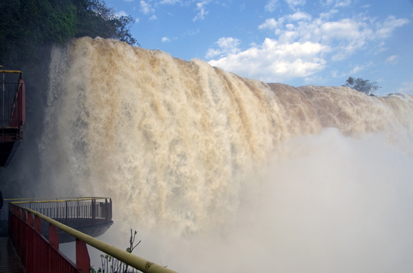 手前の遊歩道からの見物,延々と続く滝壺と目前に迫力ある流れを体感.あちこちに虹が見える. ブラジル側では水しぶきが霞となって,滝がぼんやりと霞む.