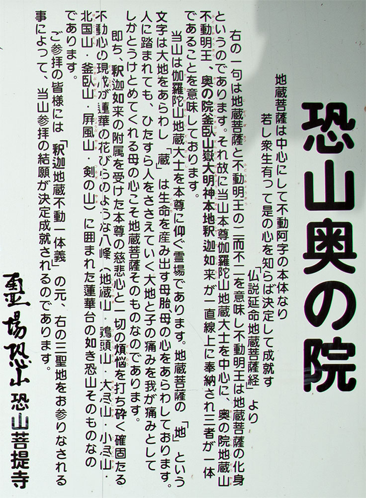 貞観4年(西暦862年)、平安時代の天台宗の高僧、慈覚大師円仁が、一羽の鵜に導かれてこの地にいたり、地蔵尊を祀ったのが始まりと伝えられ、三大霊場の一つに数えられている。この地は宇曽利湖を中心に釜臥山、大尽山、小尽山、北国山、屏風山、剣の山、地蔵山、鶏頭山、の八峰が巡り、八葉の蓮華のたとえられている。宇曽利カルデラにあるため、各所に噴気活動や温泉の湧出がみられ、その一帯は地獄に、一方で穏やかな湖の白砂の浜は極楽になぞらえられている。千年にわたり、「人は死ねばお山に行く」という素朴な信仰と祈りを伝えており、東北地方のみでなく日本全国の人々に信仰されている。