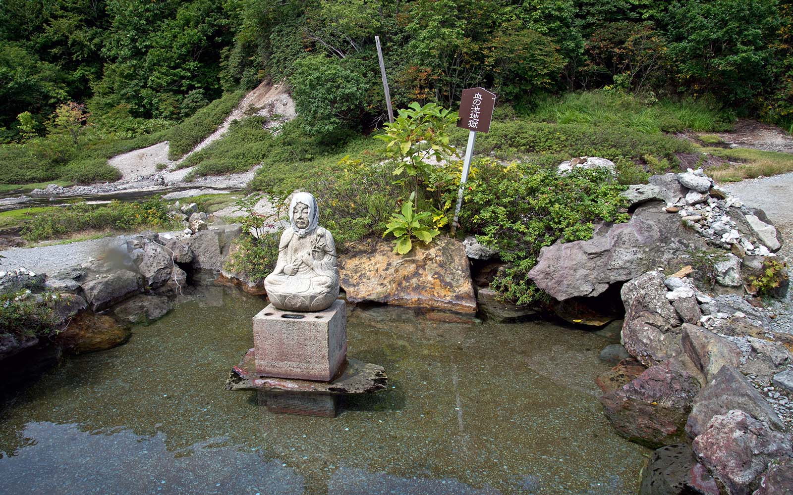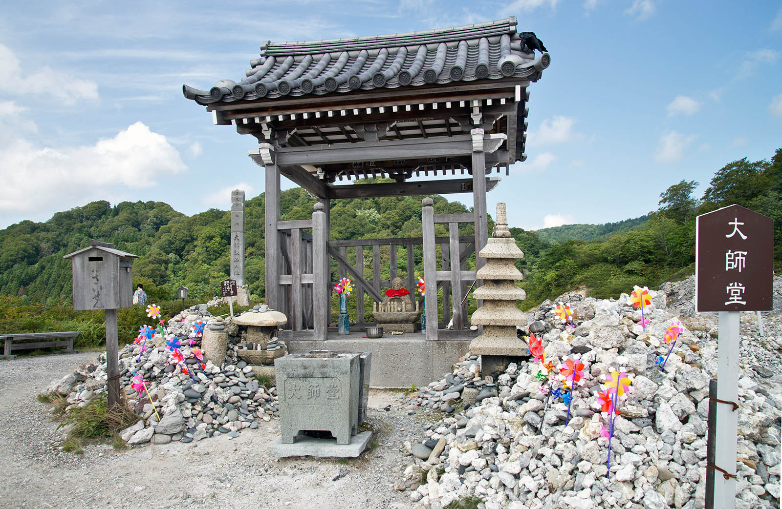 山門をくぐると常夜灯が並ぶ参道の正面に本尊地蔵尊が安置される地蔵堂があり、ここが死者の魂が集まるところと伝えられ、イタコの口寄せで知られる恐山菩提寺の境内である。左の小屋は恐山温泉の冷抜の湯である。 境内には四つの温泉が共同浴場として利用されている。いずれも白濁した硫化水素含酸性緑ばん泉で、冷抜の湯(ひえのゆ)は神経痛、リウマチなどに古滝の湯(こたきのゆ)は胃腸病などに、花染の湯(はなぞめのゆ)は吹き出物、切傷などに薬師の湯(やくしのゆ)は眼病などに、それぞれ効能があるといわれている。