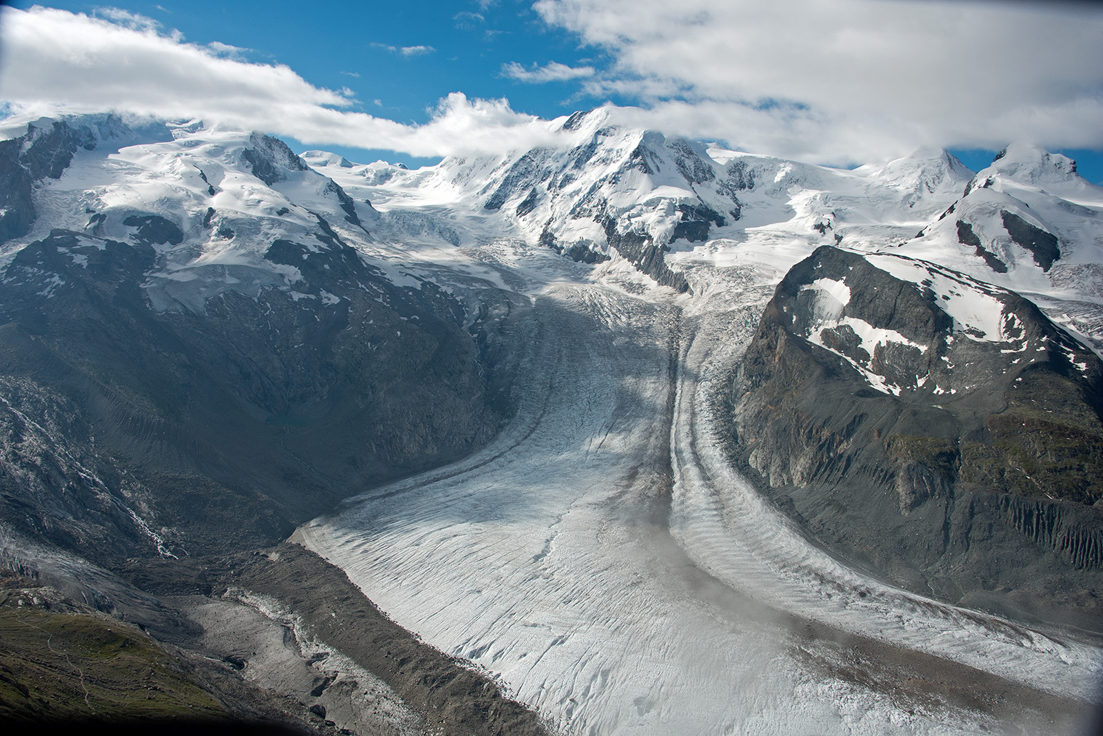 左:ストックホルン(3532m),右:モンテローザ,間を流れるゴルナー氷河