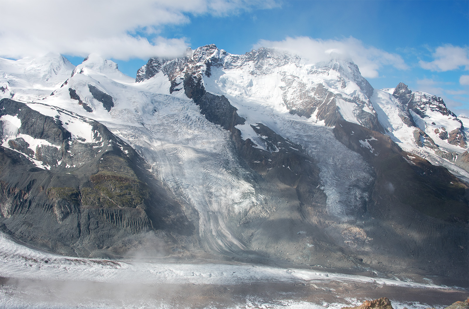 左:モンテローザ(4634m),右:リスカム(4527m),間を流れるグレンツ氷河
