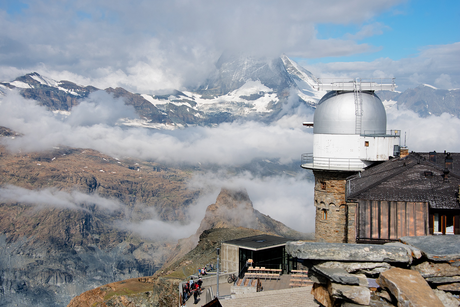 天文台のドームの先にマッタホルン (だいぶ雲がかかってきた)