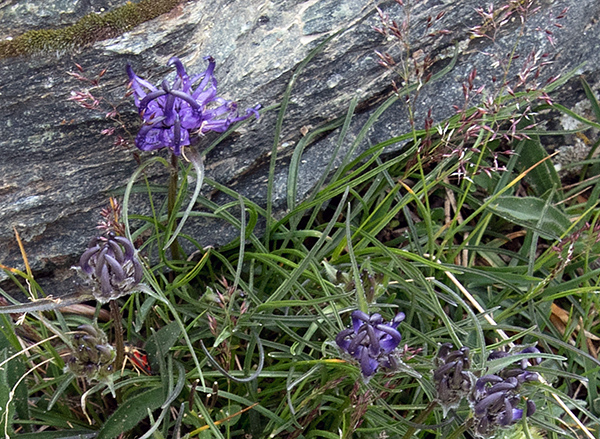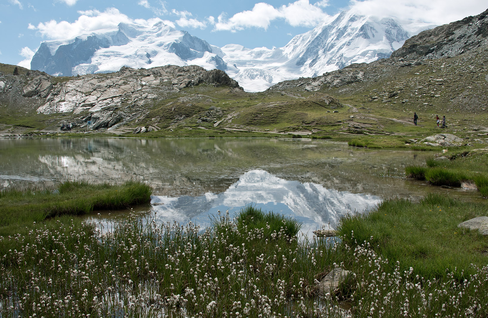 ローテンボーデンで登山電車を下車し、リフェル湖で水面に映るマッタホルンなど峰峰を眺め、高山の花花を楽しみながら、リッフェルべルグ駅まで下る。(約1時間30分の緩やかな下り)一面に咲いている花を踏まないように注意して歩く。アルパイン・マーモットの生息地を下るが、出会うことはなかった。