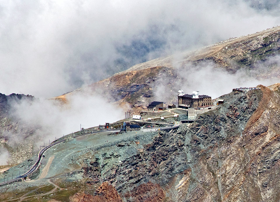 登山電車の駅、ホテル、天文台のドーム、展望台が見える。(クラインマッタホルンから)