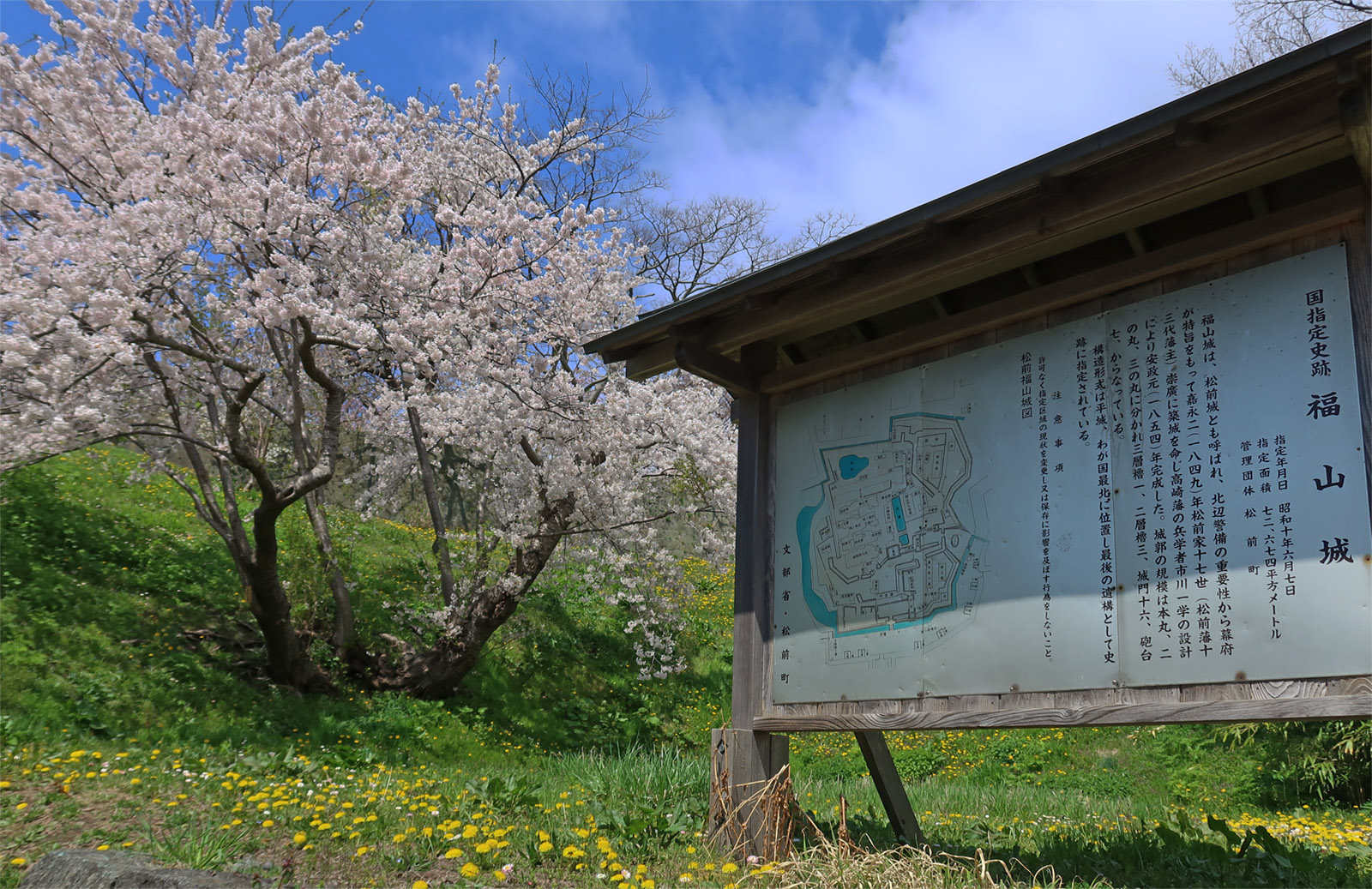 東北地方北部から北海道南部(蝦夷地)を支配していた安東氏から独立して統治者となった蠣崎(かきざき)氏(のちの松前氏)は当初、同町内神明にあった大館に居館を構えていた。1600年(慶長5)に松前慶広(よしひろ)が新たに福山に福山館と呼ばれる新しい陣屋を設け、蝦夷地支配の拠点とした。これがのちの松前城である。その後江戸時代末まで松前藩主松前氏の居城、藩の政庁となった。現在の城郭は1849年(嘉永2)に、幕府から北辺警固を命じられた当時の藩主松前崇広(たかひろ)が、外国の艦船の海上からの攻撃を想定して福山館を大改修して築いたもので、日本における最後期の旧式城郭である。戊辰戦争末の箱館戦争の際には、榎本武揚率いる旧幕府軍の攻撃を受け落城した。その時焼失した天守は1949年(昭和24)に再建され、町のシンボル、桜の名所になっている。(https://kotobank.jp/word/松前城-180326)
